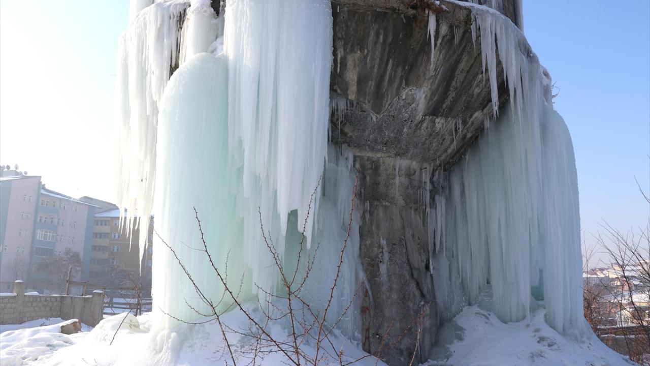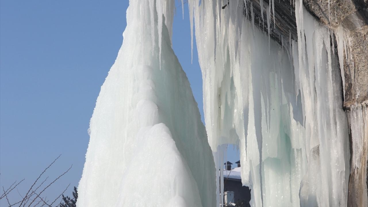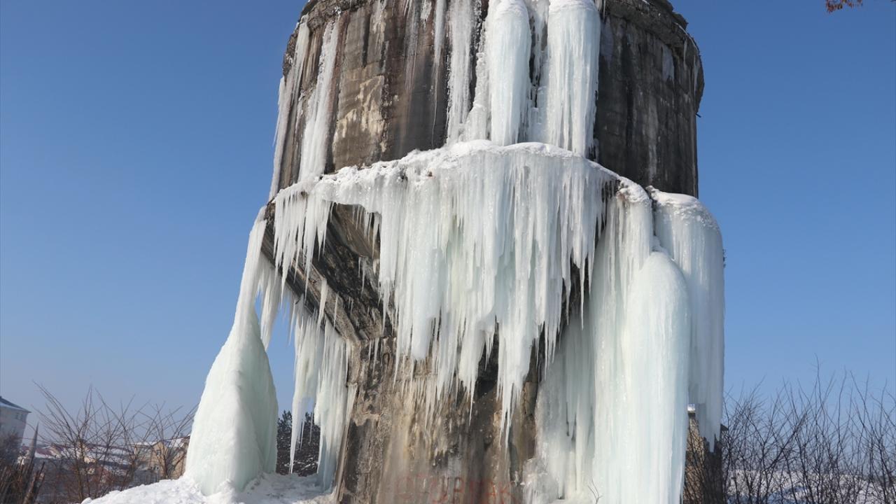 Mezarlıkta bulunan su deposu ve bina çatılarında metrelerce buz sarkıtları oluştu.