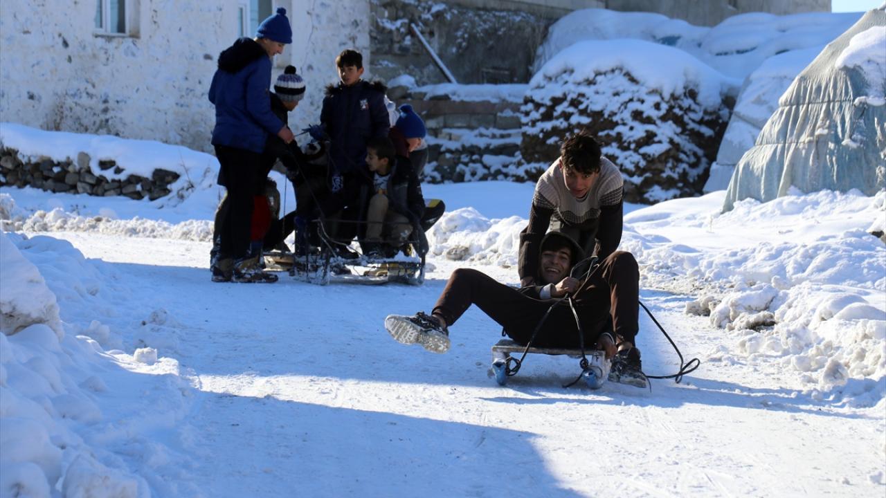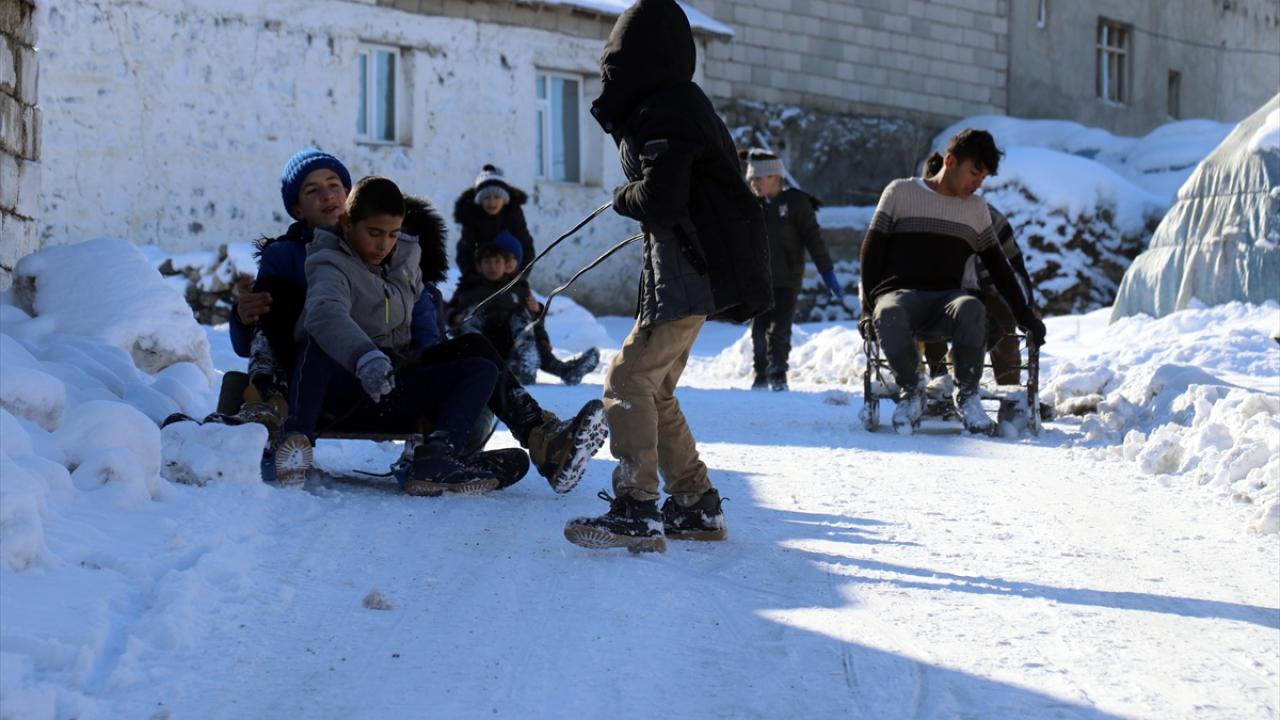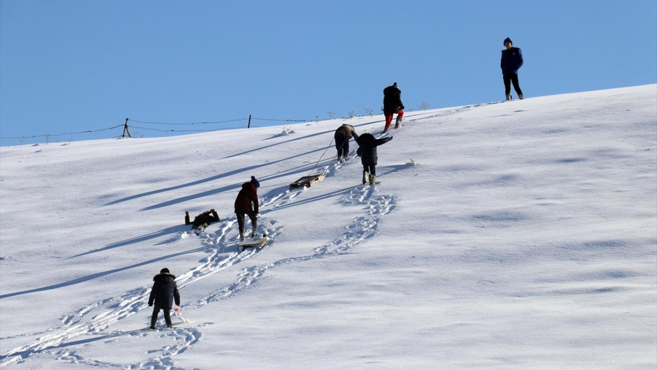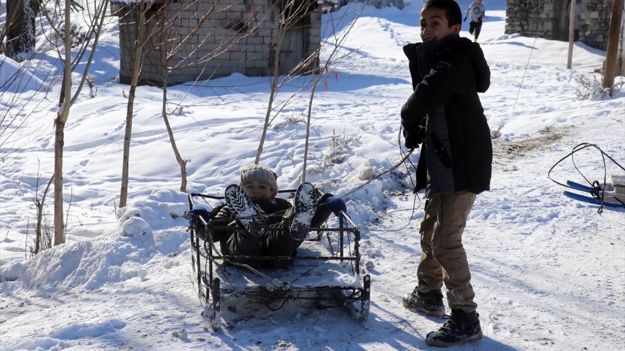 Tahta ve demirlerden yaptıkları kızakları alarak tepeye çıkan çocuklar, kayarak keyifli anlar yaşadı.