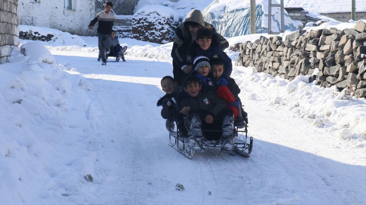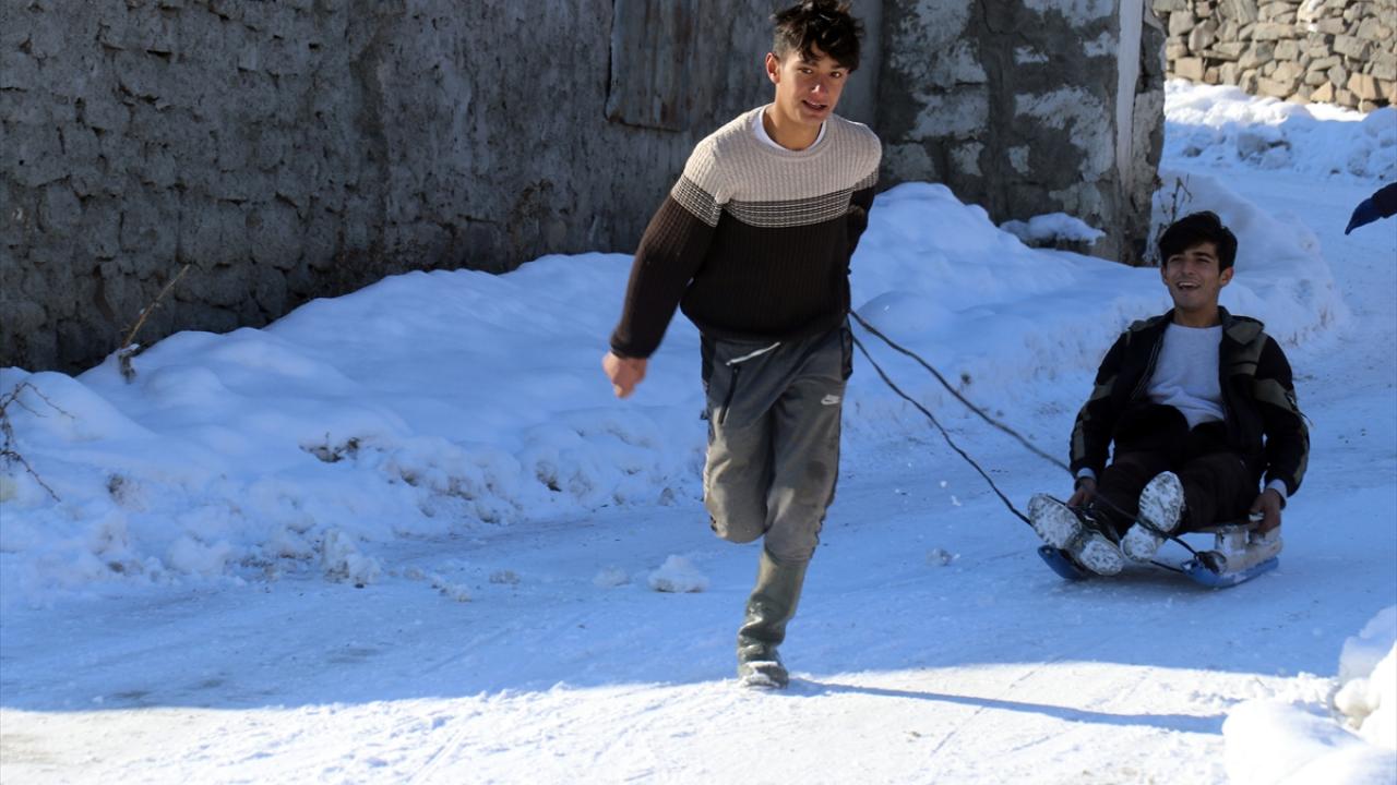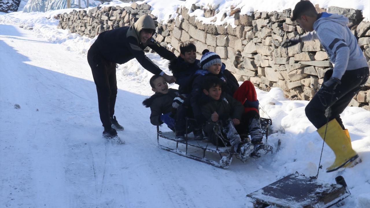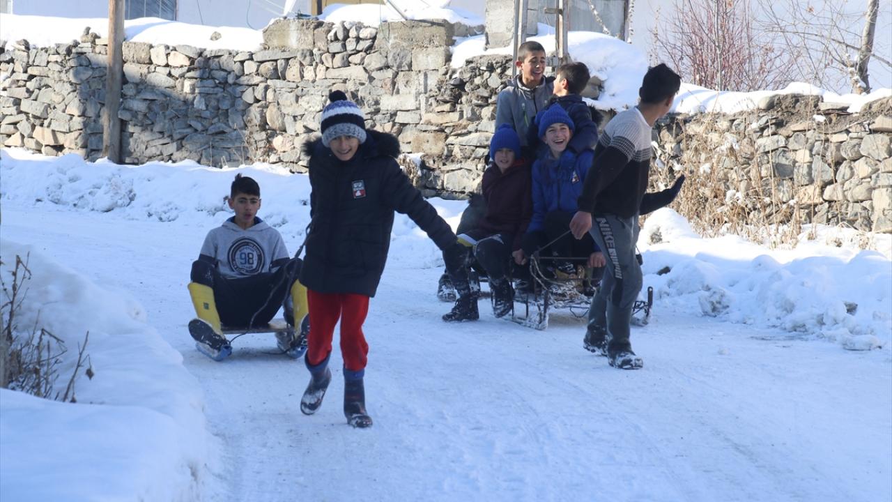 Tahta ve demirlerden yaptıkları kızakları alarak tepeye çıkan çocuklar, kayarak keyifli anlar yaşadı.
