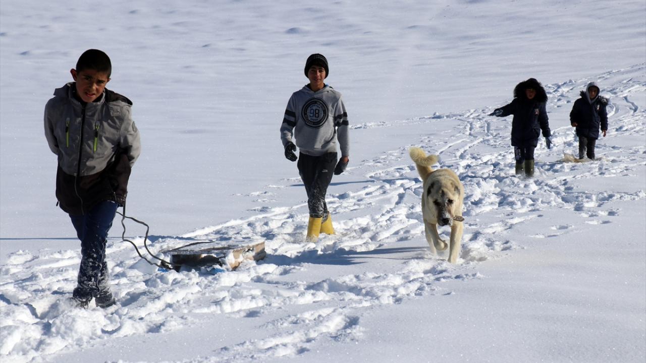 Zaman zaman toplu halde demir kızağa binen ve köpeklerini de yanlarına alan çocukların eğlenceli halleri, ortaya güzel görüntüler çıkardı.