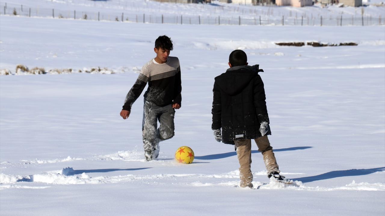 Çocuklar, kızak keyfinden sonra kar üstünde top oynayarak maç yaptı.