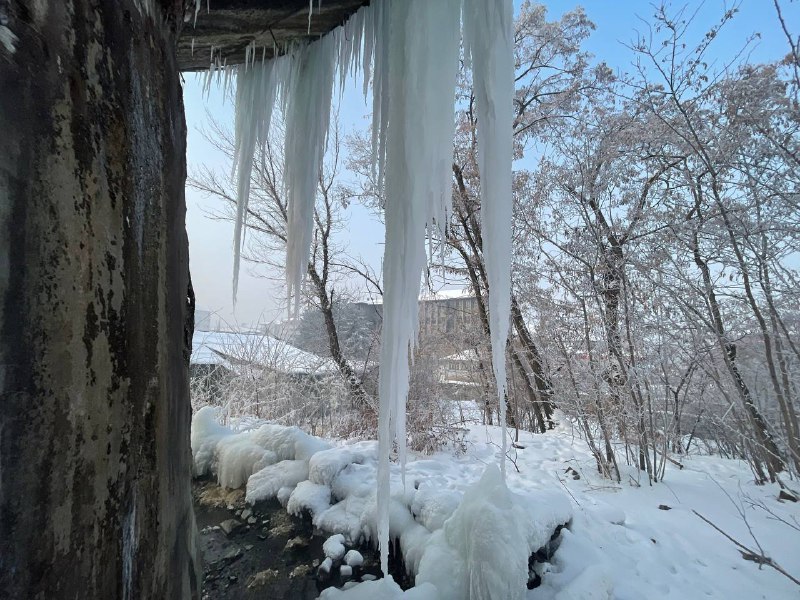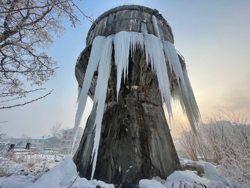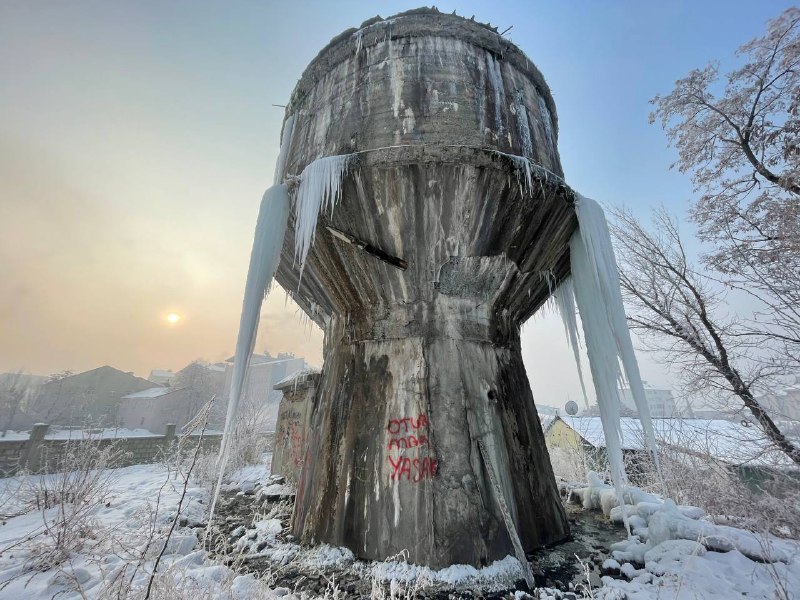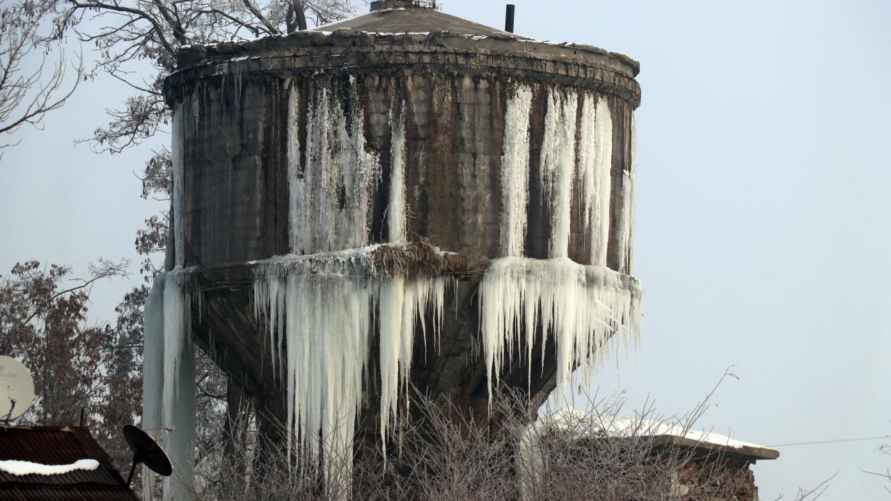Soğuk nedeniyle şehir mezarlığındaki su deposunun etrafında da yaklaşık 5 metrelik buz sarkıtları oluştu.