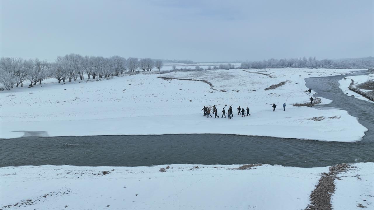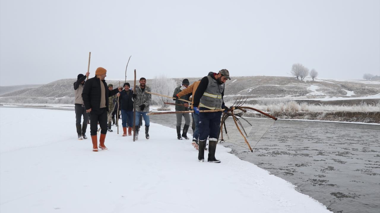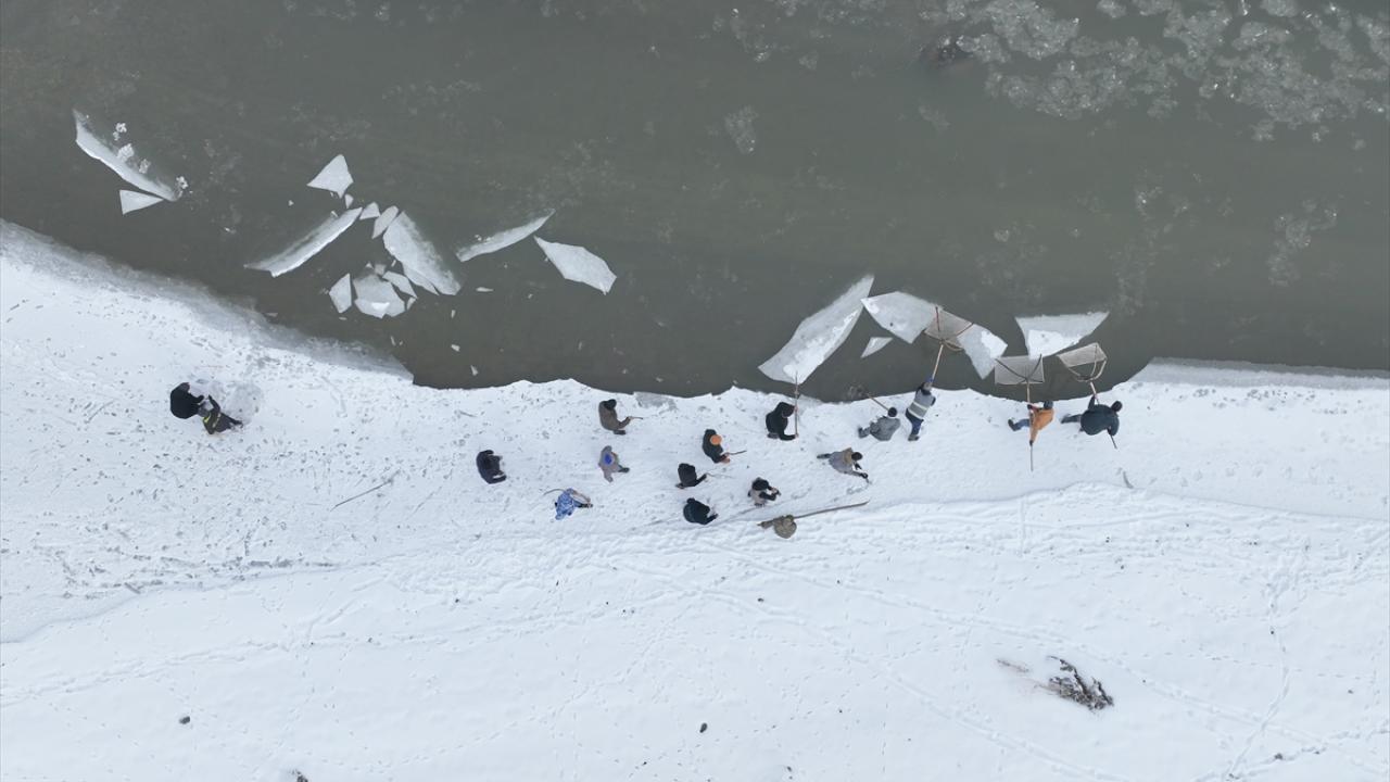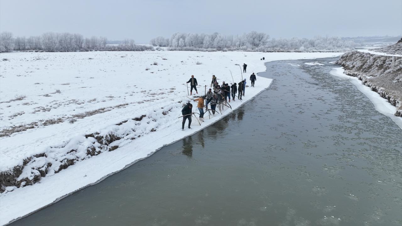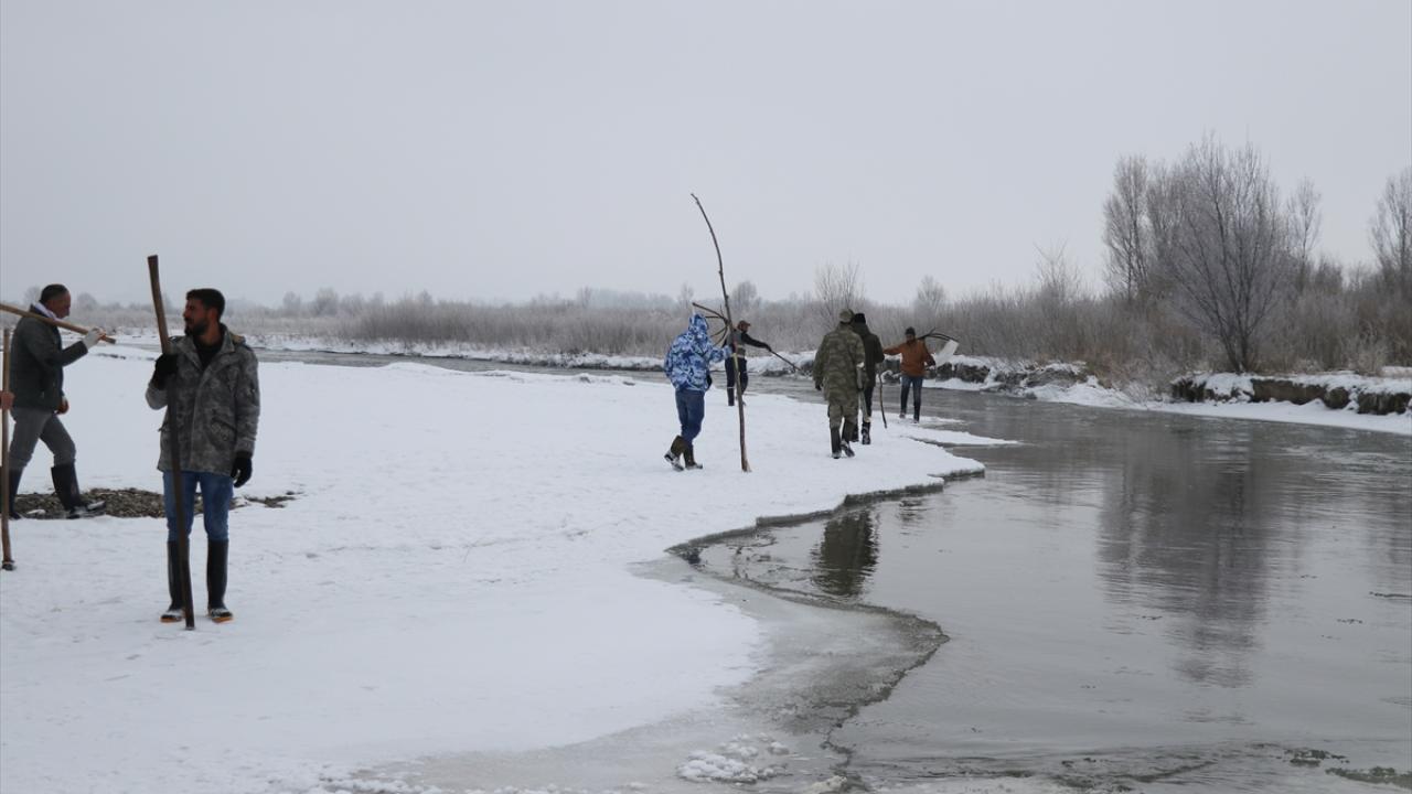 Kış şartlarının ağır geçtiği köydeki vatandaşlar, yanlarına odun parçaları ve "dirgen tor" adını verdikleri ağla, bir bölümü buzla kaplı Murat Nehri kıyısına geliyor.