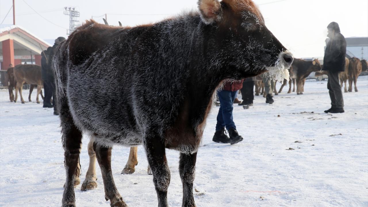 Ağrı`da satılmak için pazara getirilen hayvanların çenesi ve gözleri kırağı tuttu.