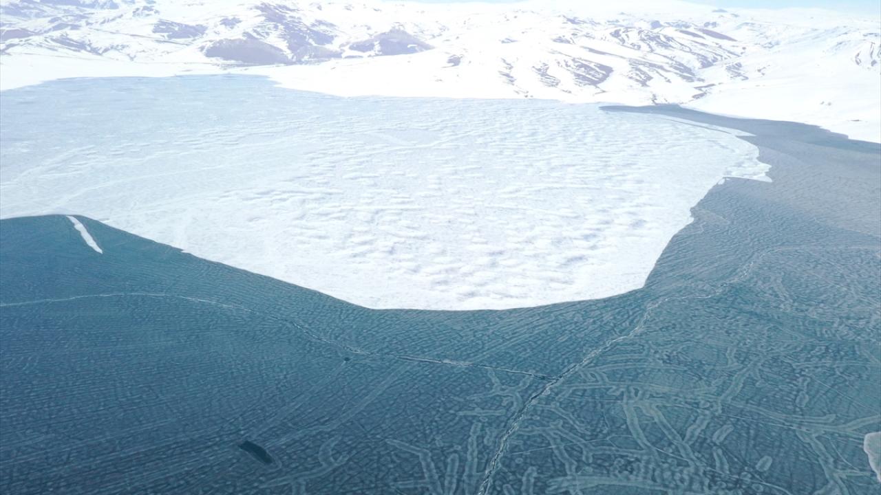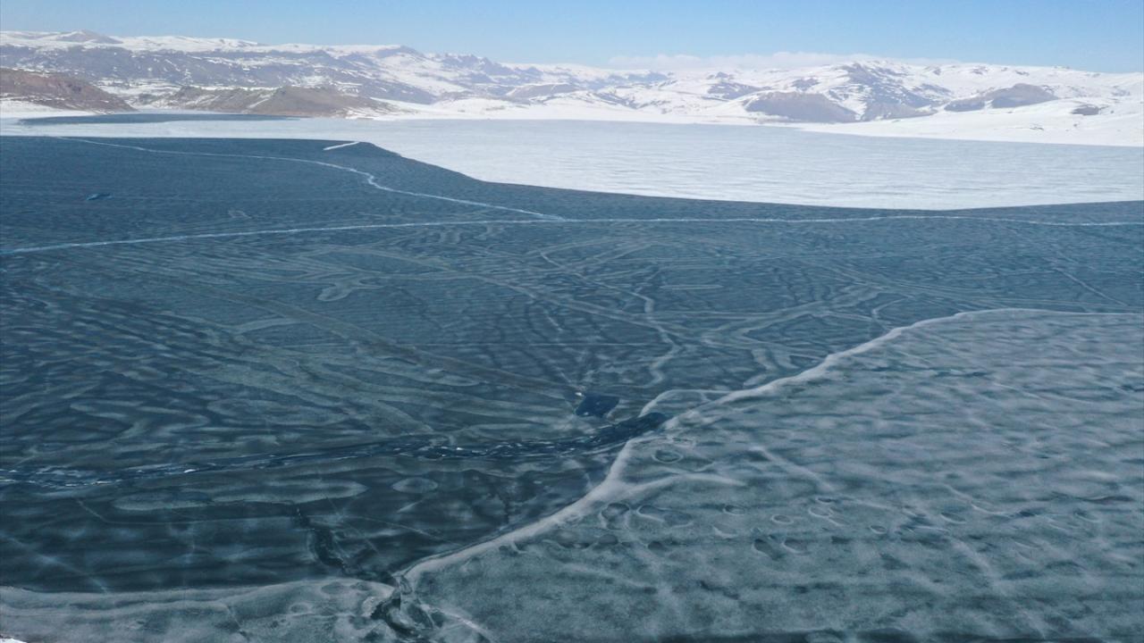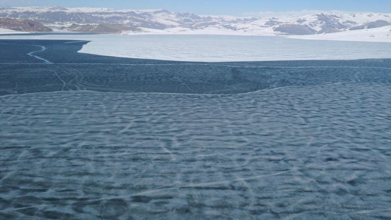 Ağrı'da Yazıcı Barajı'nın buzla kaplı yüzeyi çözülüyor