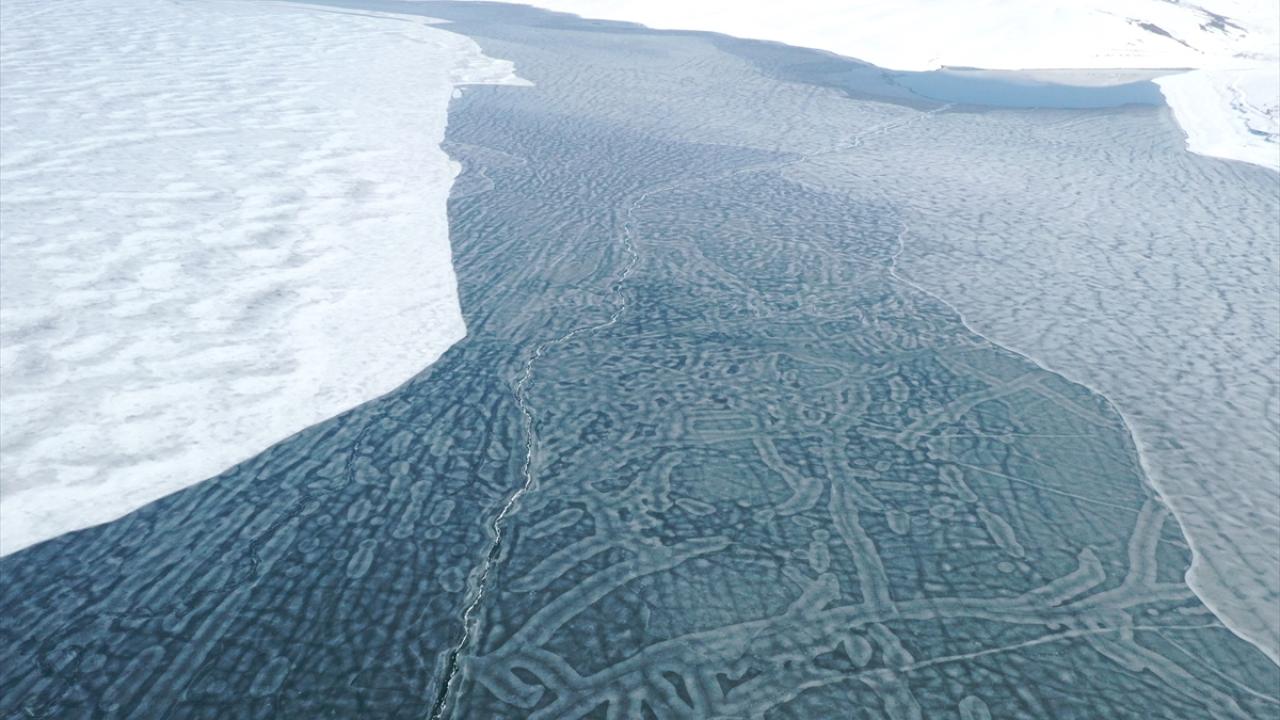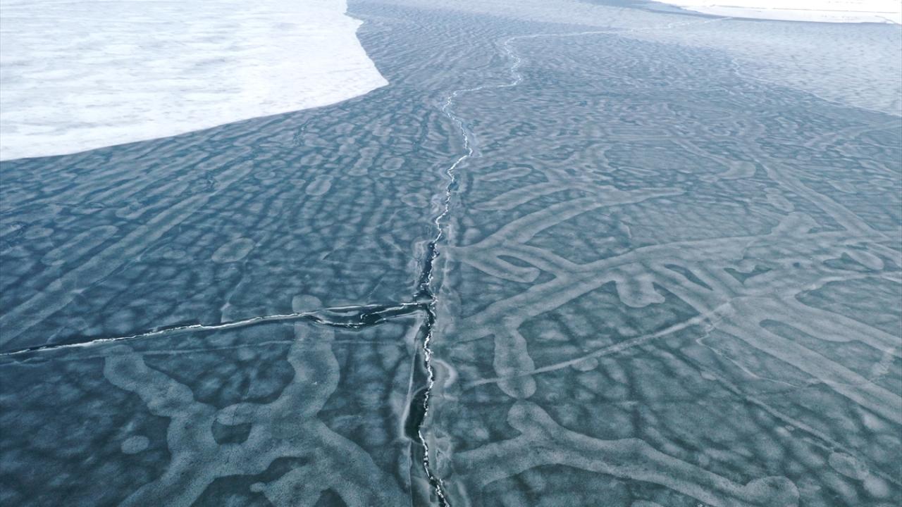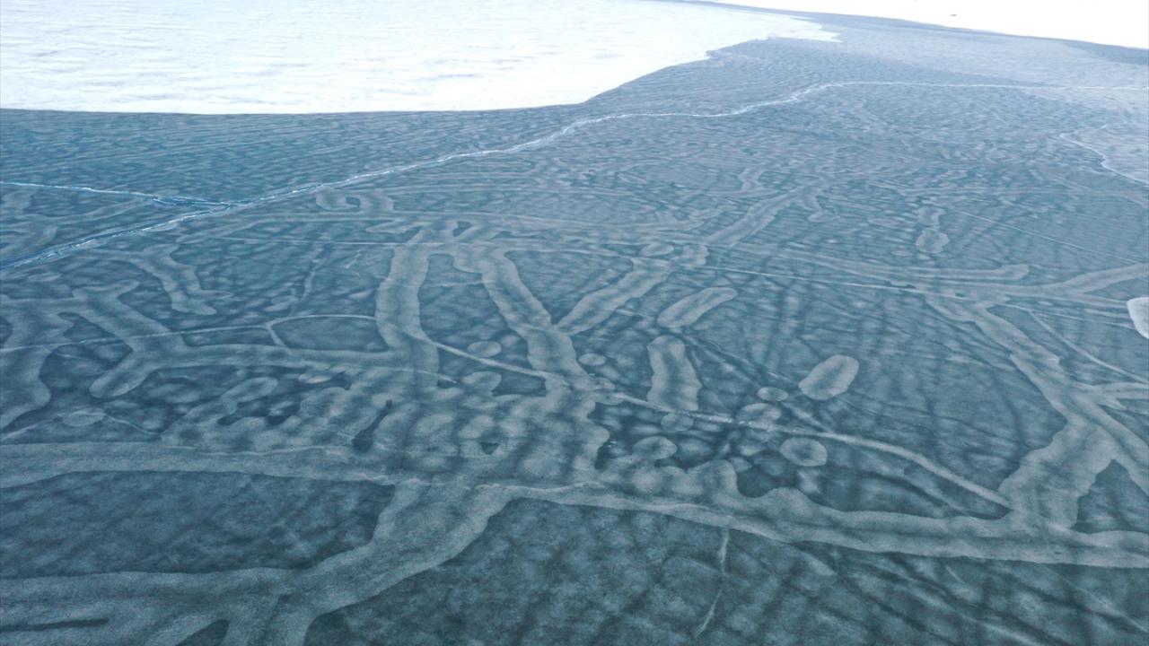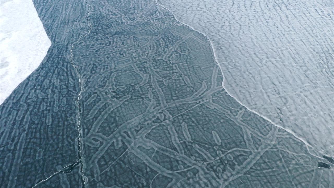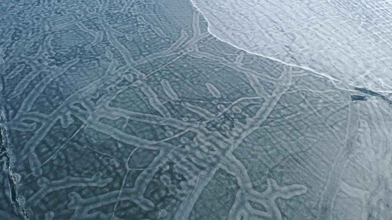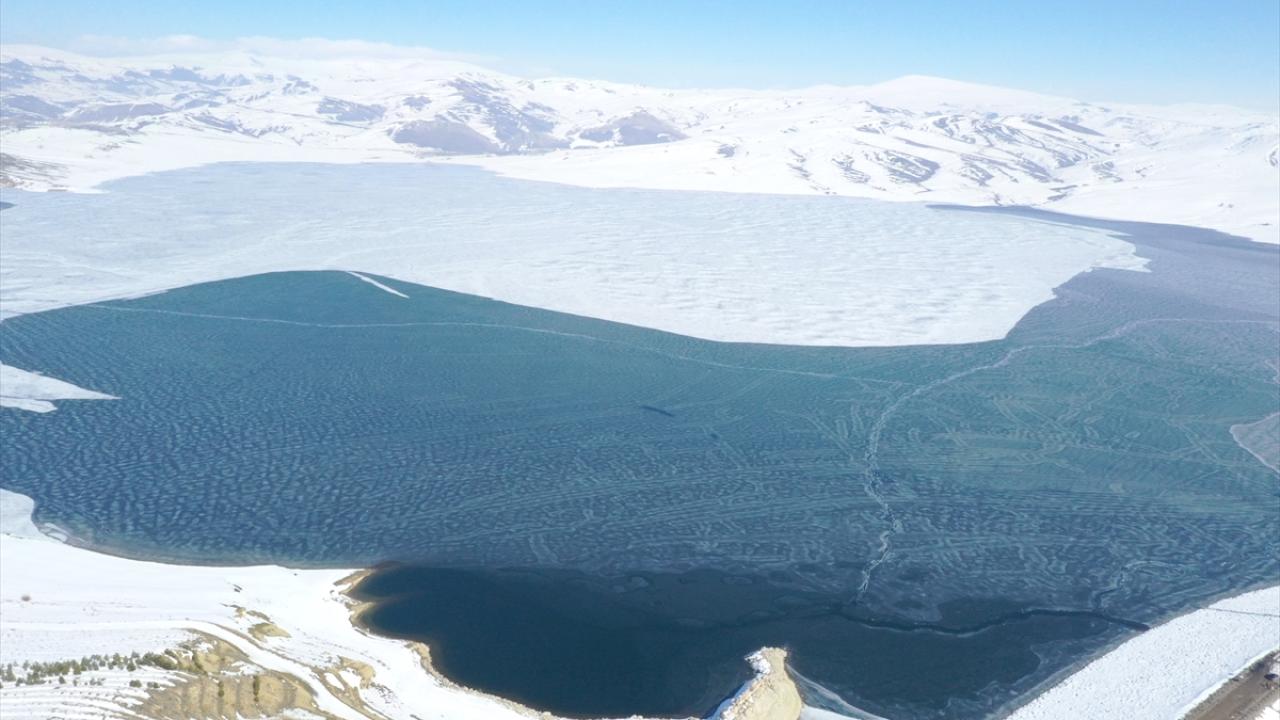 Yüzeyinde farklı buz şekillerinin oluştuğu baraj dronla görüntülendi.