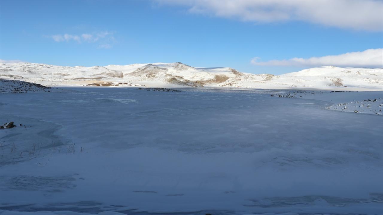 Çevresi karlı dağlarla kaplı olan ve güzel manzara oluşturan barajın buzla kaplı yüzeyi dronla görüntülendi.