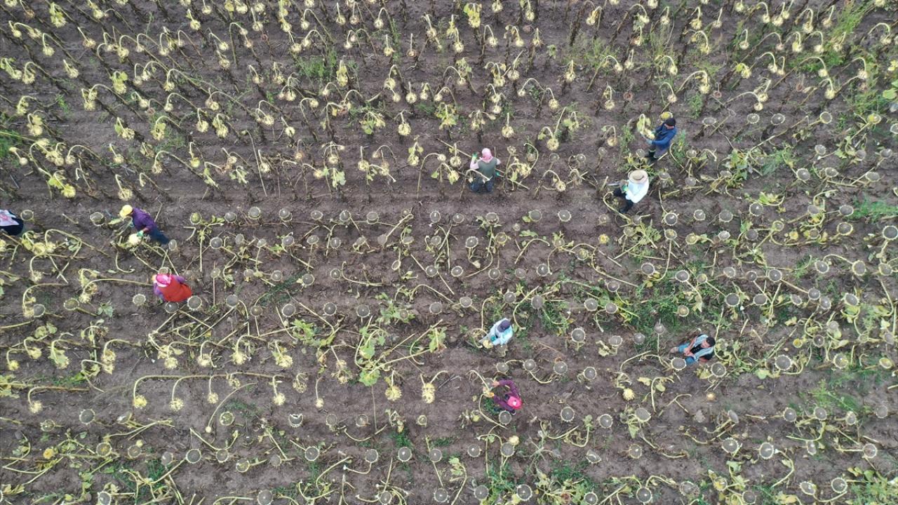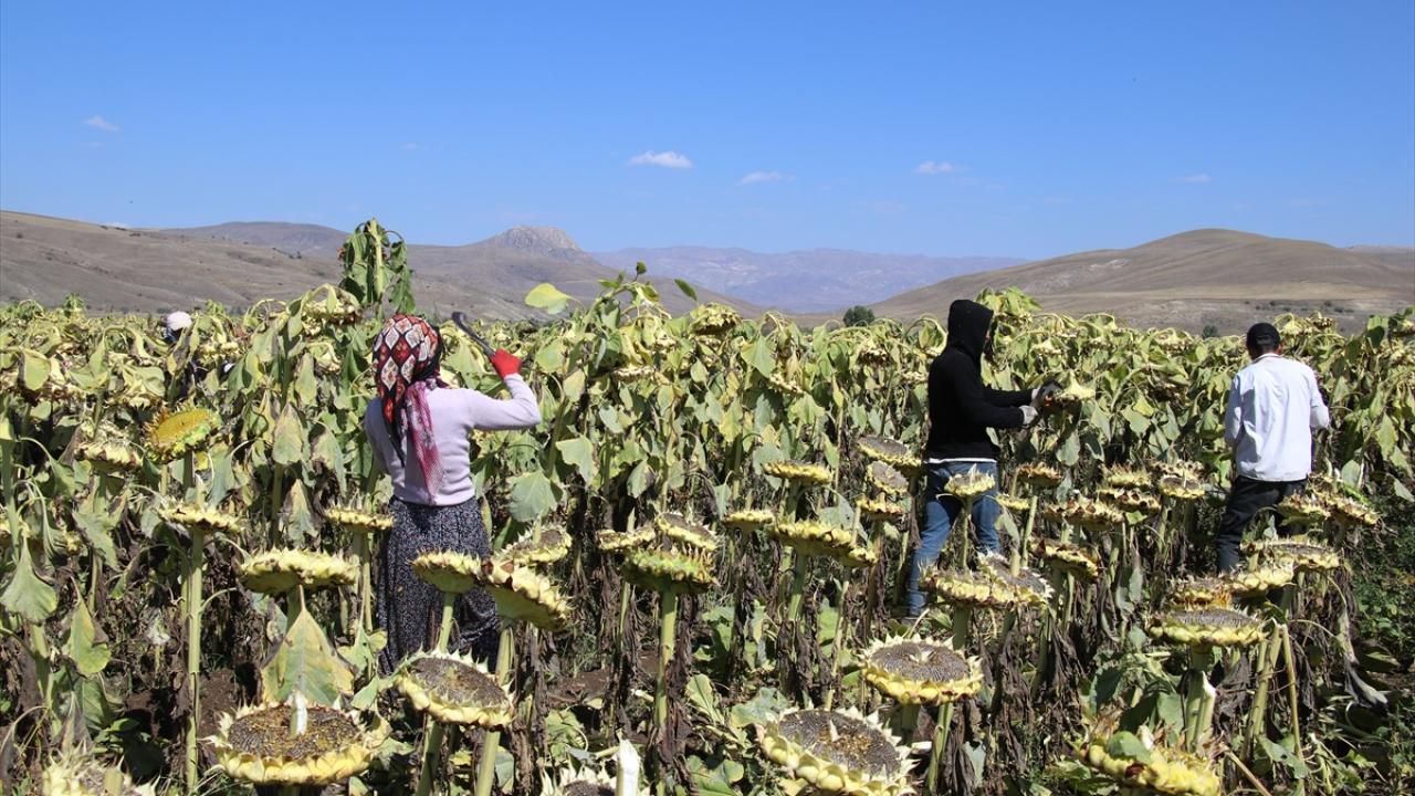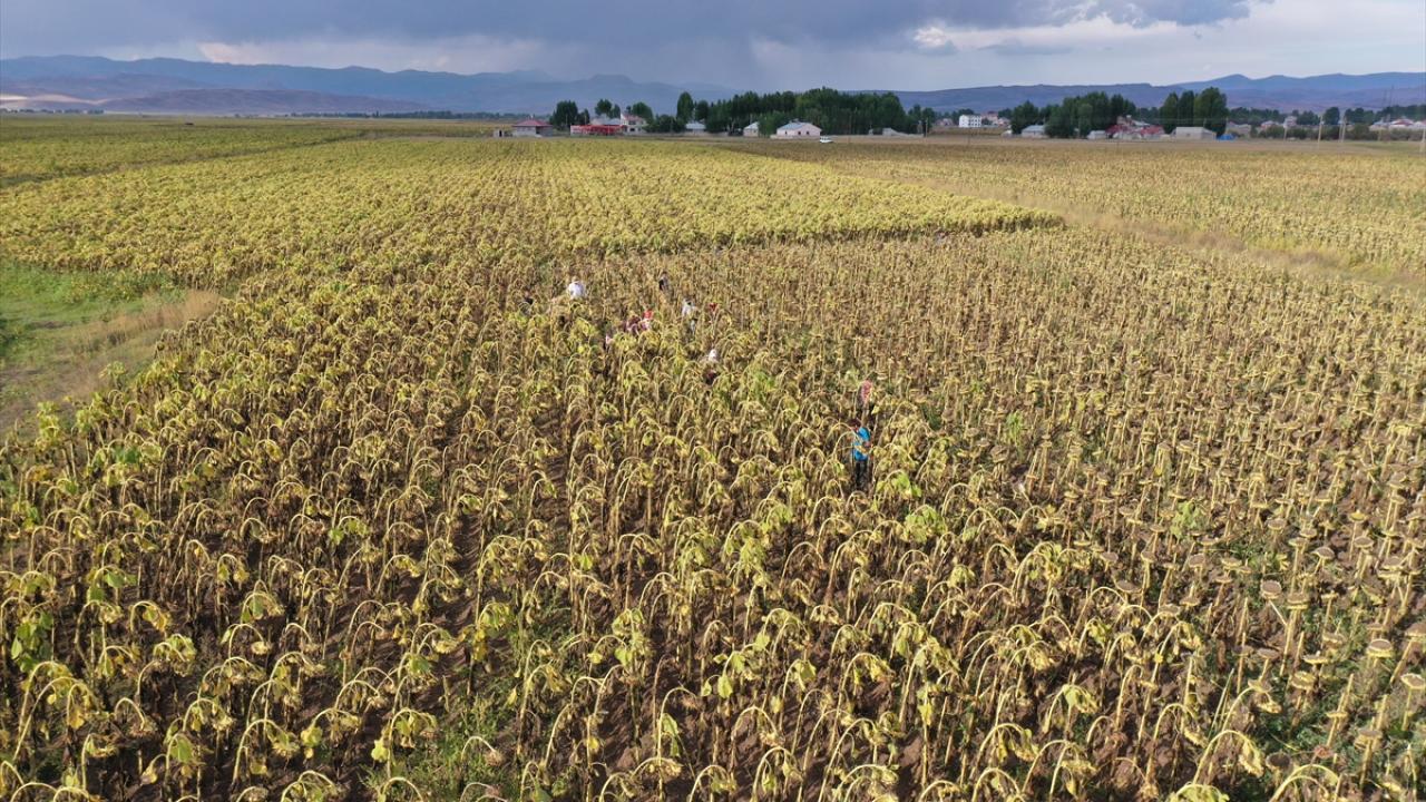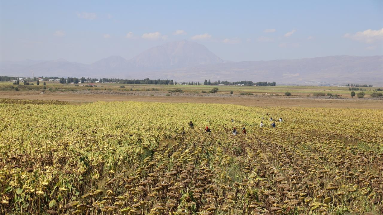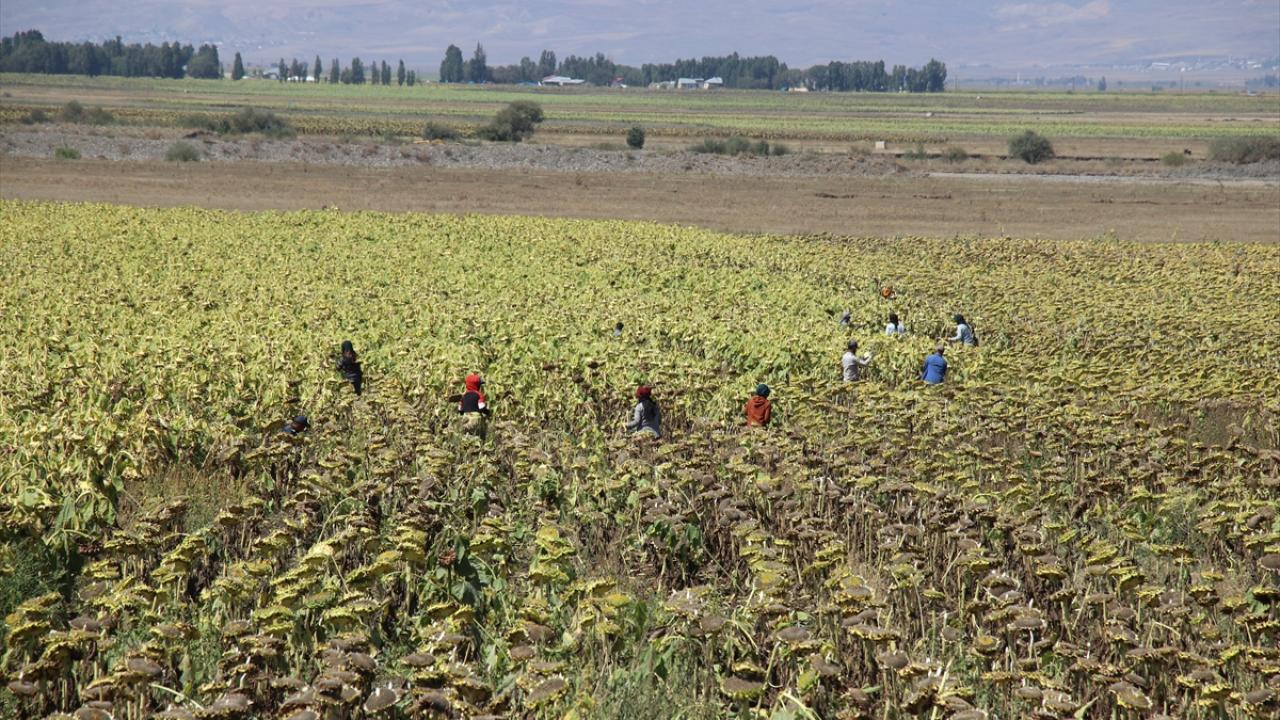 Zengin su kaynaklarına sahip Ağrı Ovası'nın binlerce dönümlük tarlalarında yetiştirilen çerezlik ayçiçeği, Şanlıurfa'dan gelen mevsimlik tarım işçileri tarafından hasat ediliyor.