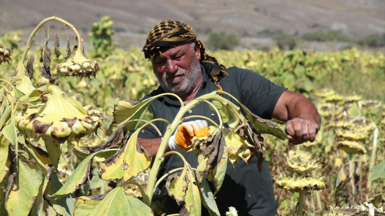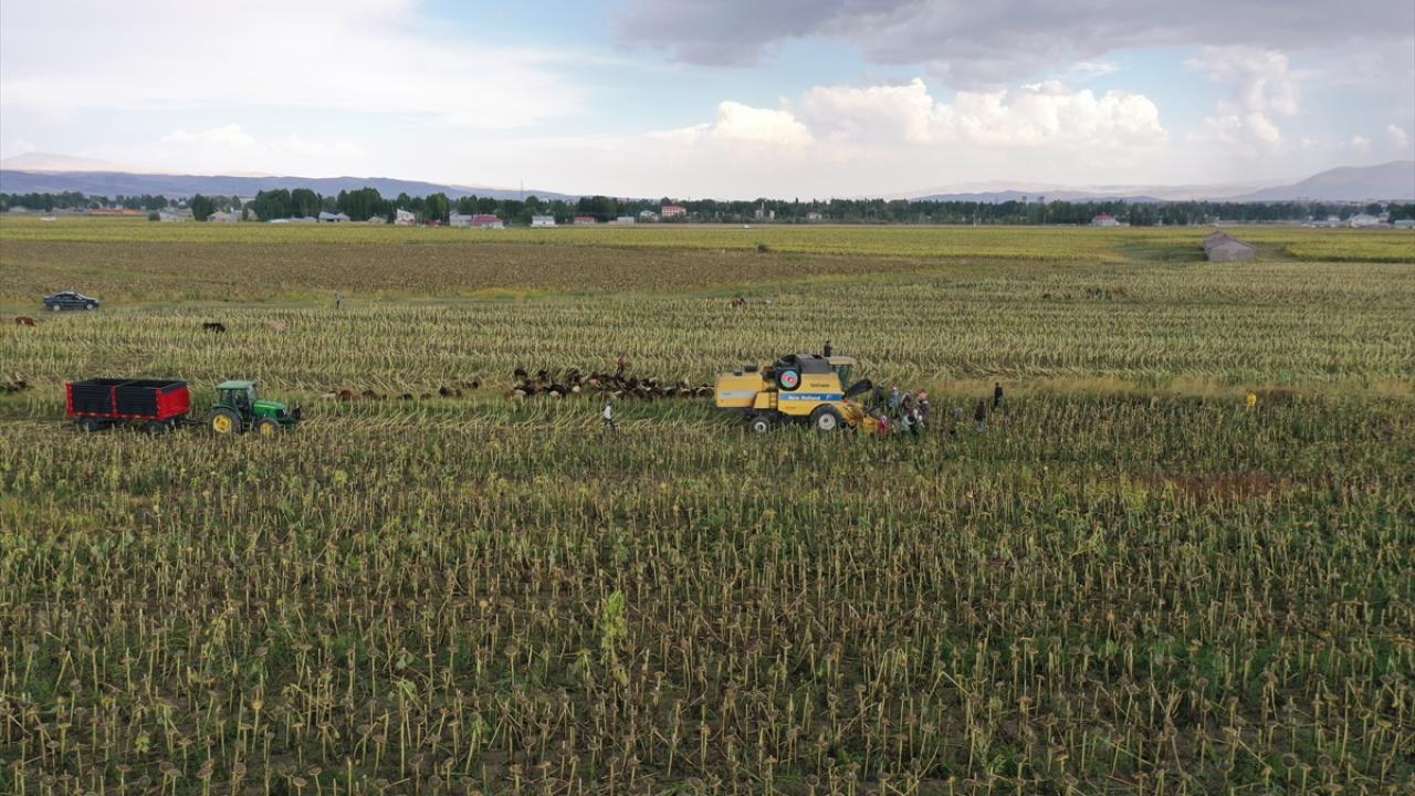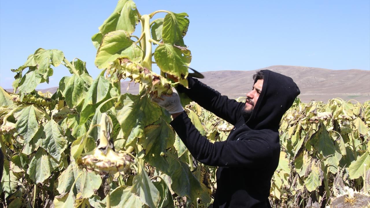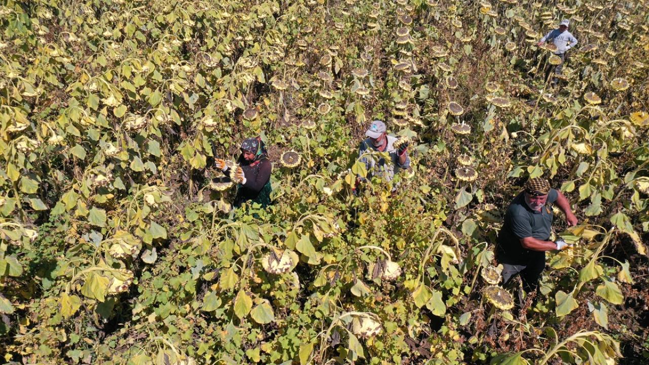 Zengin su kaynaklarına sahip Ağrı Ovası'nın binlerce dönümlük tarlalarında yetiştirilen çerezlik ayçiçeği, Şanlıurfa'dan gelen mevsimlik tarım işçileri tarafından hasat ediliyor.