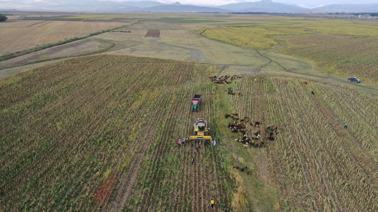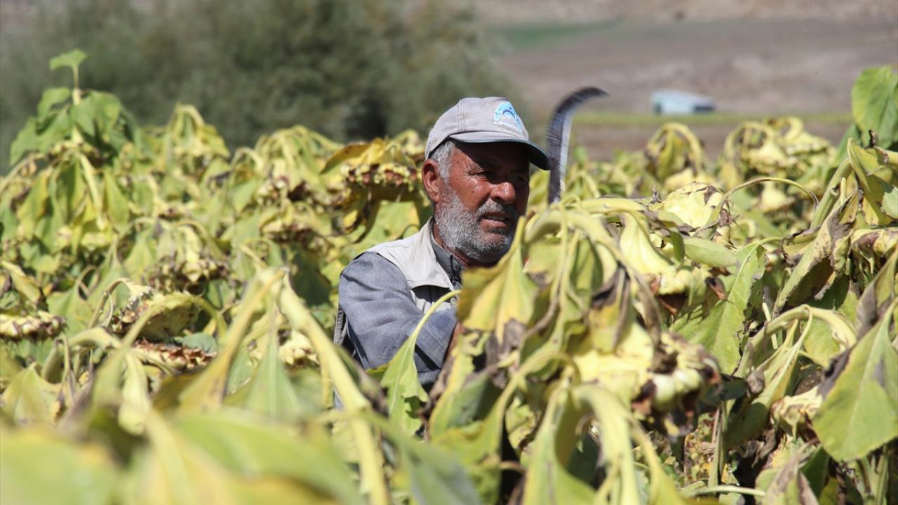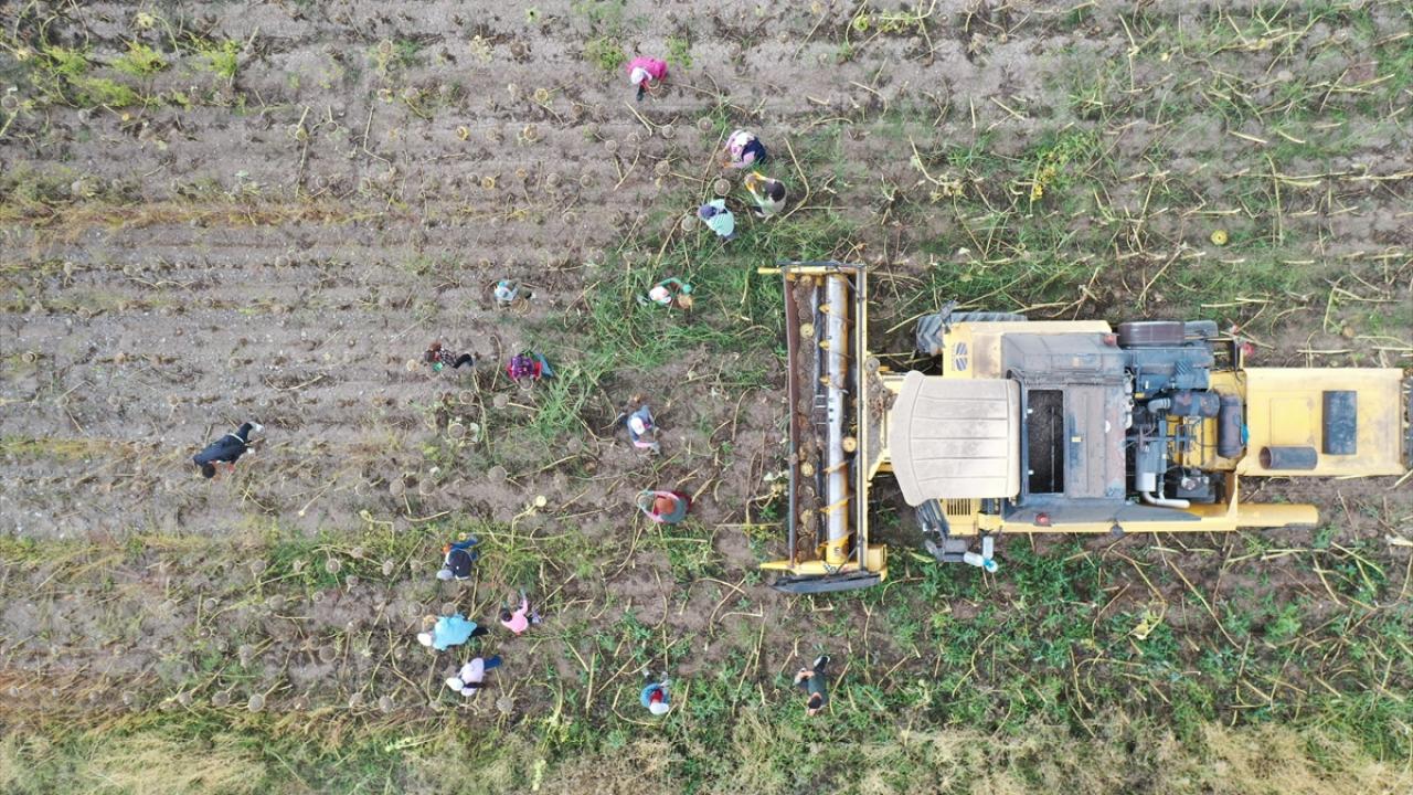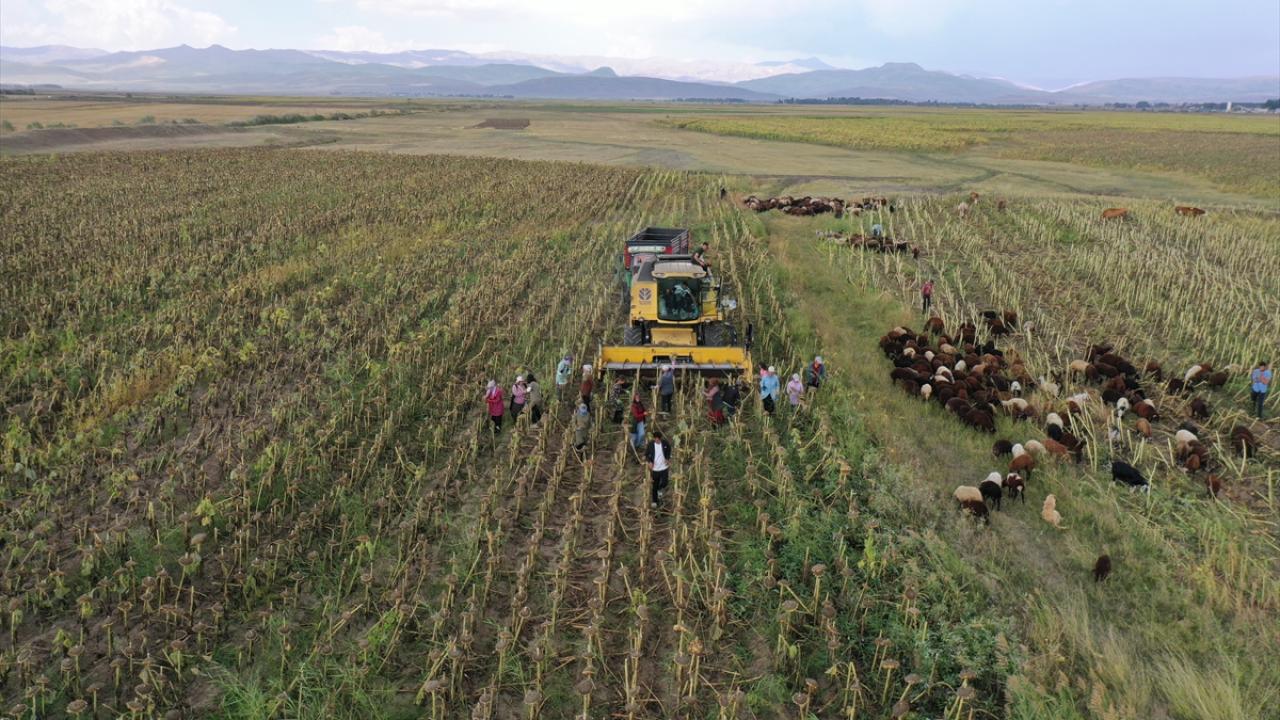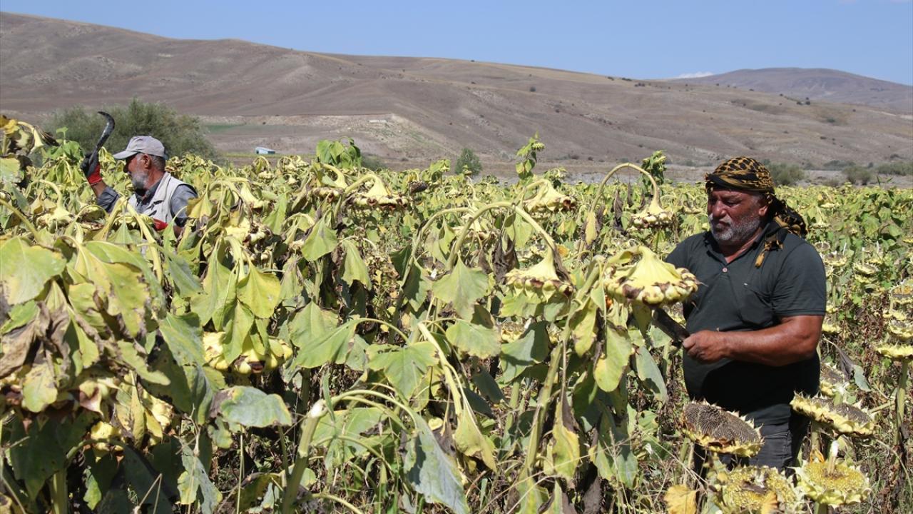 Zengin su kaynaklarına sahip Ağrı Ovası'nın binlerce dönümlük tarlalarında yetiştirilen çerezlik ayçiçeği, Şanlıurfa'dan gelen mevsimlik tarım işçileri tarafından hasat ediliyor.