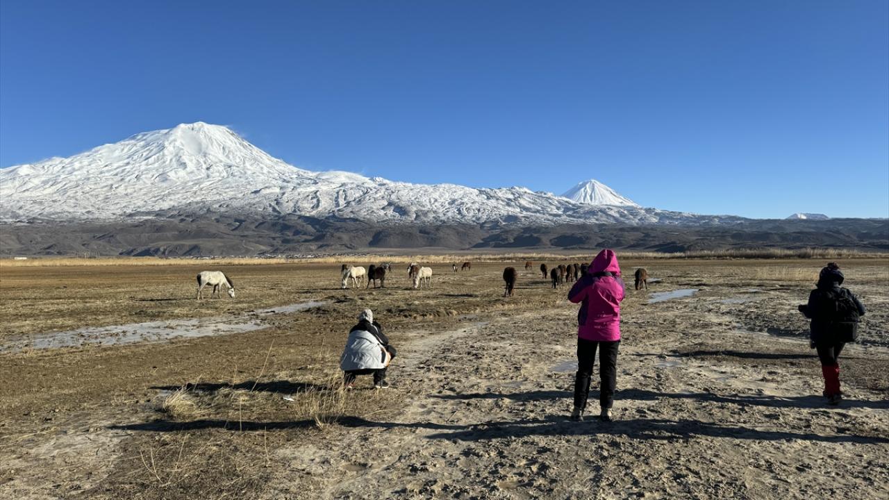 Ardından 5137 metrelik rakımıyla yurdun en yüksek noktası olan Ağrı Dağı`nın yakınlarına giden fotoğrafçılar, arazide otlayan atlar ile dağın fotoğraflarını çekerek vakit geçiriyor.