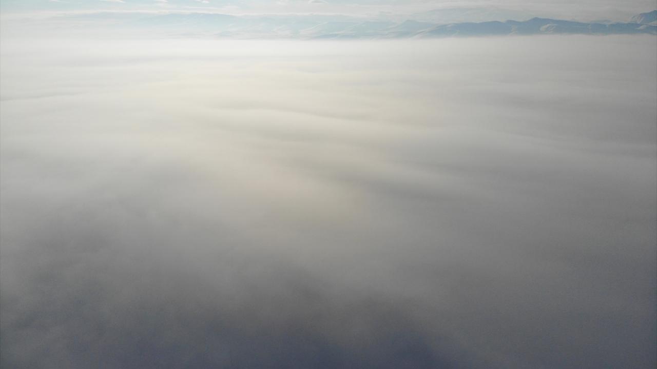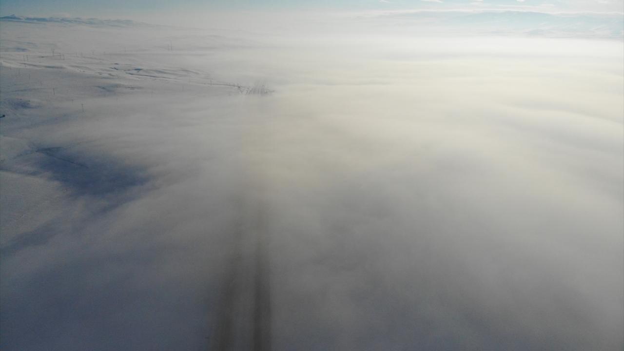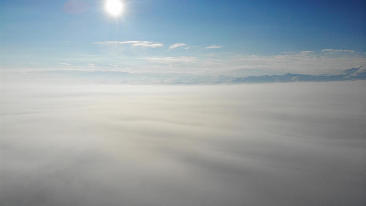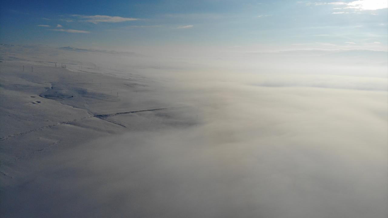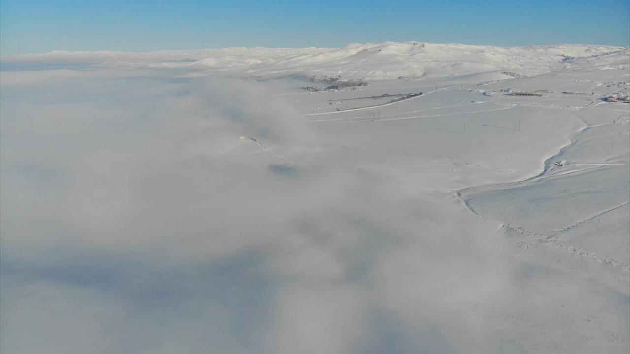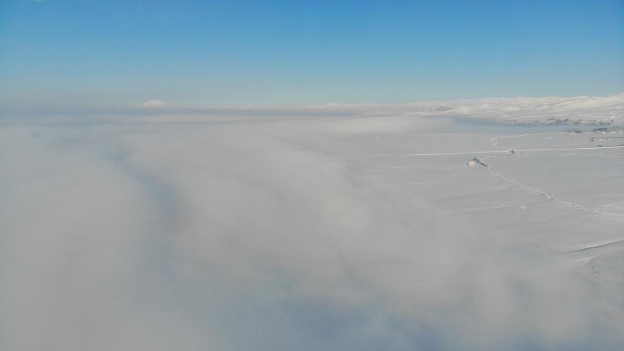 Dondurucu soğukların etkisi altındaki Ağrı ile çevresini kaplayan kar ve sis, dronla görüntülendi.