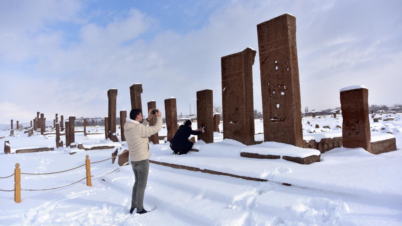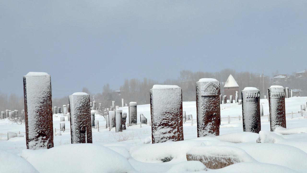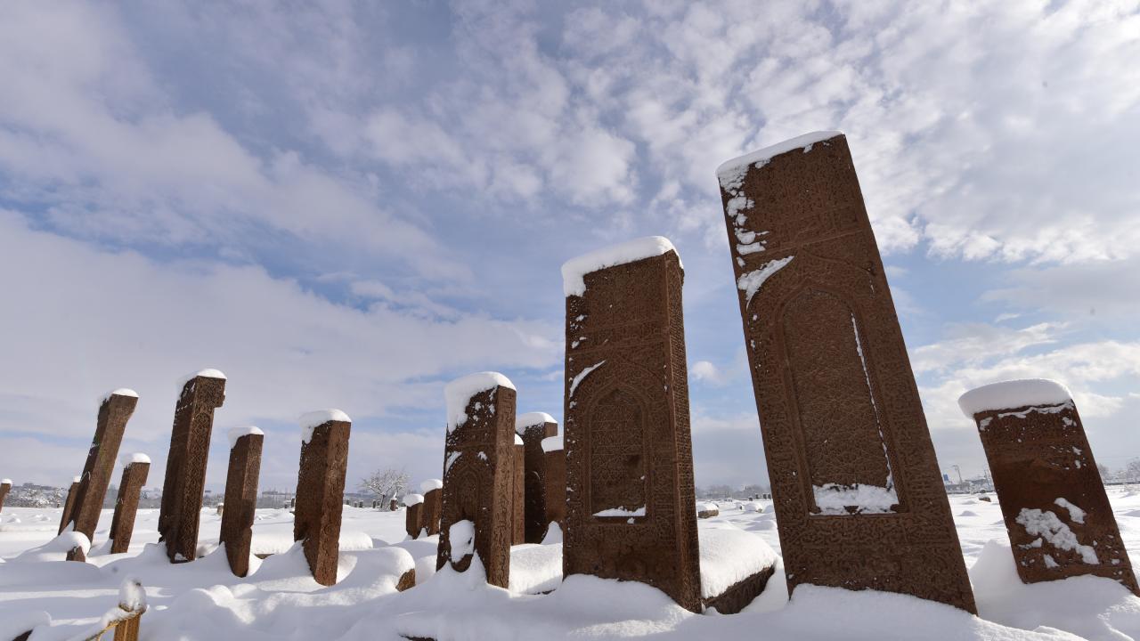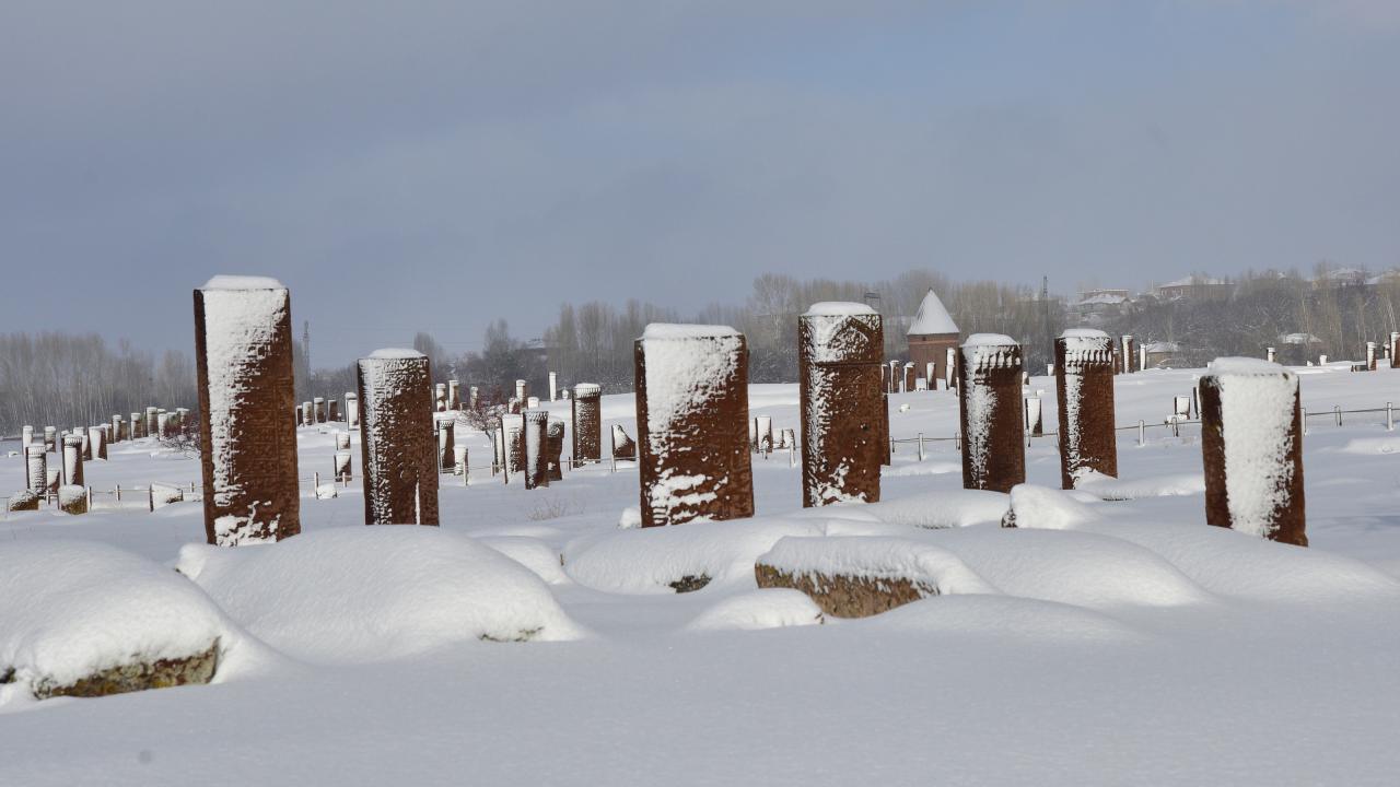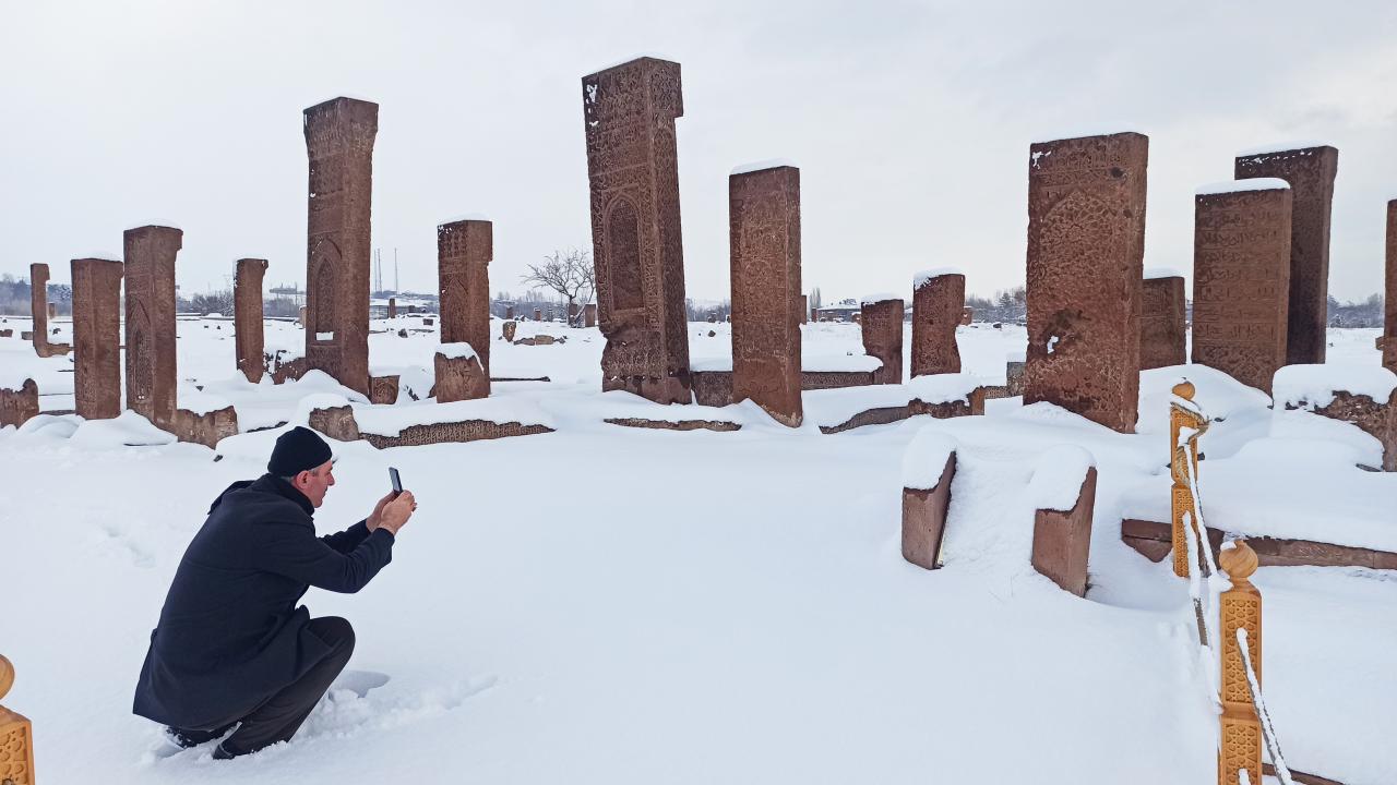 Anadolu’nun Orhun Abideleri olarak da adlandırılan 210 dönüm üzerinde kurulu Ahlat Selçuklu Meydan Mezarlığındaki mezar taşlarının üzerindeki yazılar; kabartmalar, nakış ve işlemeler, kar yağışı sonrası ziyaretçilerini hayran bırakan bir güzelliğe bürünüyor.