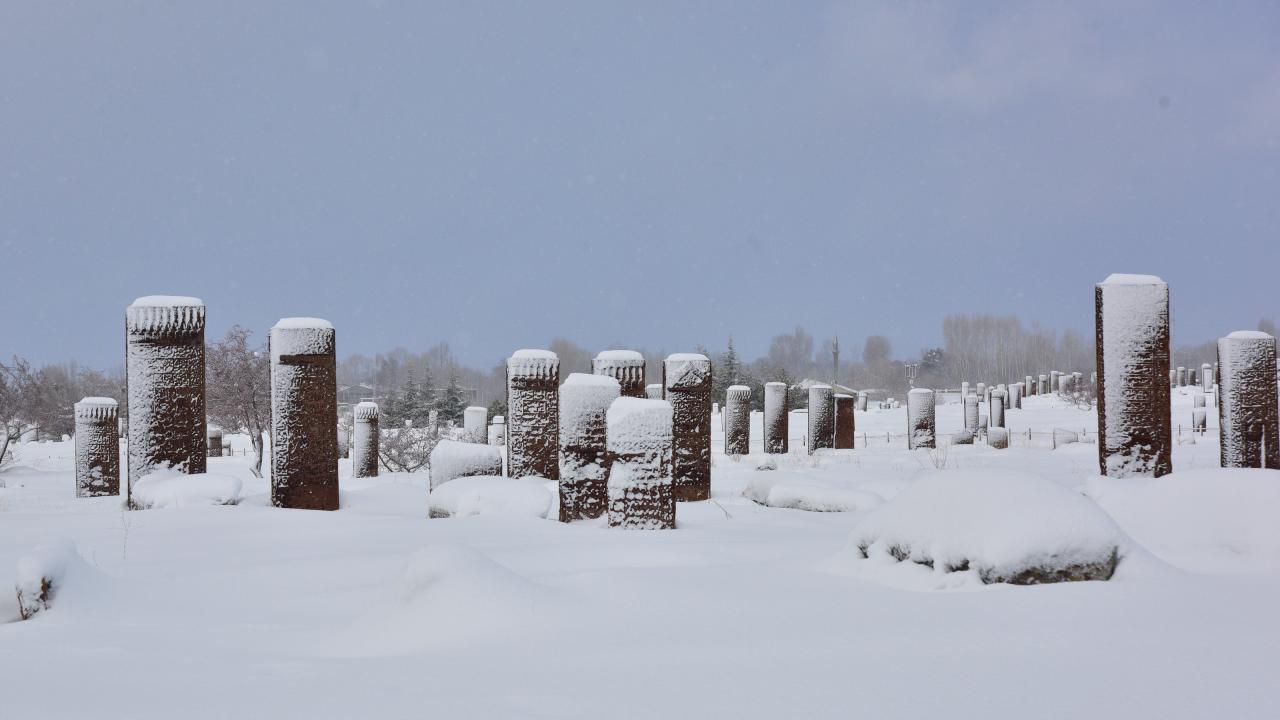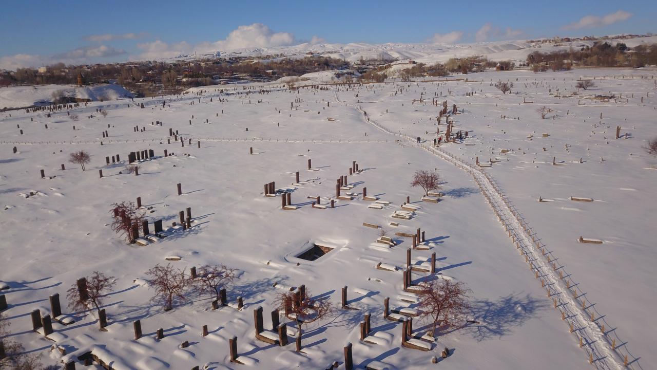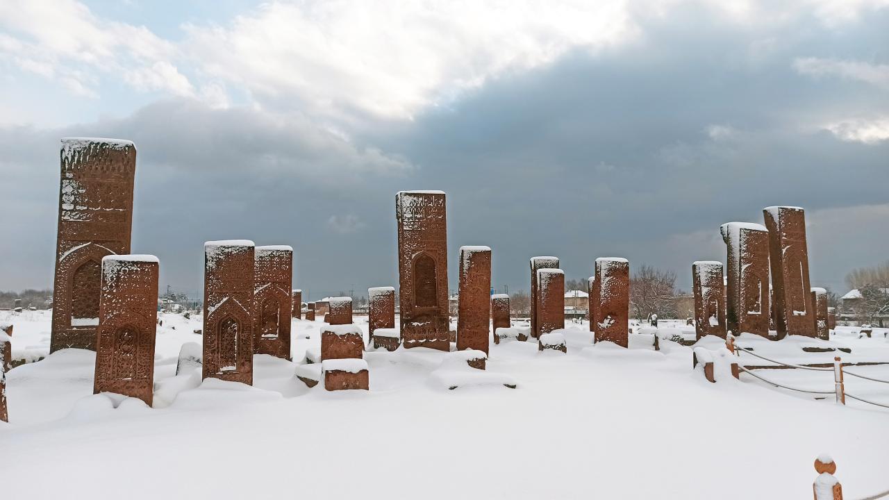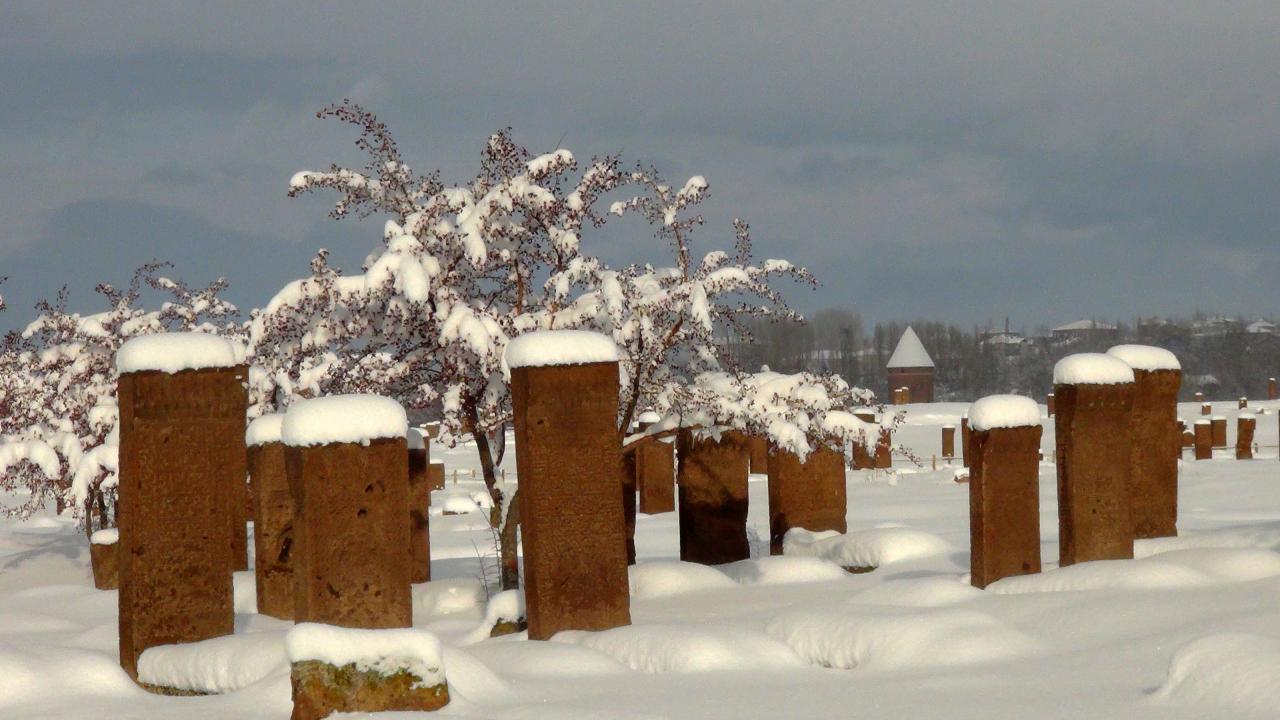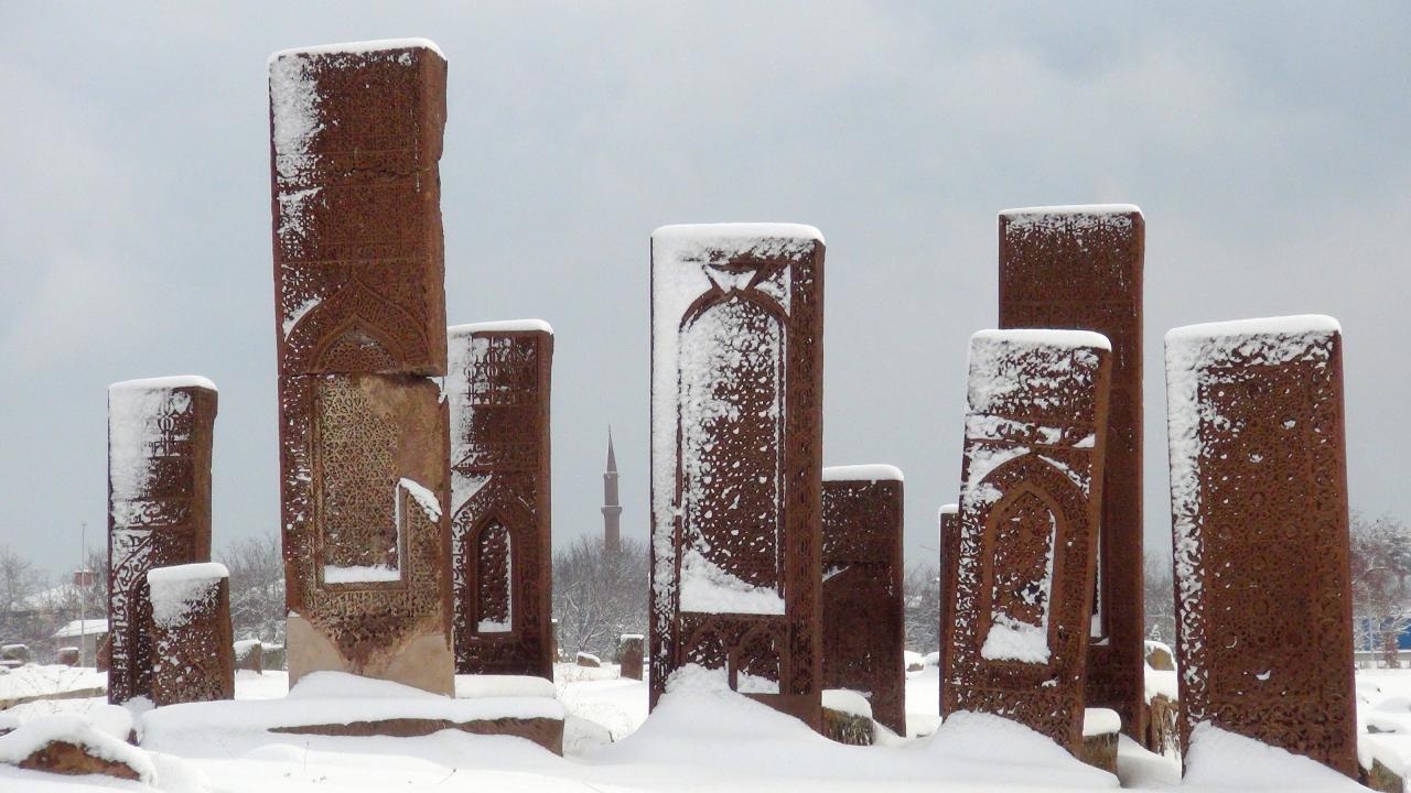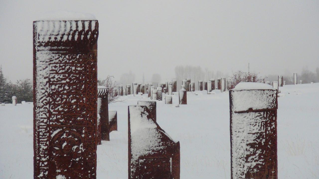 Anadolu’nun Orhun Abideleri olarak da adlandırılan 210 dönüm üzerinde kurulu Ahlat Selçuklu Meydan Mezarlığındaki mezar taşlarının üzerindeki yazılar; kabartmalar, nakış ve işlemeler, kar yağışı sonrası ziyaretçilerini hayran bırakan bir güzelliğe bürünüyor.