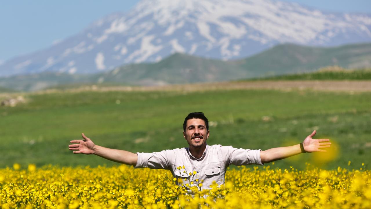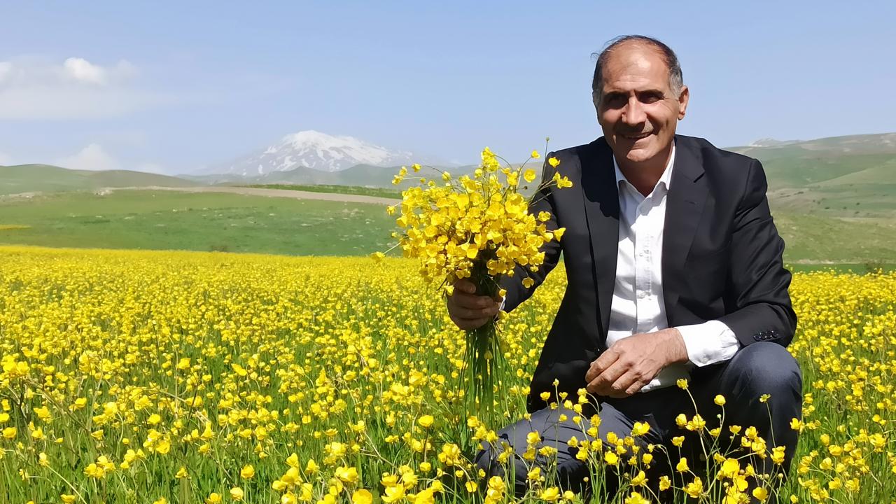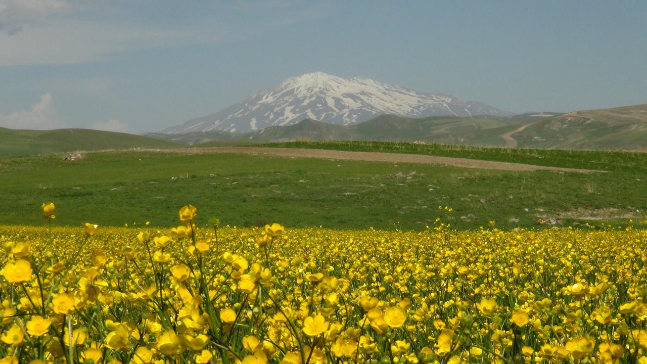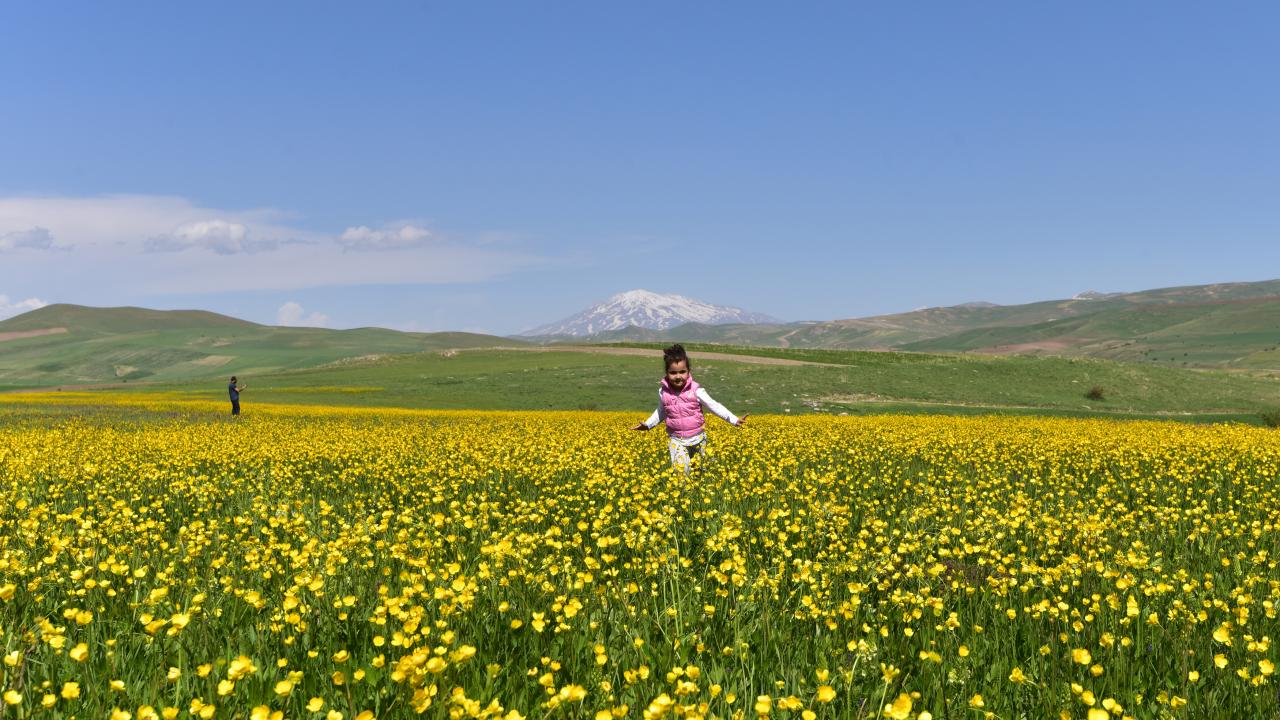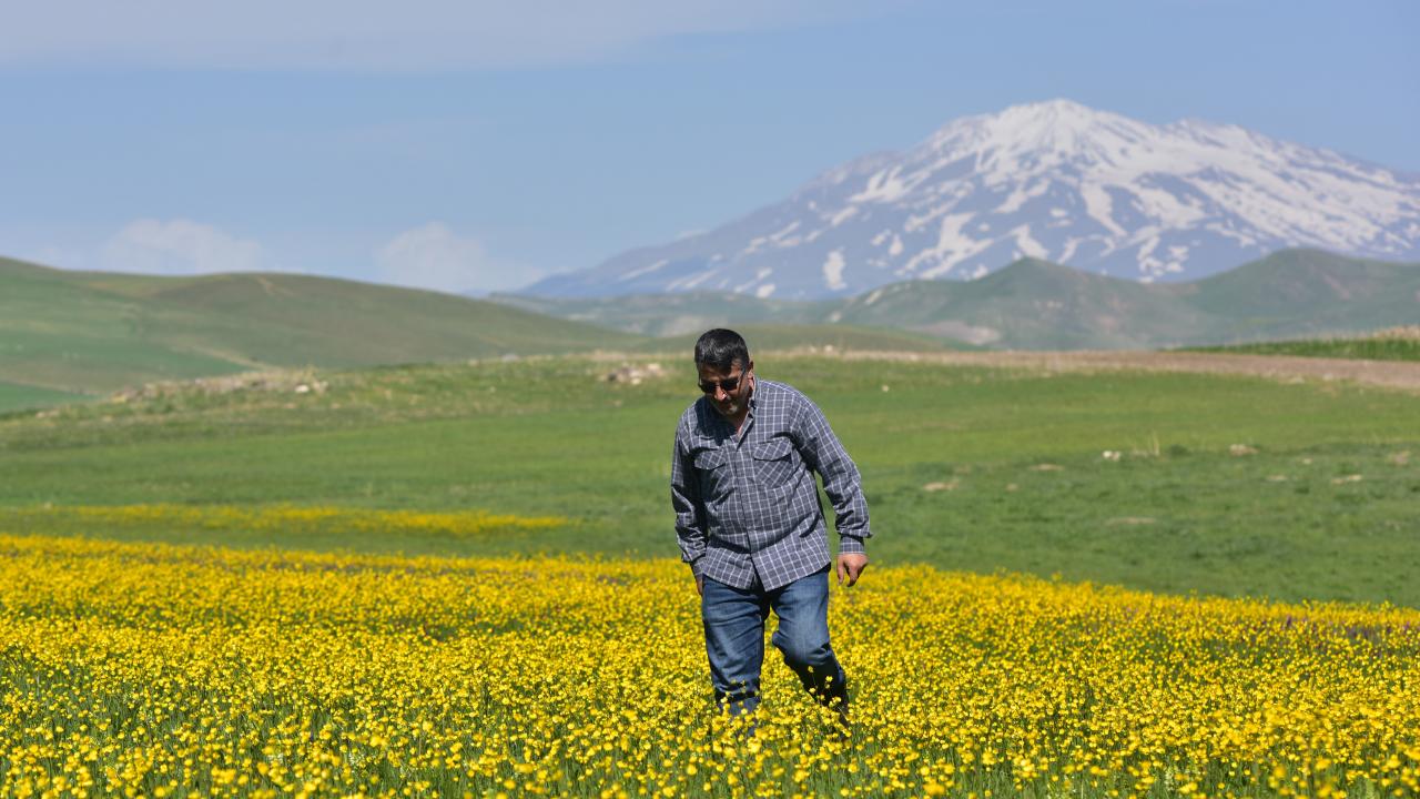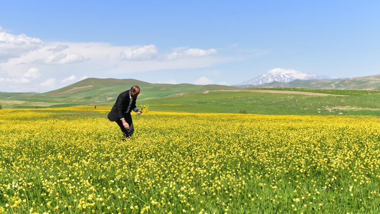 Ovanın tümünü sarıyla kaplayan çiçekler ve arka fonda bulunan karlı Süphan Dağı’nın karlı manzarası görenleri hayranlık uyandırıyor.