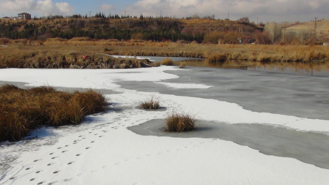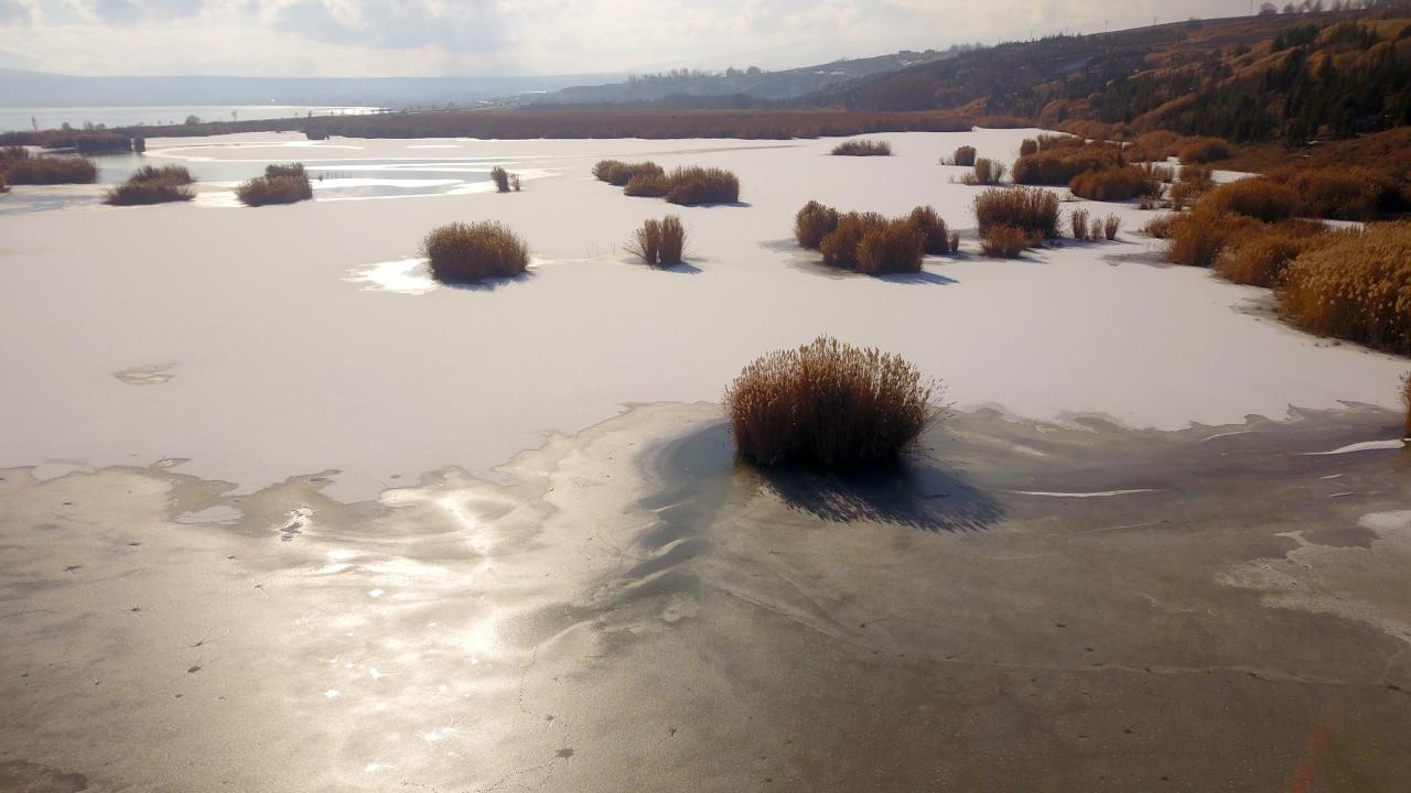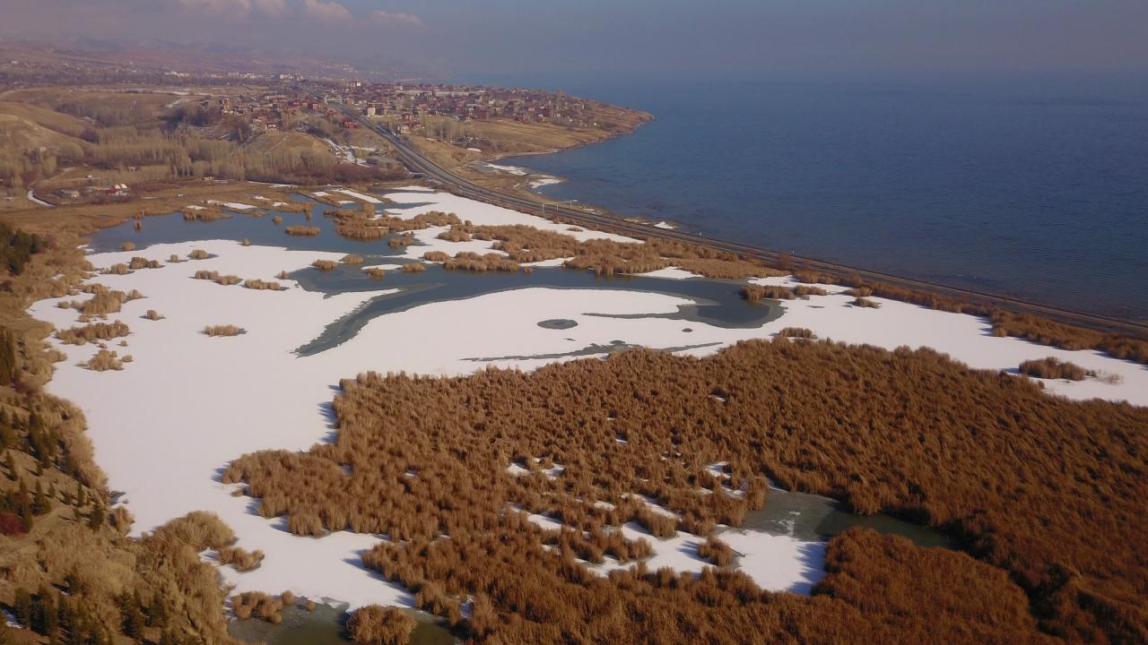 Beklenen kar yağışının olmamasına rağmen Ahlat’ı etkisi altına alan soğuk havalar nedeniyle ilçenin Yamlar mevki`inde bulunan ve onlarca kuş türüne ev sahipliği yapan Vali Uğur Boran Kuş Cenneti’nin yüzeyinin yüzde 80’ni buzla kaplandı.