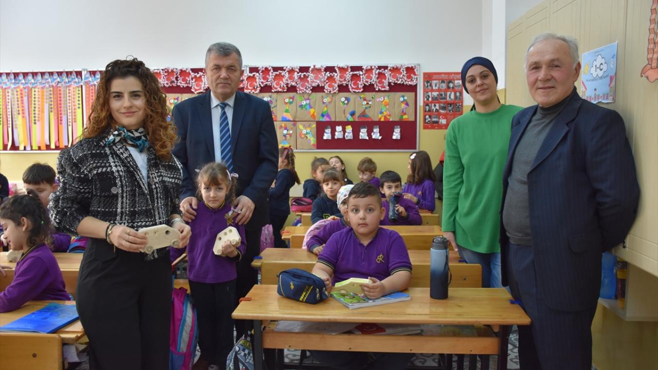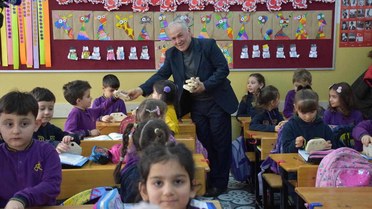 Okul Müdürü Uzun, Milli Eğitim Bakanlığının "Çevreme Duyarlıyım, Değerlerime Sahip Çıkıyorum Projesi (ÇEDES)" kapsamında birinci sınıfta eğitim gören öğrencileri Muhammet Emir Gülay`ın dedesinin yaptığı el emeği oyuncakları hediye ettiğini söyledi.