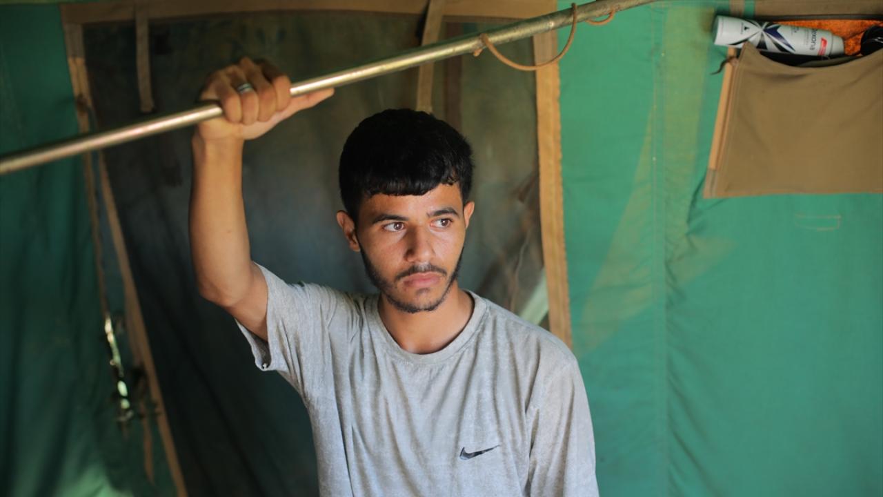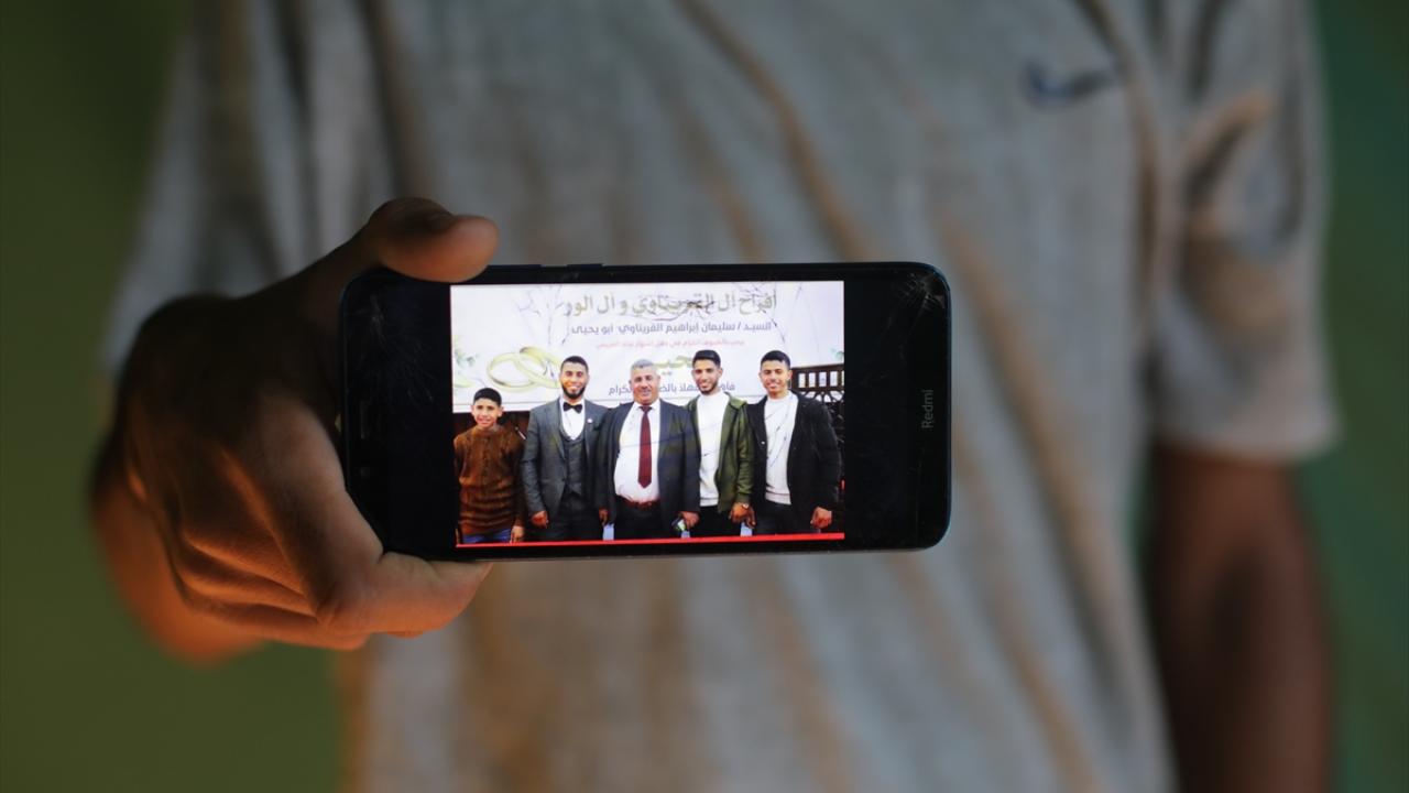 Aileden sağ kalan Muhammed Karnavi, bir düğün fotoğrafı sıcaklığında gülümseyerek babası ve kardeşleriyle verdikleri aile pozunun aksine, bugün Deyr el-Belah’taki bir çadırda tek başına yaşam mücadelesi veriyor.