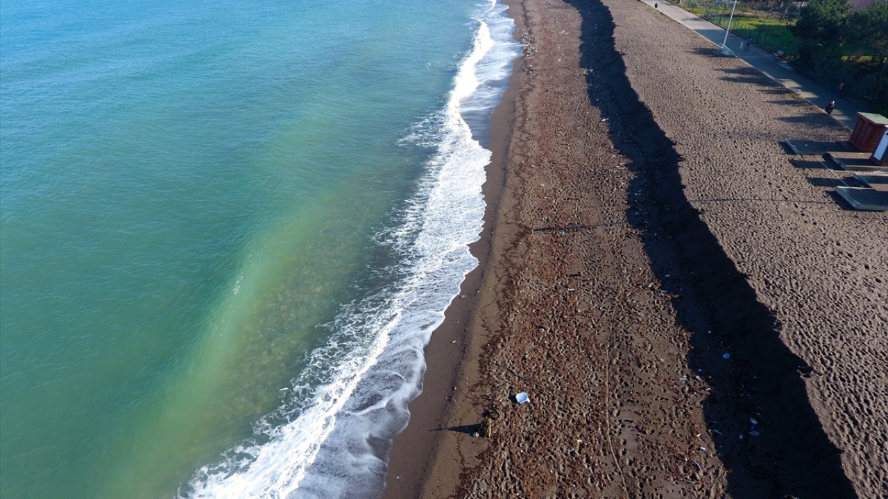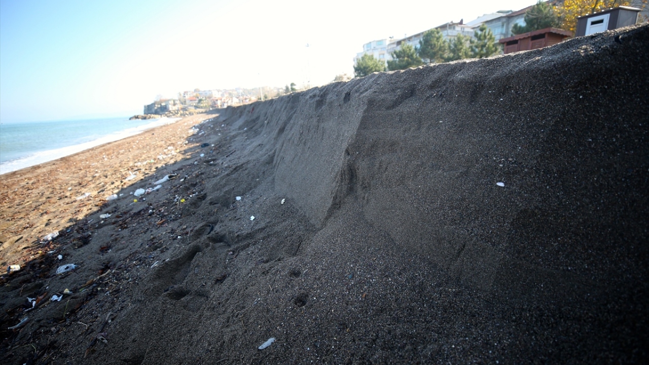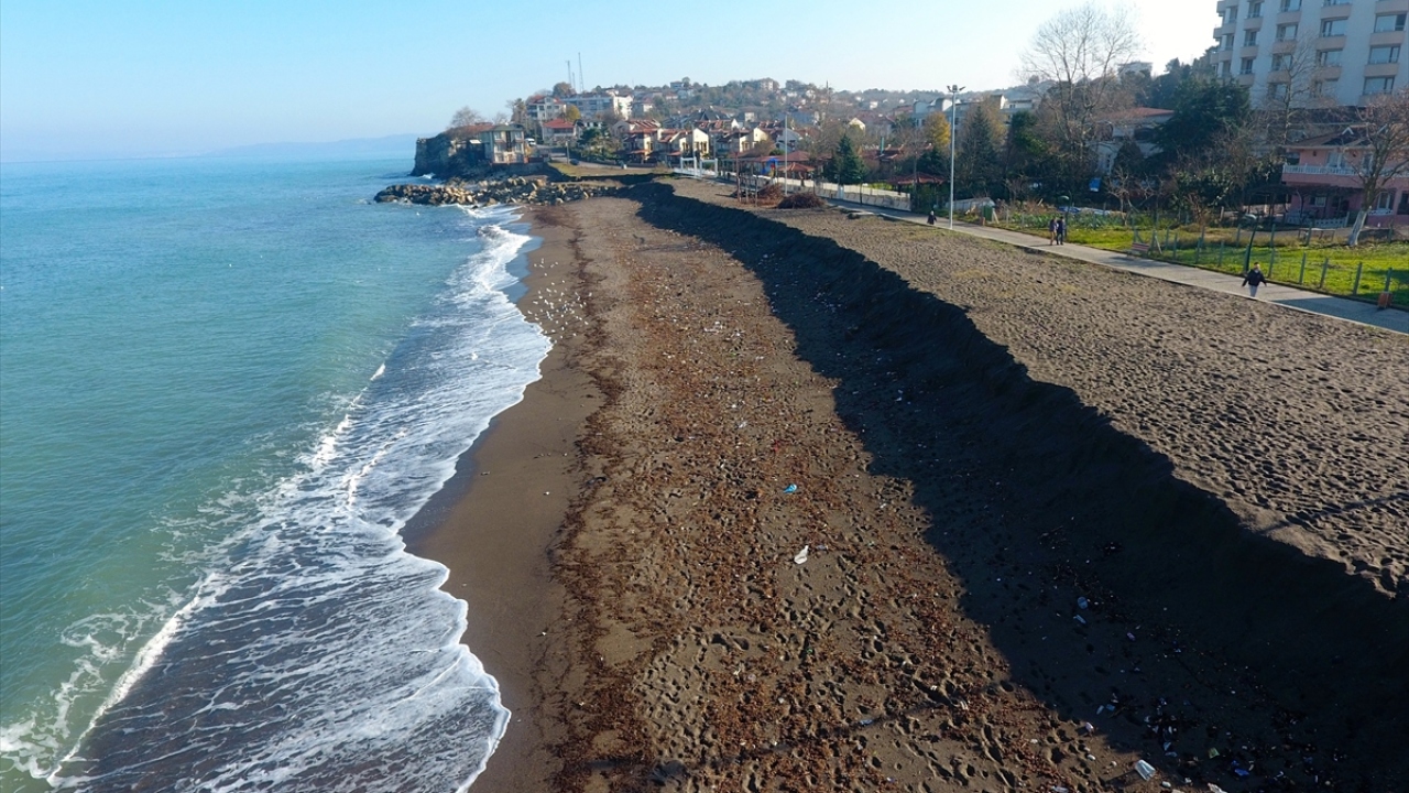 Düzce'nin Akçakoca ilçesinde, sahildeki kumun kıyıya 3 metre çekilmesi ilginç görüntü oluşturdu.