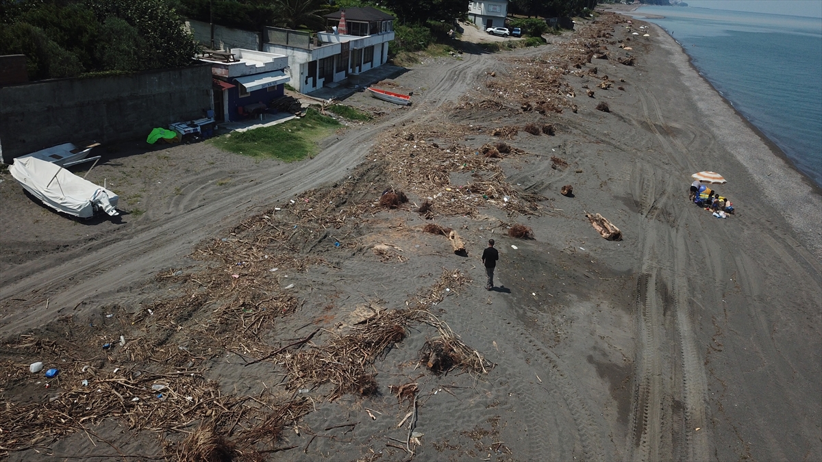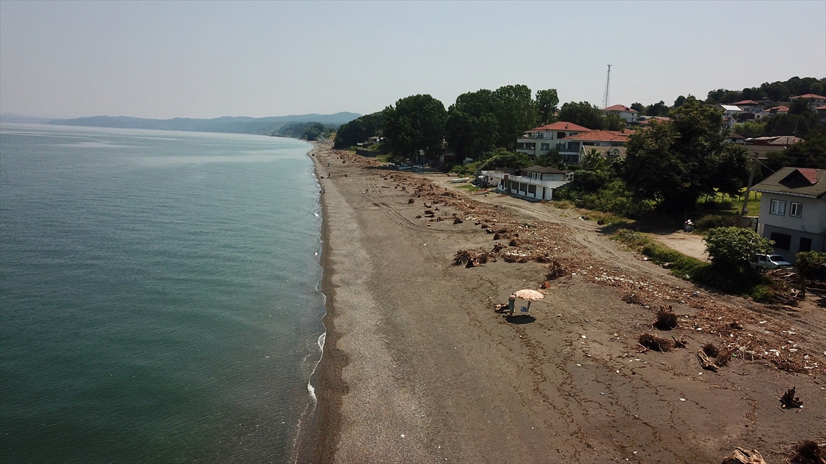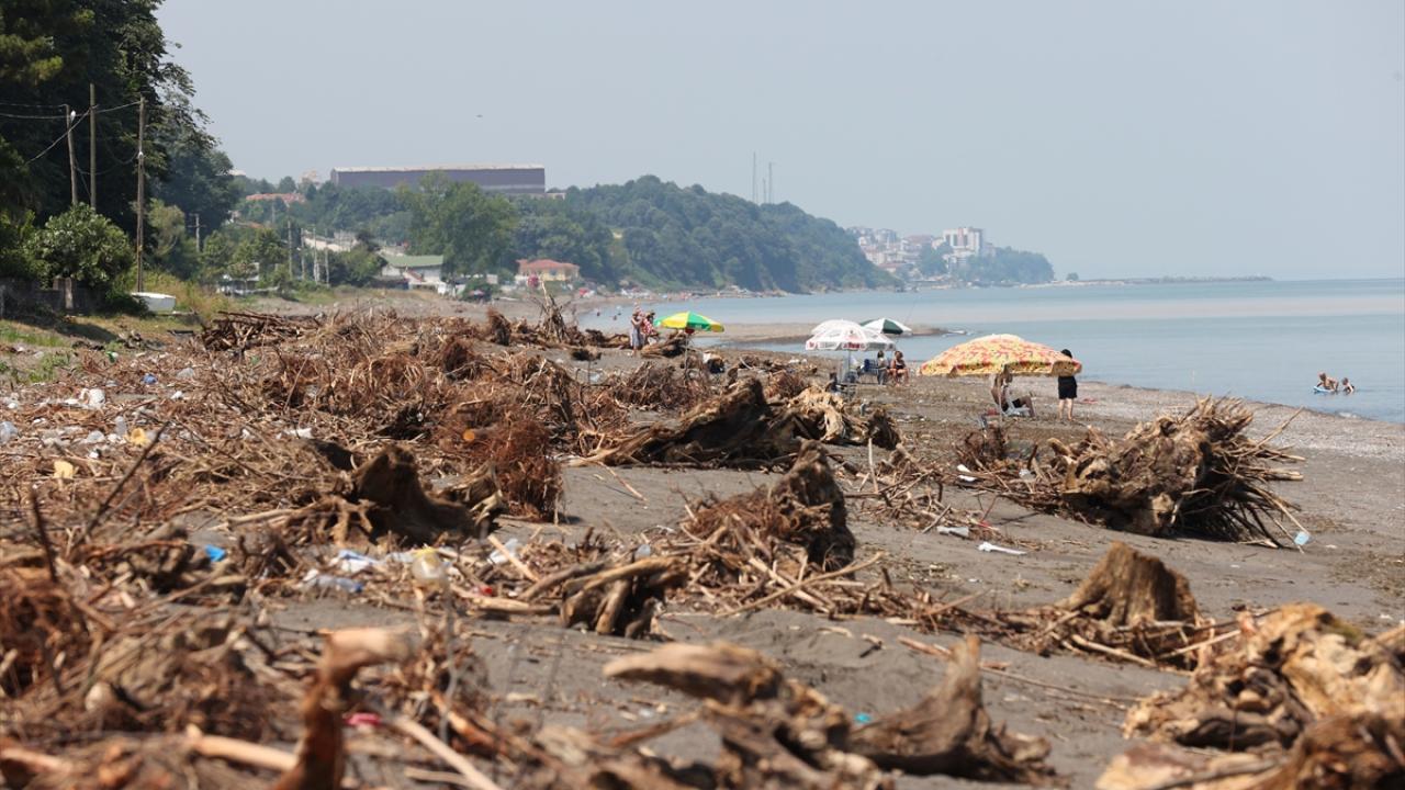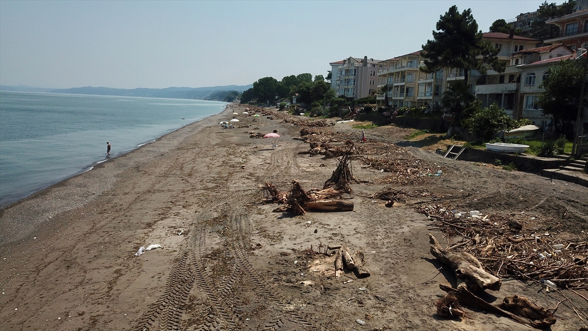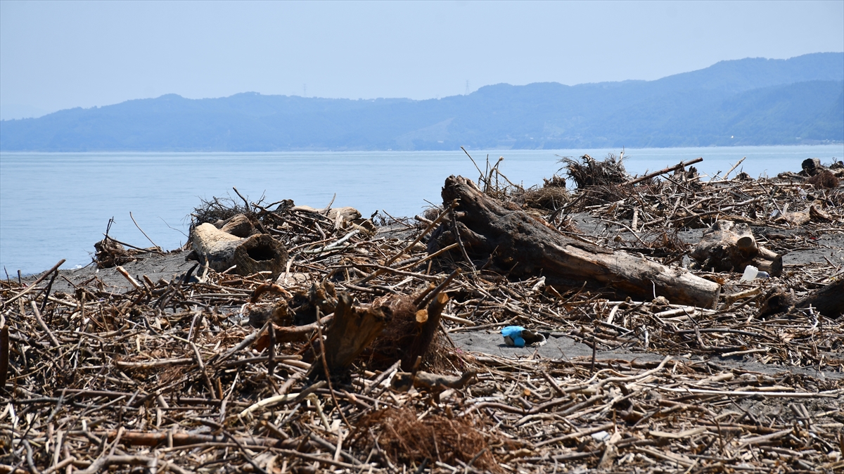 Sağanağın ardından meydana gelen sel ve taşkınlardan etkilenen Düzce'nin kıyı kenti Akçakoca'da sahiller, derelerin taşıdığı ağaç parçalarıyla kaplandı.