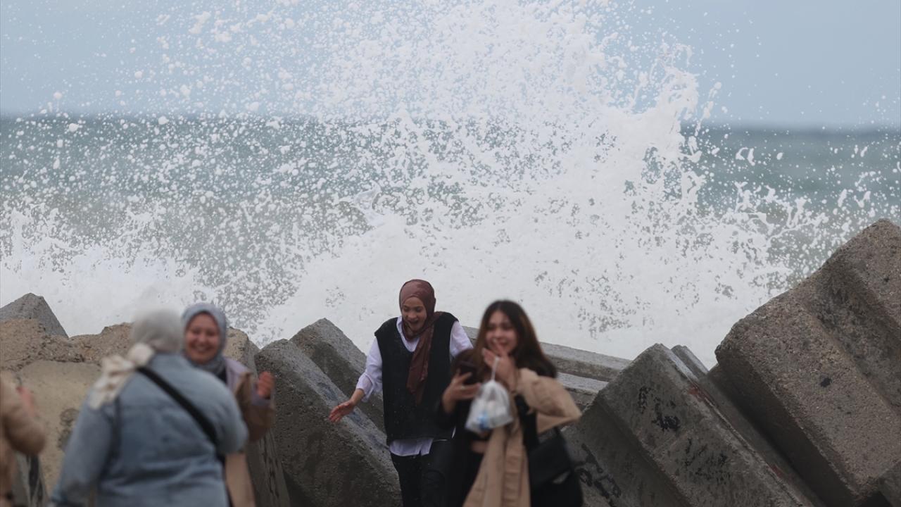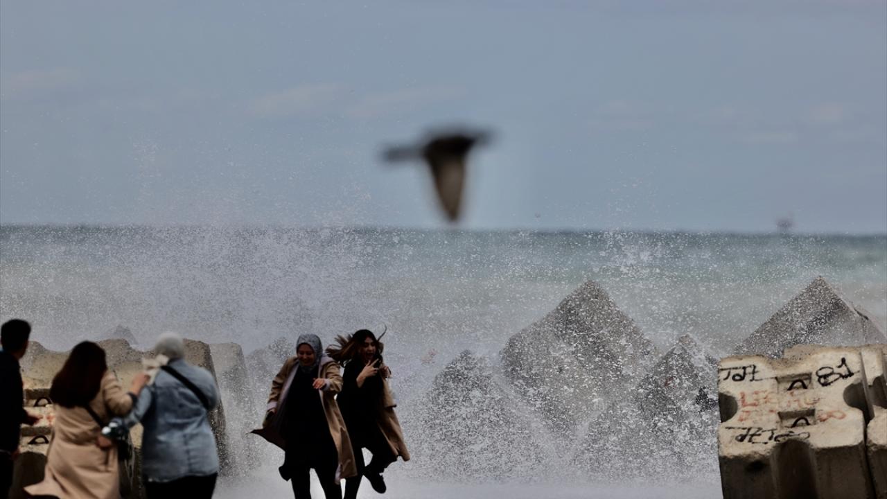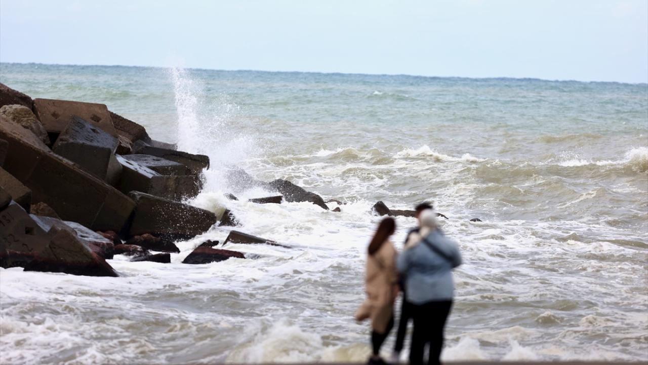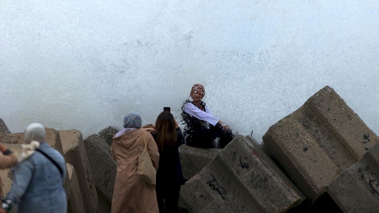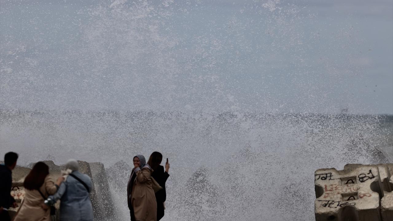 Yer yer yağmurun da etkili olduğu sahil kentinde, 5 ila 7 kilometre hızla esen rüzgar dolayısıyla dalga boyu 3 metreyi aştı.