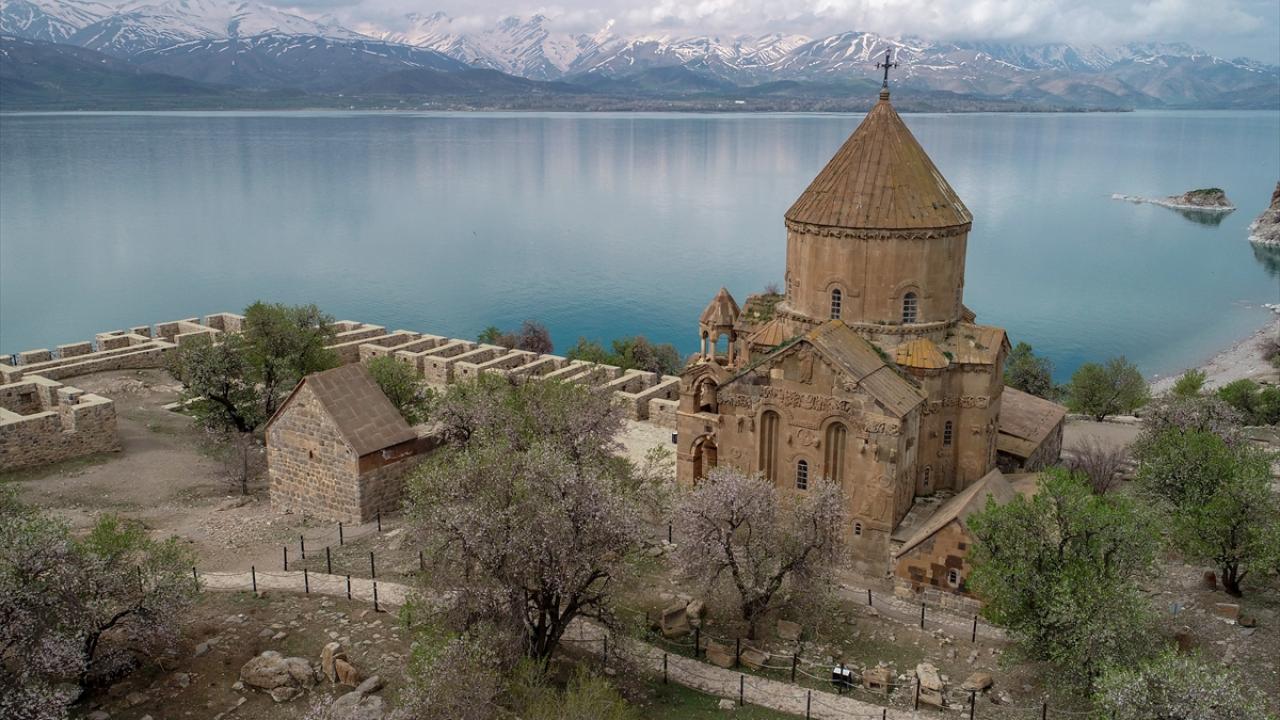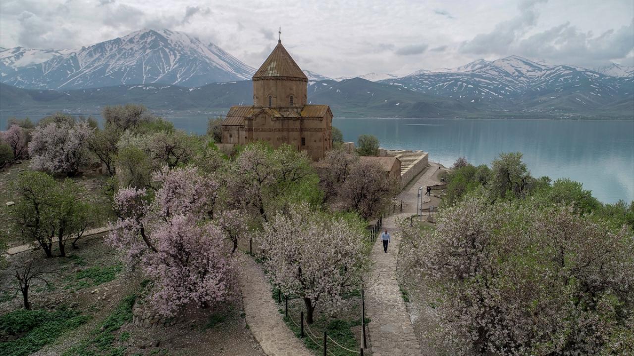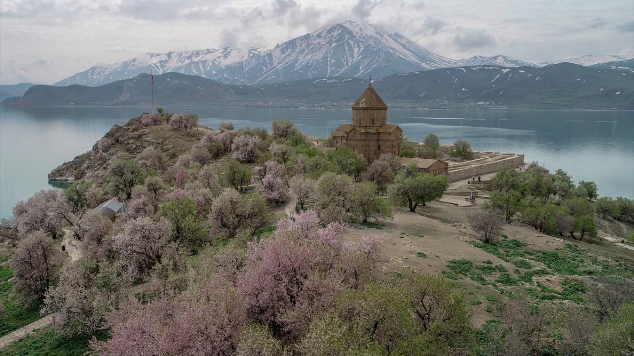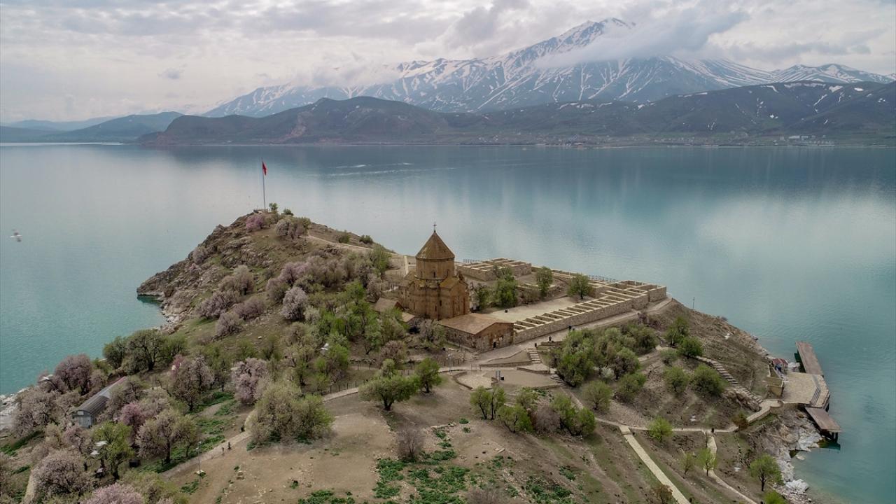 Gevaş ilçesinden 20 dakika süren tekne yolculuğunun ardından ulaşılan ada, Artos Dağı`nda henüz erimeyen kar örtüsü ve badem ağaçlarının oluşturduğu renk cümbüşü ile güzelliğine güzellik katıyor.