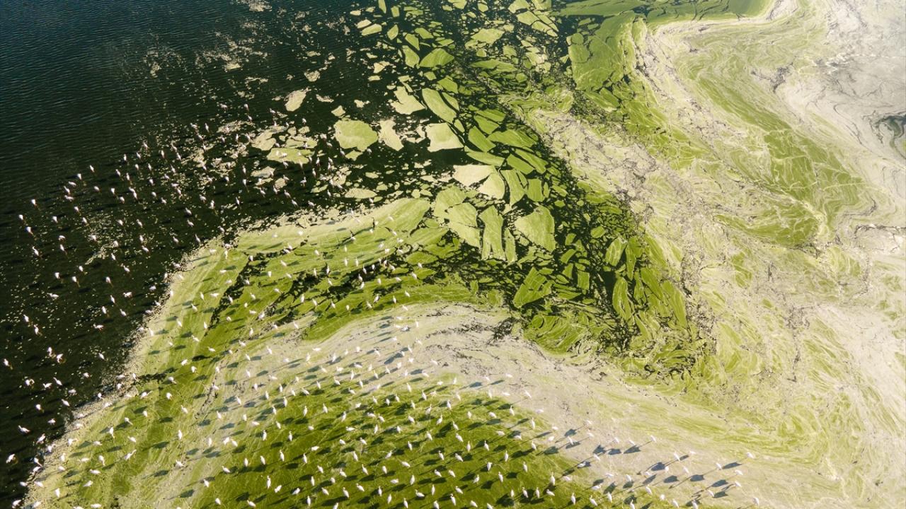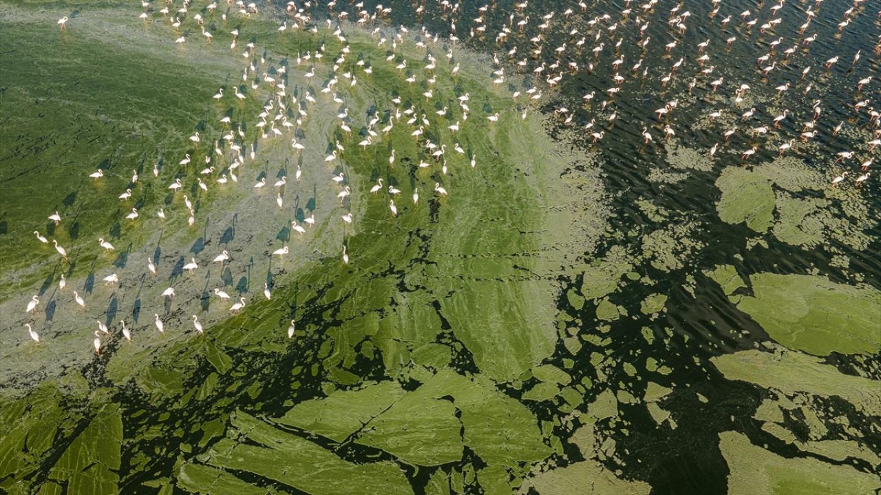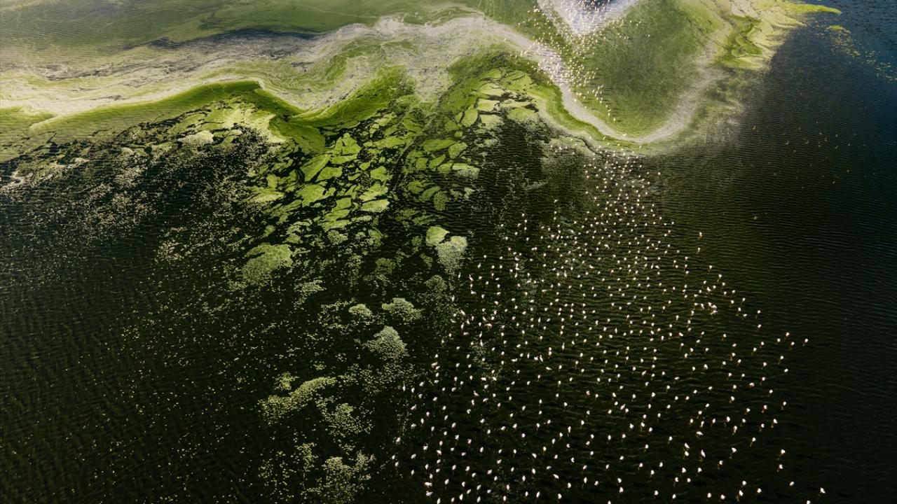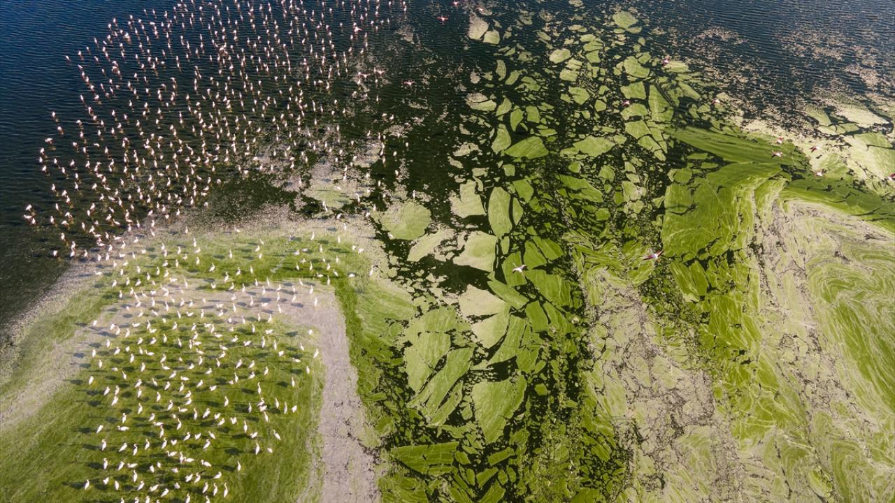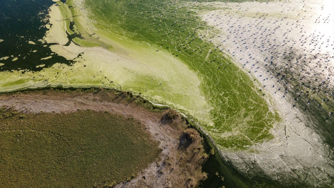 Alglerin çoğalmasıyla gölde oluşan yeşil doku, doğal yaşamla birlikte havadan görüntülendi.