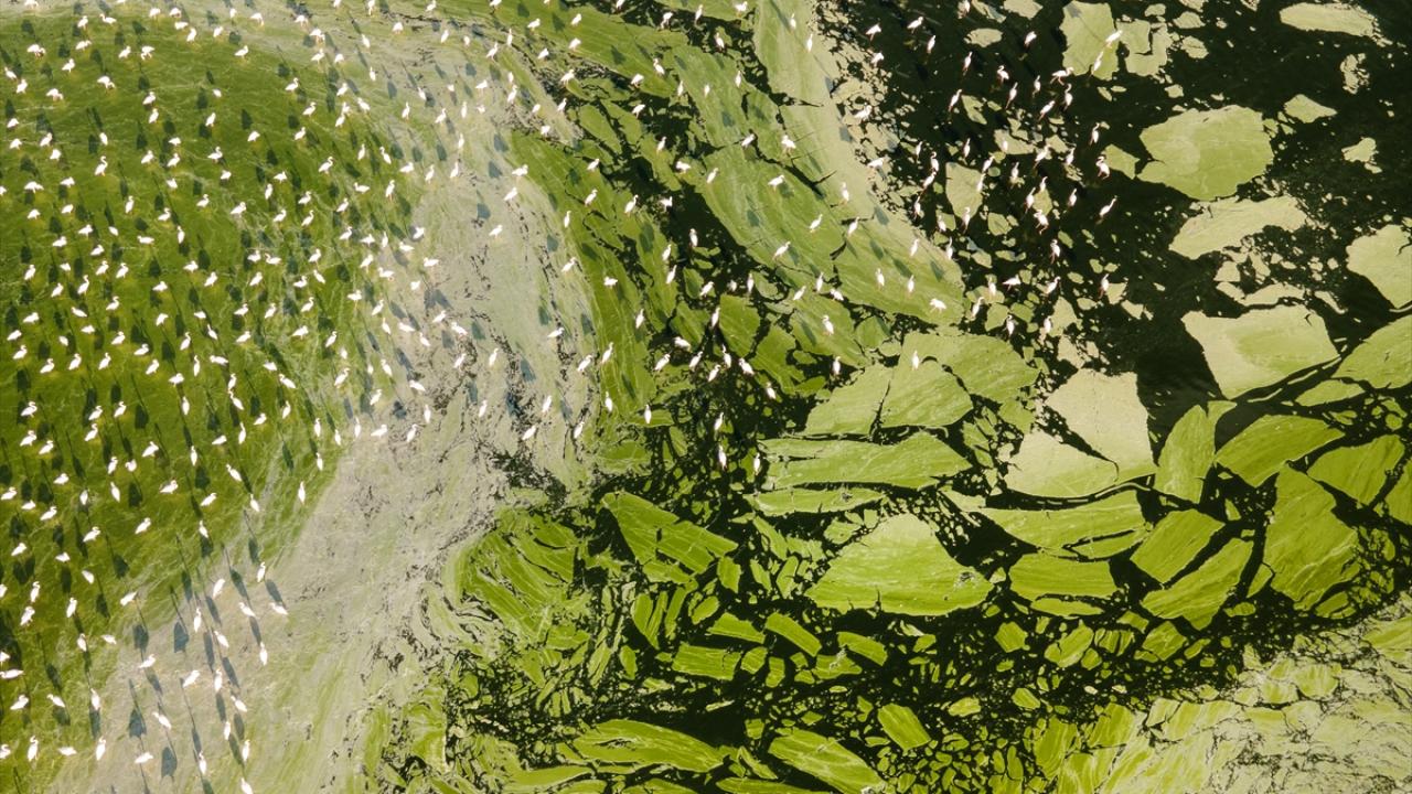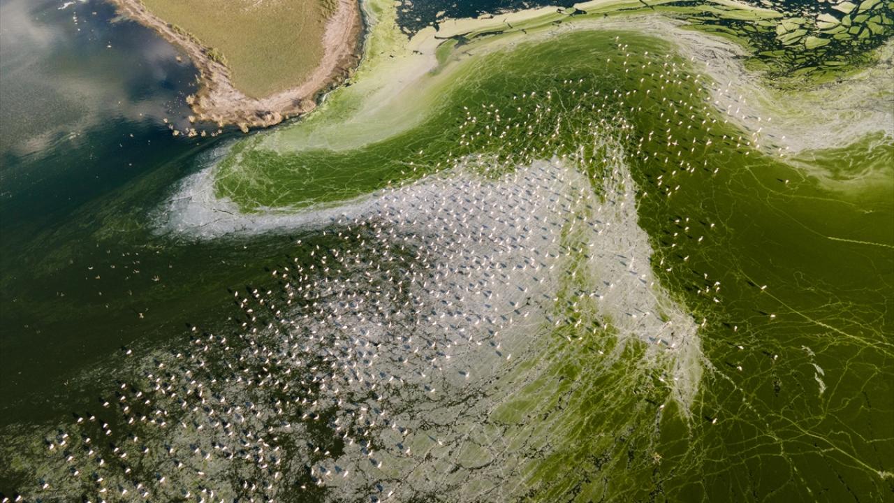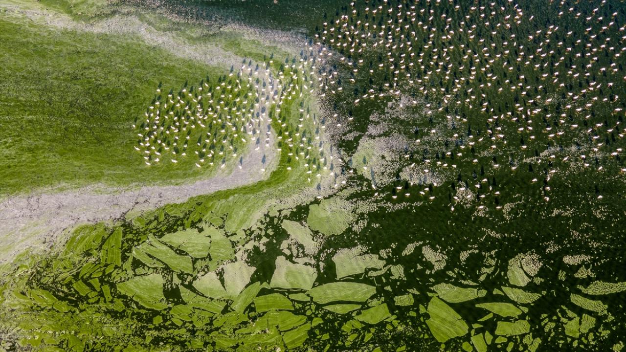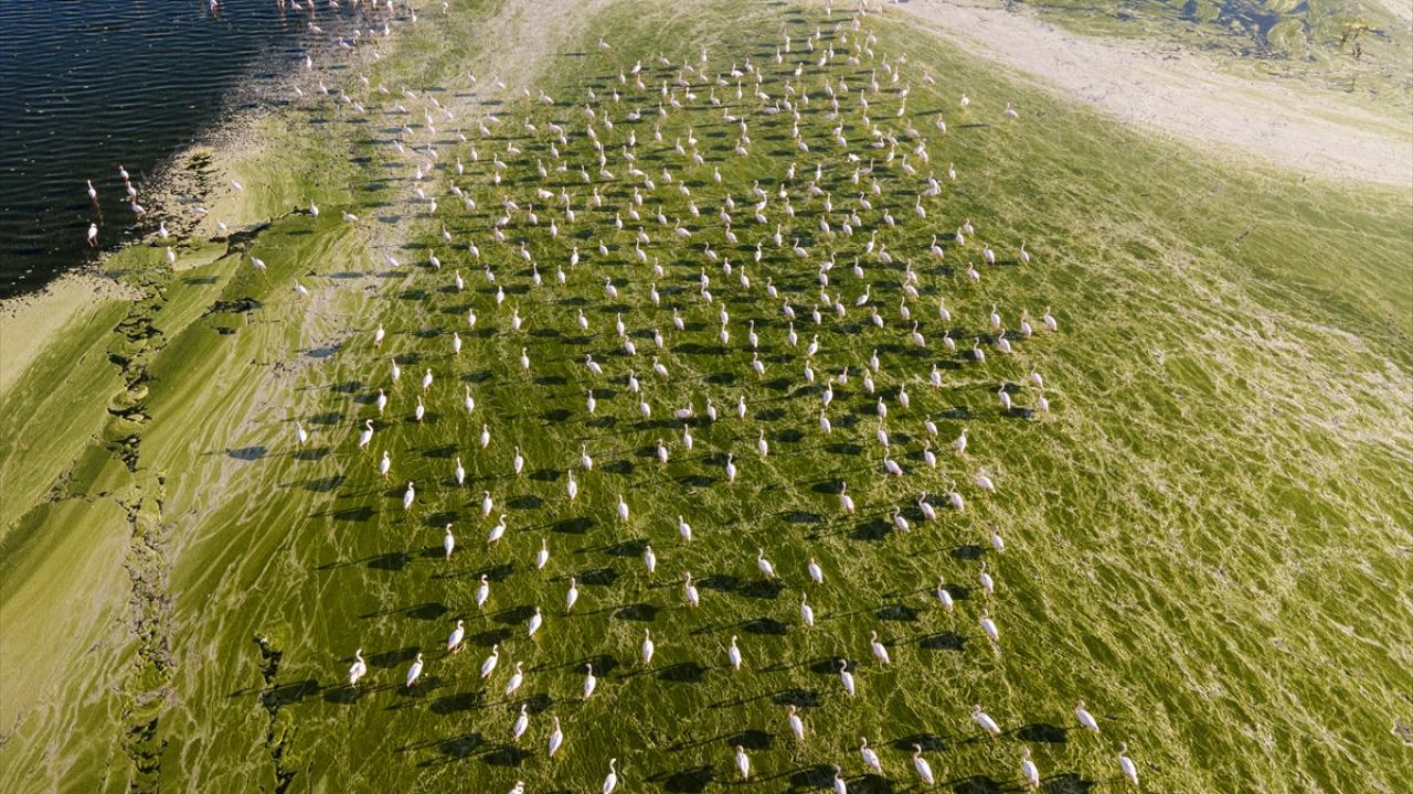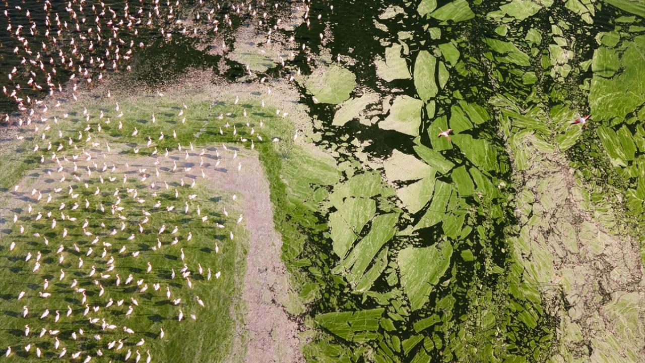 Alglerin çoğalmasıyla gölde oluşan yeşil doku, doğal yaşamla birlikte havadan görüntülendi.