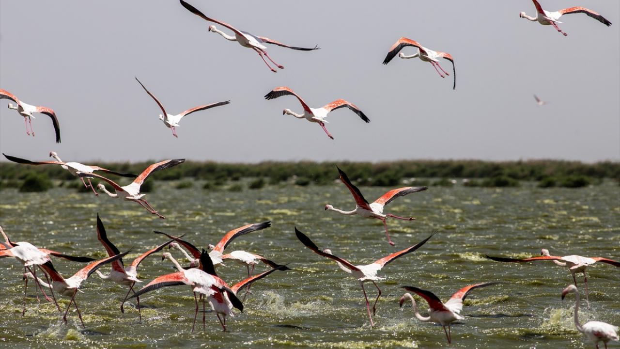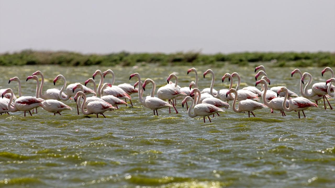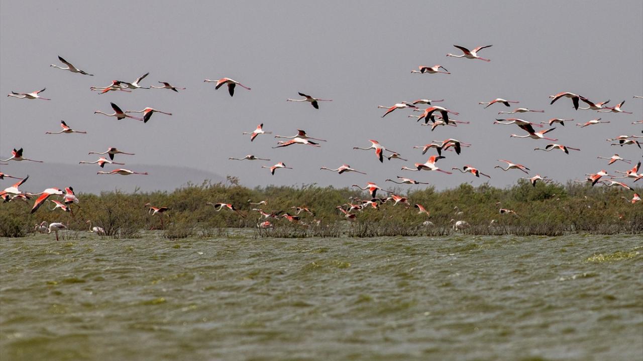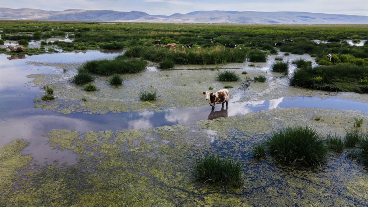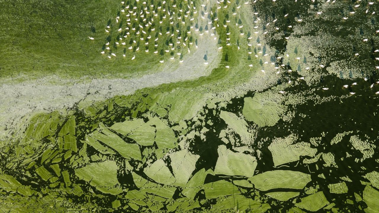 Alglerin çoğalmasıyla gölde oluşan yeşil doku, doğal yaşamla birlikte havadan görüntülendi.