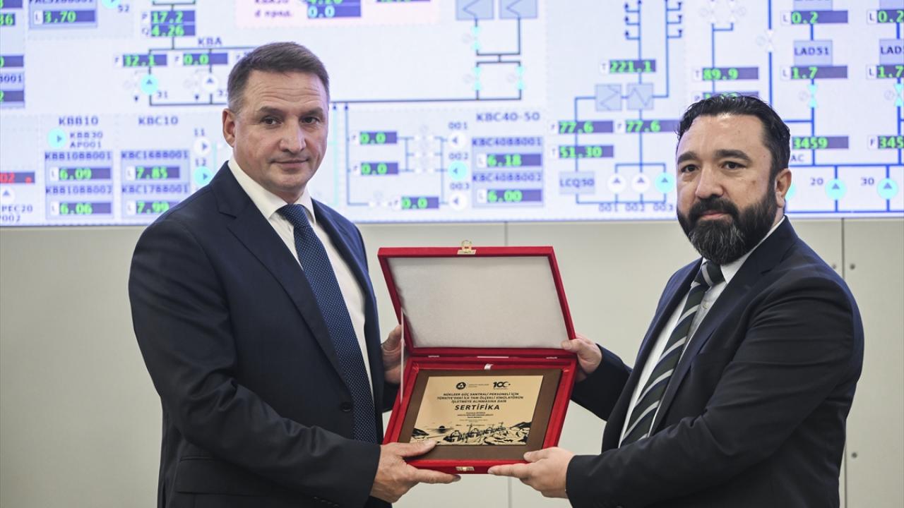 Konuşmaların ardından Akkuyu Nükleer AŞ Genel Müdür Birinci Yardımcısı ve NGS Yapı İşleri Direktörü Sergey Butckikh, Türkiye`deki ilk tam ölçekli simülasyon merkezinin devreye alınmasına ilişkin sertifikayı Sarı`ya takdim etti.