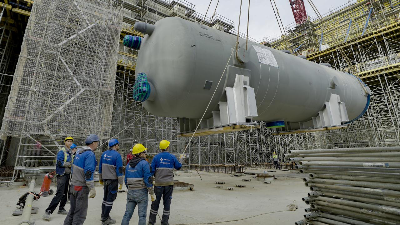 "Besleme suyu depolama tankı, Doğu Kargo Terminali`nde yapılan boşaltmanın ve gerekli gümrük işlemlerinin ardından doğrudan türbin binasına taşındı. Özel destek yapıların montajının ardından, uzman ekip tankı nihai konumuna yerleştirerek tank gövdesinin iki parçasını kaynakla birleştirecek. Aynı anda makine dairesinin duvarlarının betonlama çalışmaları da devam ediyor."