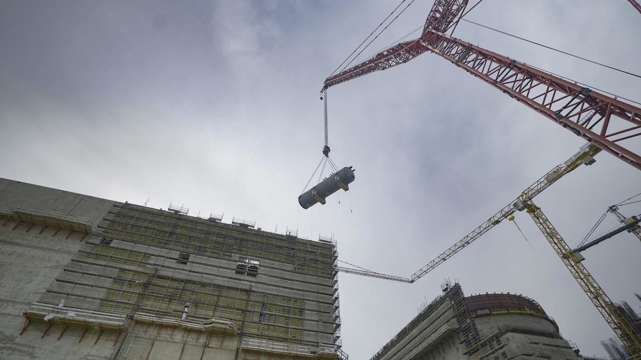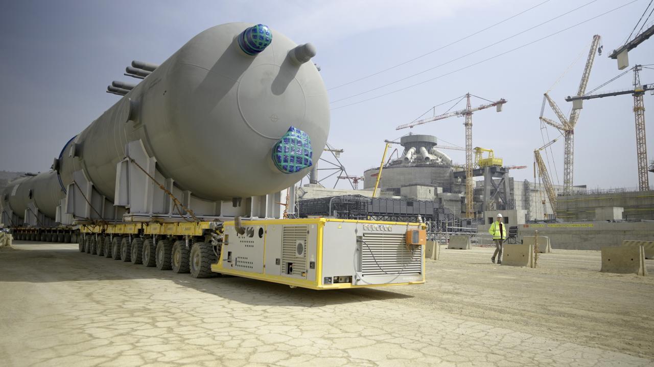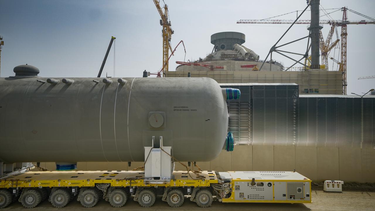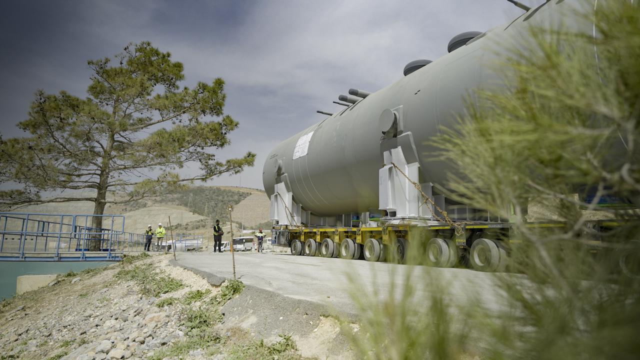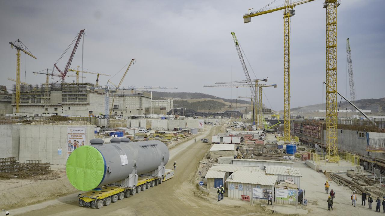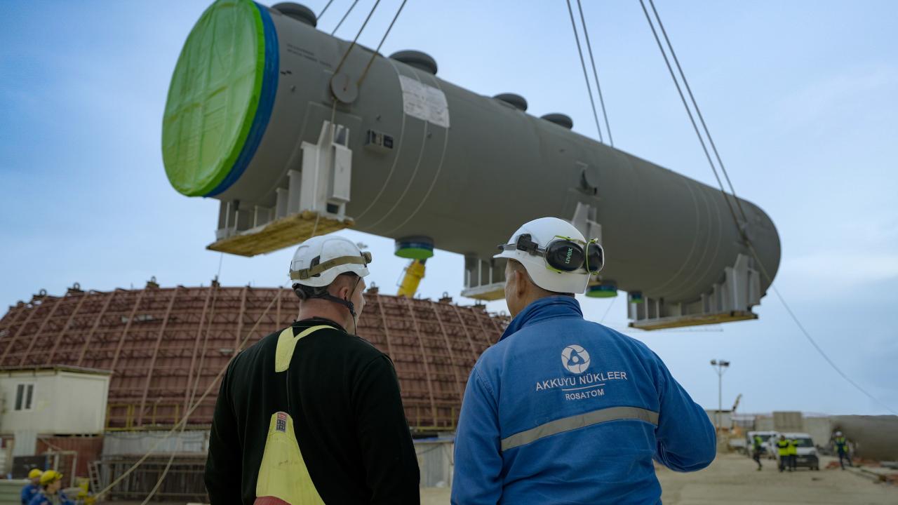 Akkuyu Nükleer AŞ`nin açıklamasına göre, türbin tesisatının ısı değişim ekipmanının önemli bileşeni olan tank, otomatik tekerlekli platformla türbin binasına getirildi.