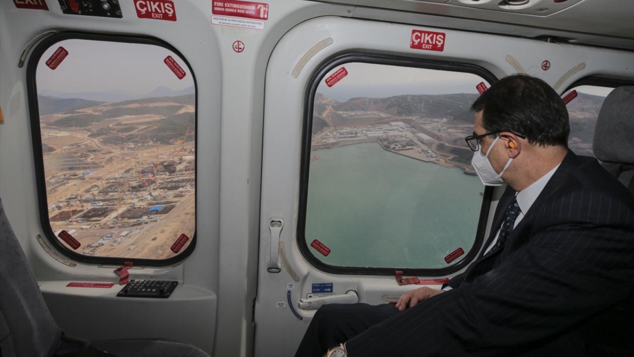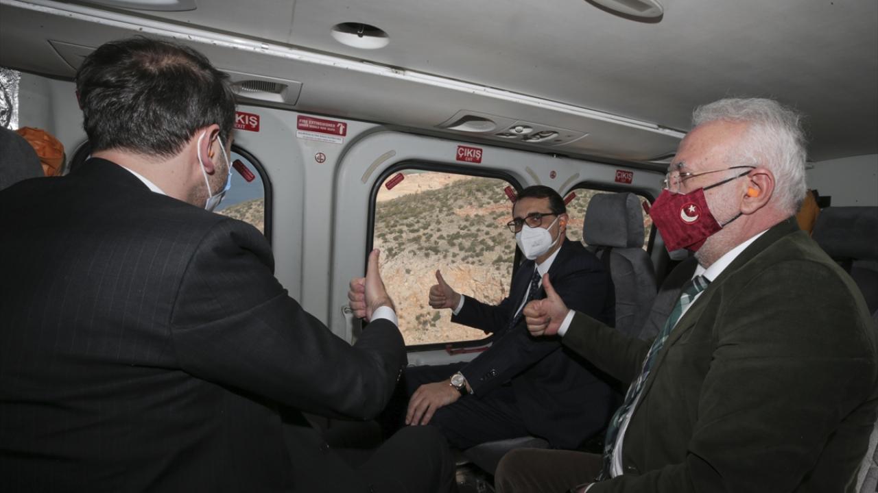 Bakan Dönmez ve Başkan Elitaş tören öncesi inşaat alanını havadan inceledi.
