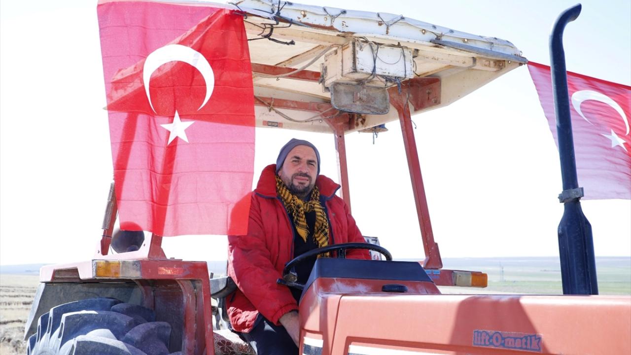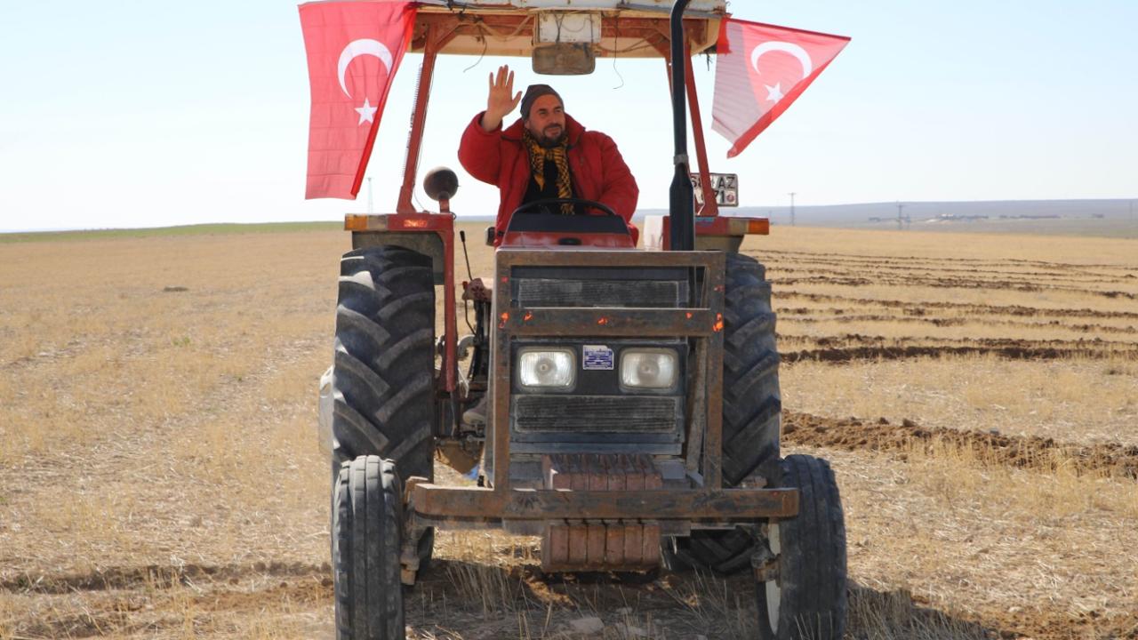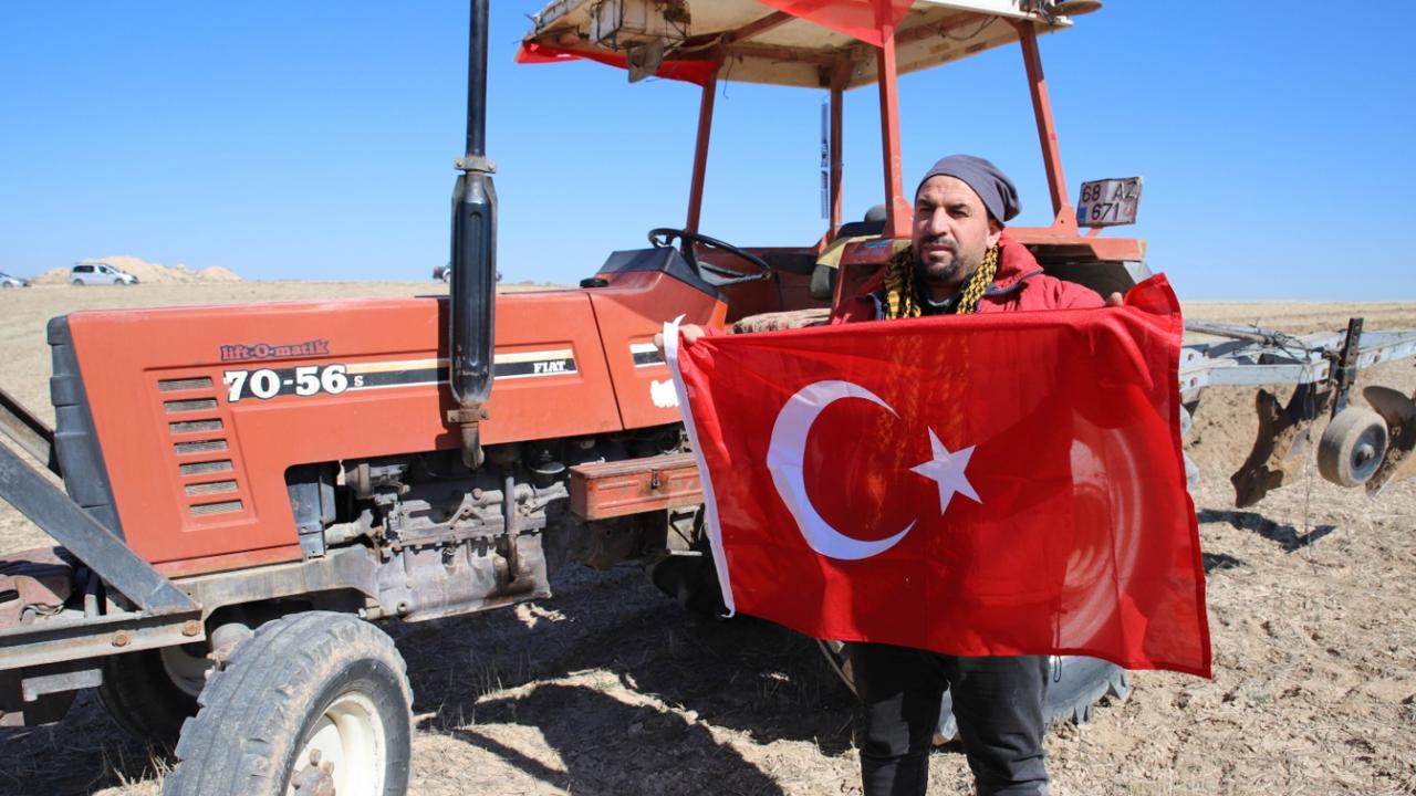 Filikçi, tarlasına traktörün pulluğuyla toprakta iz bırakarak "Korkma" yazdı.