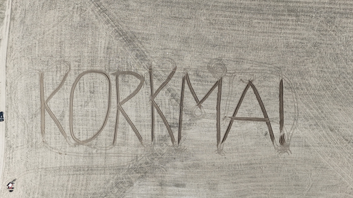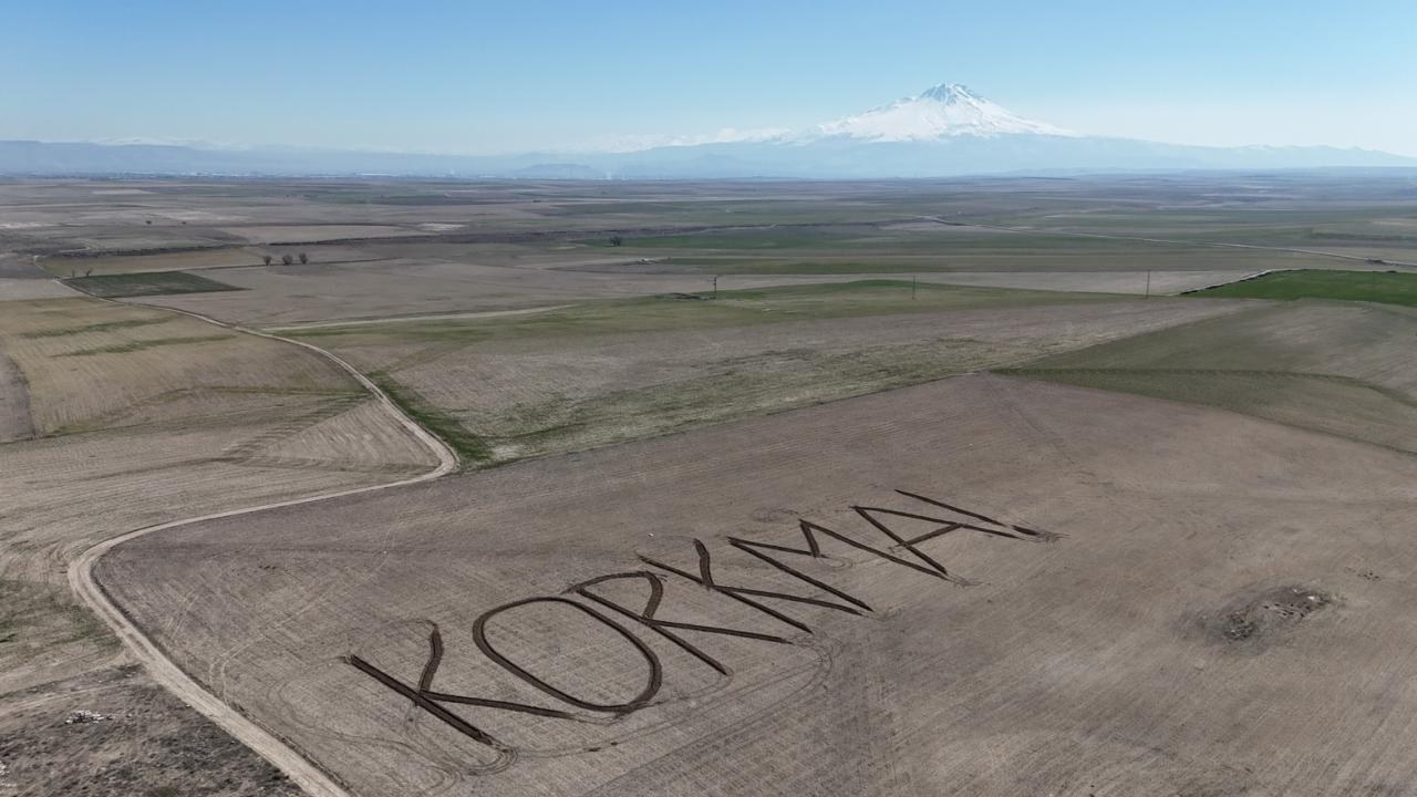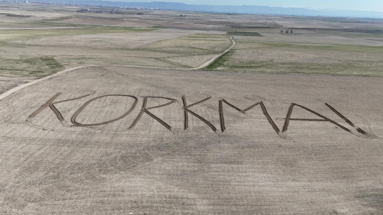 Çiftçinin yazdığı "Korkma" yazısı dronla görüntülendi.