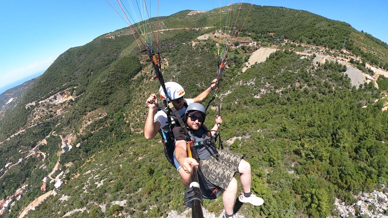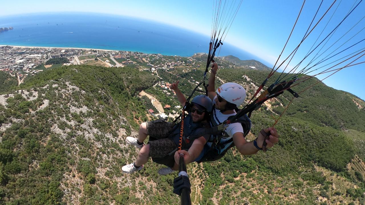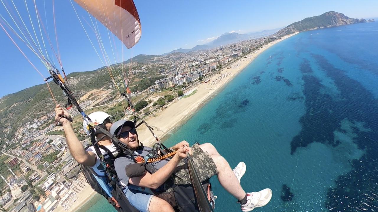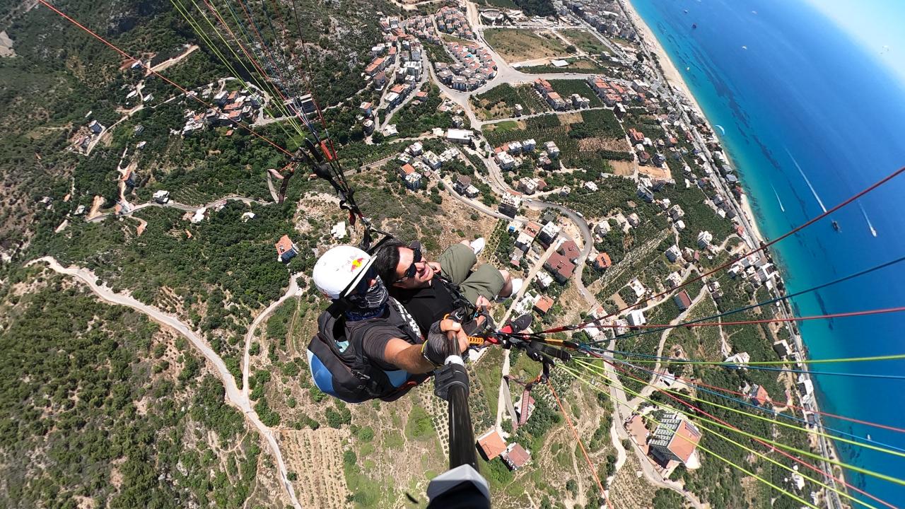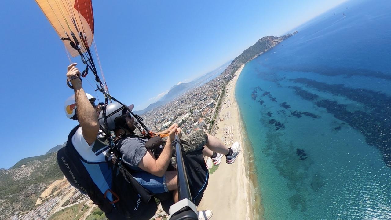 Yassıtepe`den tandem uçuşu yapan ziyaretçiler, ormanın, Alanya`nın ve masmavi Akdeniz`in üzerinden süzülerek ve havada aksiyon kamerasıyla çekim yaparak Kleopatra Plajı`na iniyor.