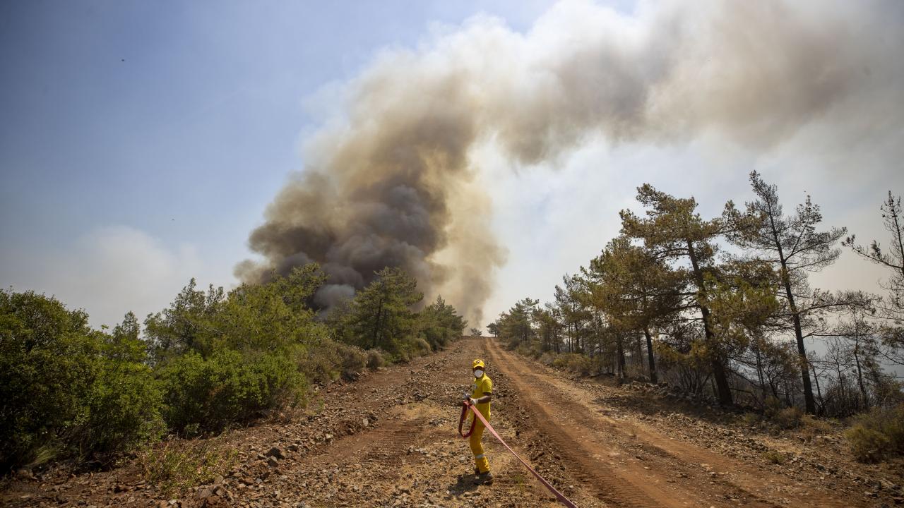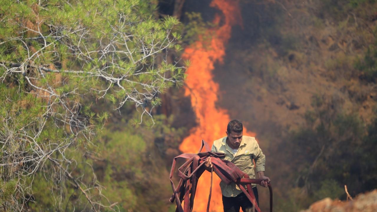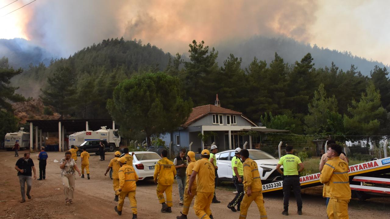 Muğla'nın Marmaris ilçesinde devam eden orman yangınında yılmadan çalışan orman işçileri ve itfaiye ekipleri, "yeşil vatan"ı alevlerden korumak için canla başla mücadele ediyor.