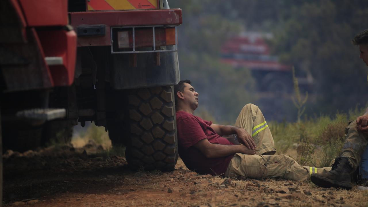 Ekipler, söndürdükleri bölgelerde ağaçları kurtarmanın huzuruyla kısa süreliğine dinleniyor.