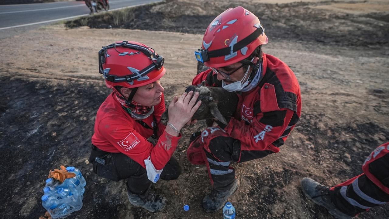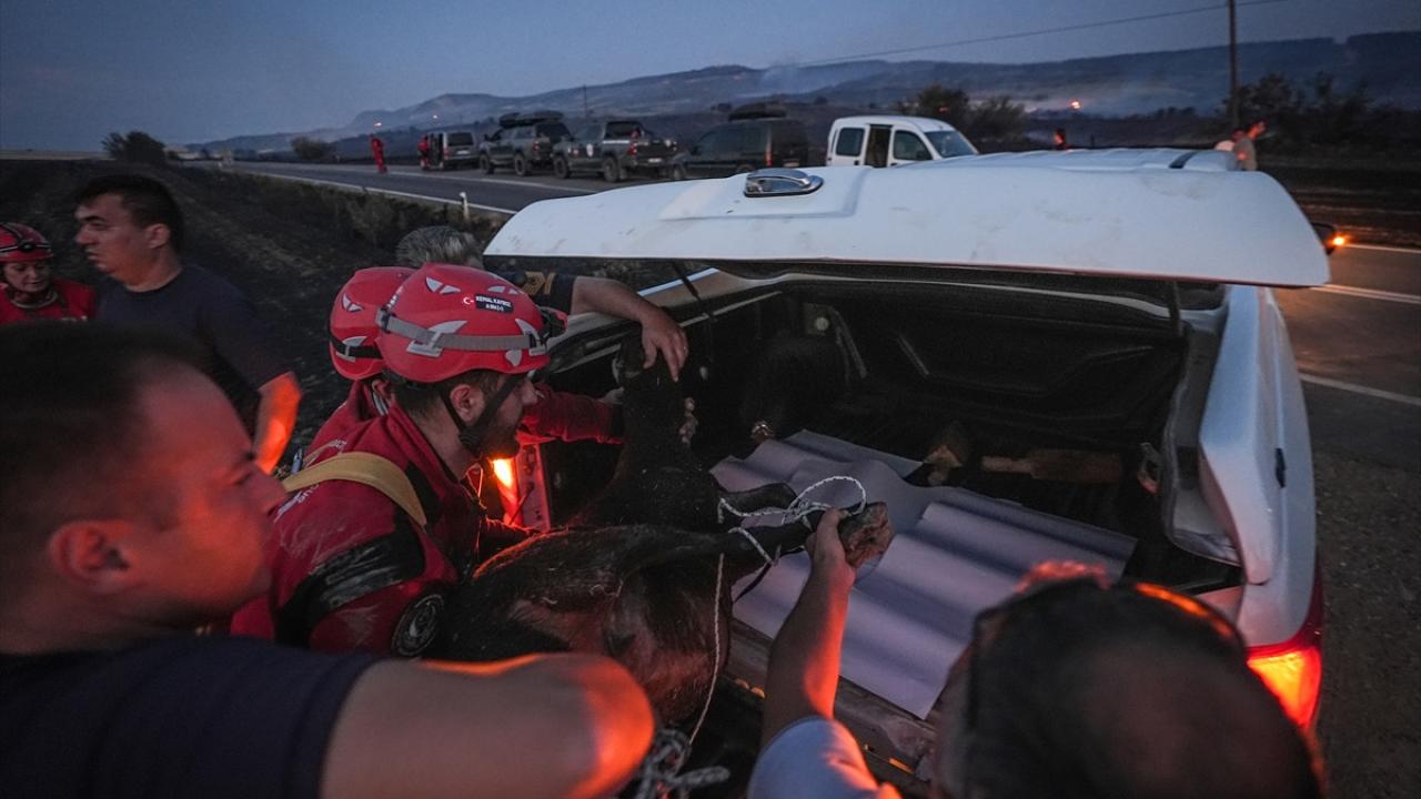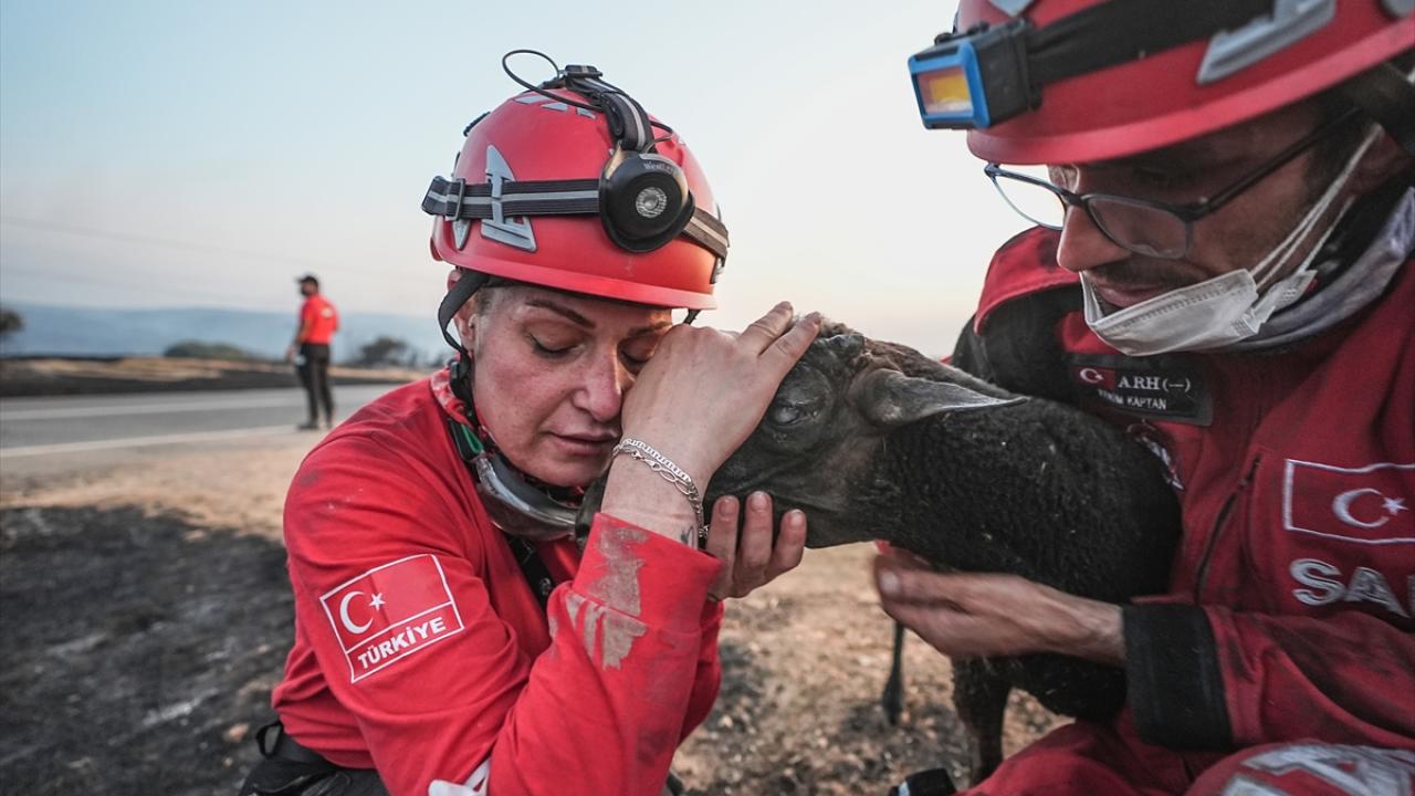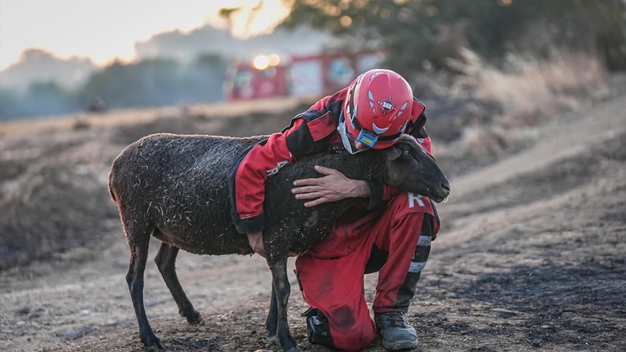 Çanakkale'nin Gelibolu ilçesindeki orman yangınında görevli arama kurtarma gönüllüleri, alevlerin sardığı çiftlikte mahsur kalan ve üzerinde yanık oluşan koyunu kurtardı.