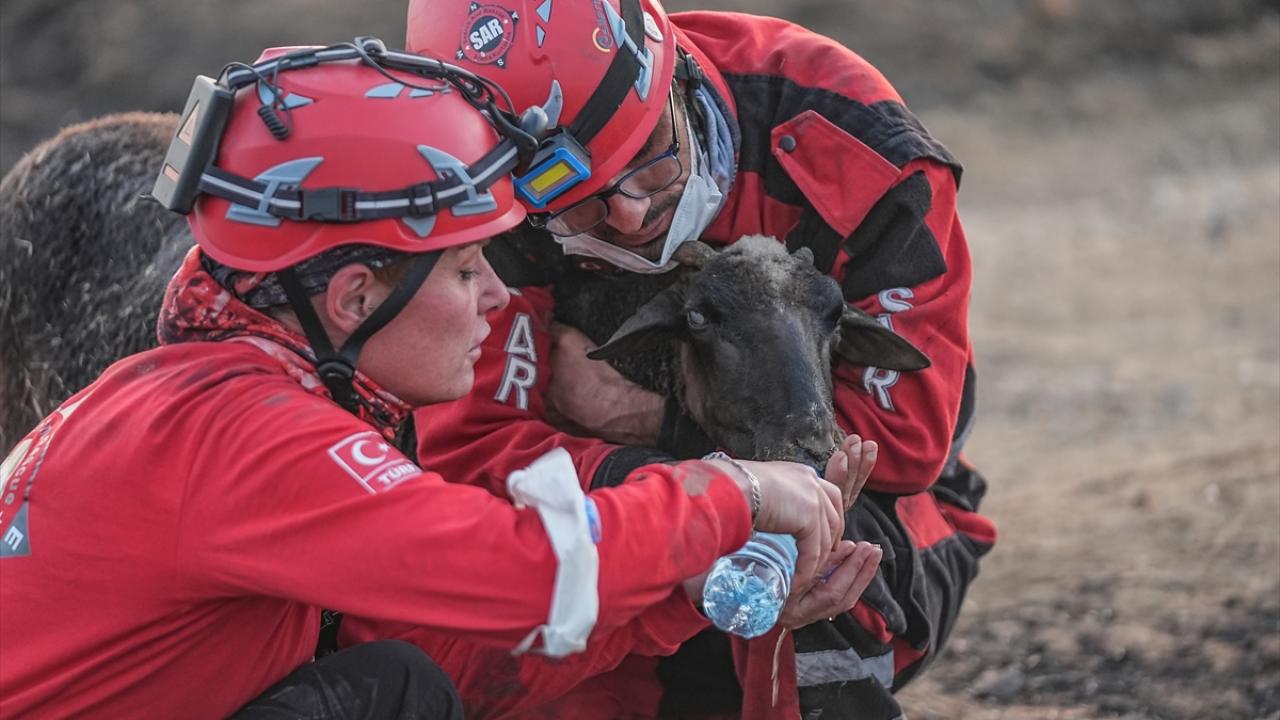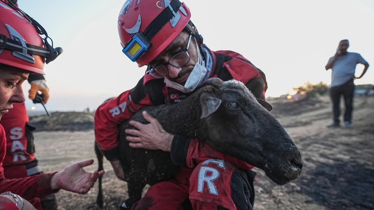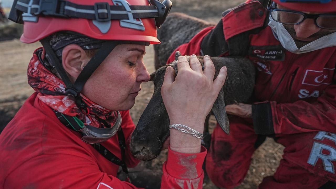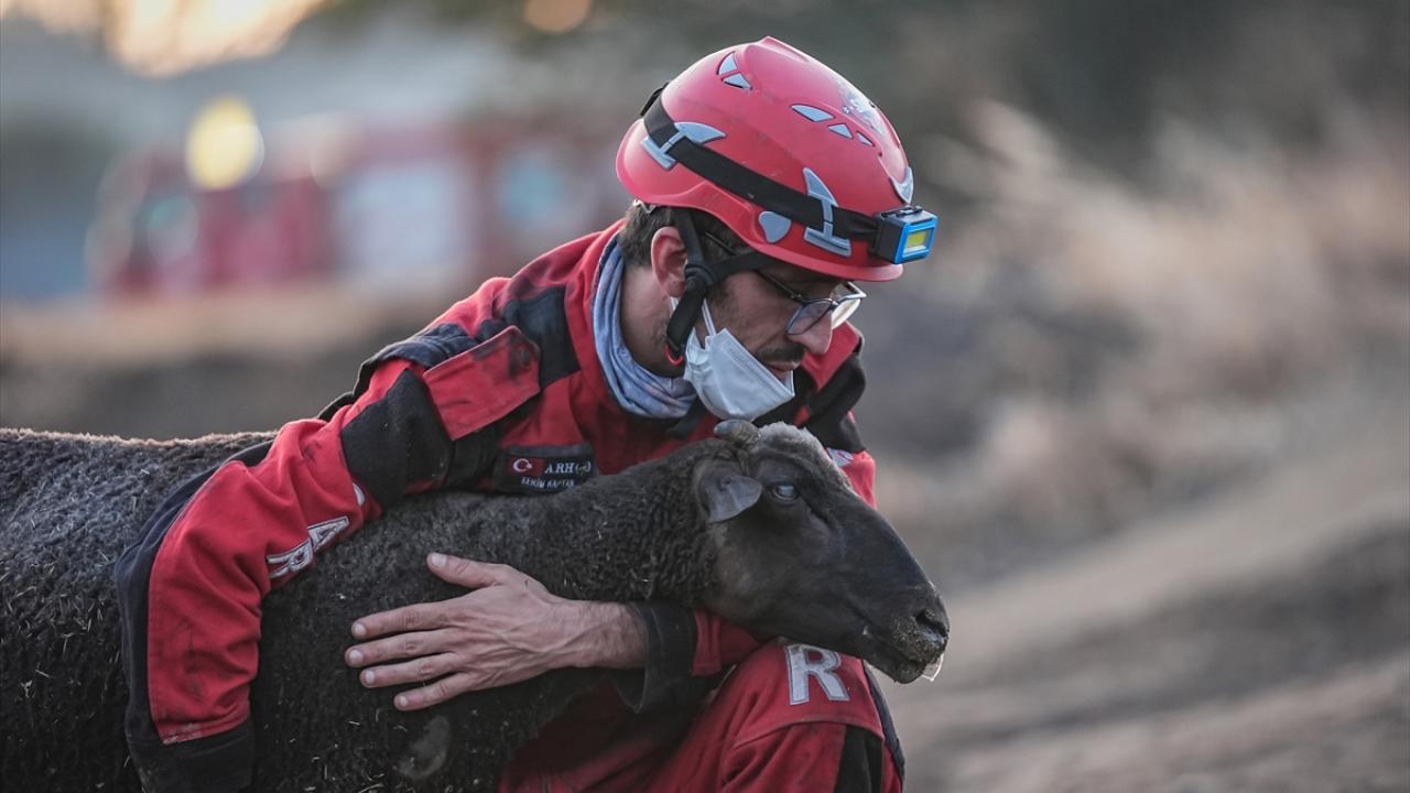 Ekip üyesi Kerem Kaptan ve Funda Baydilli, güvenli bölgeye alınan koyunun acısını sarılarak dindirmeye çalıştı, bir an olsun başından ayrılmadı.