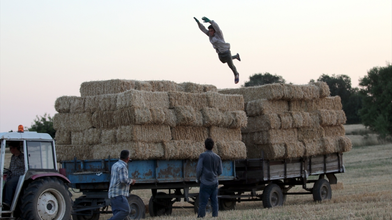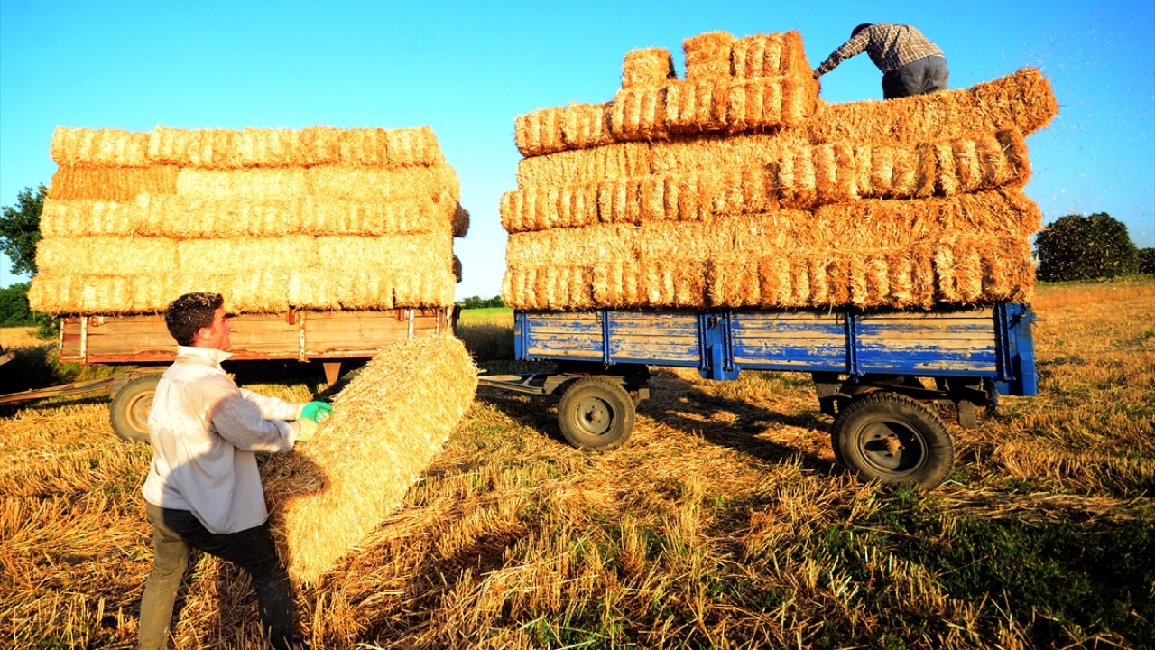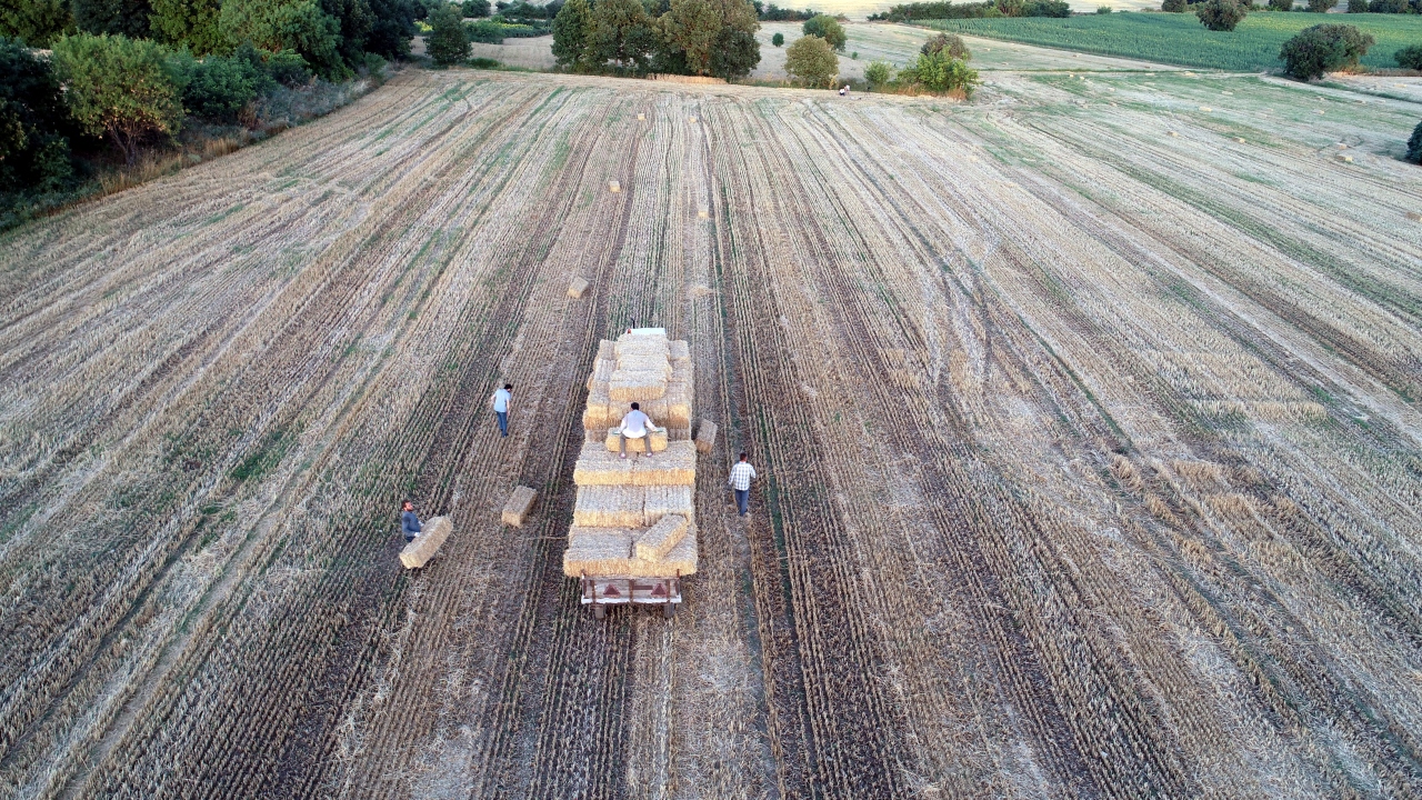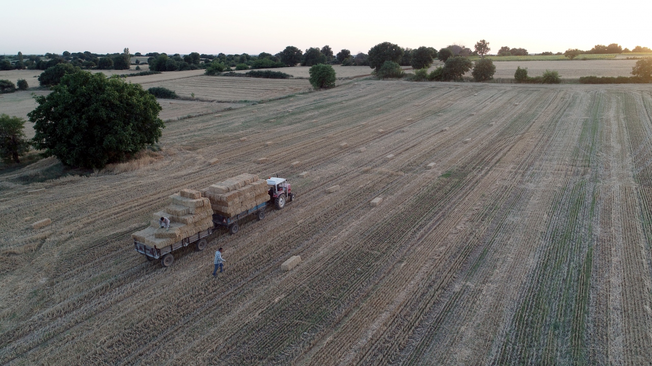 Türkiye`nin önemli tahıl üretim merkezlerinden Trakya`da, buğday tarlalarındaki hasat mesaisi, yerini saman balyası taşıma işine bıraktı.