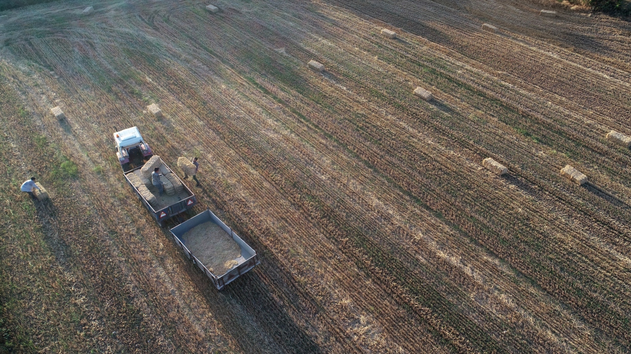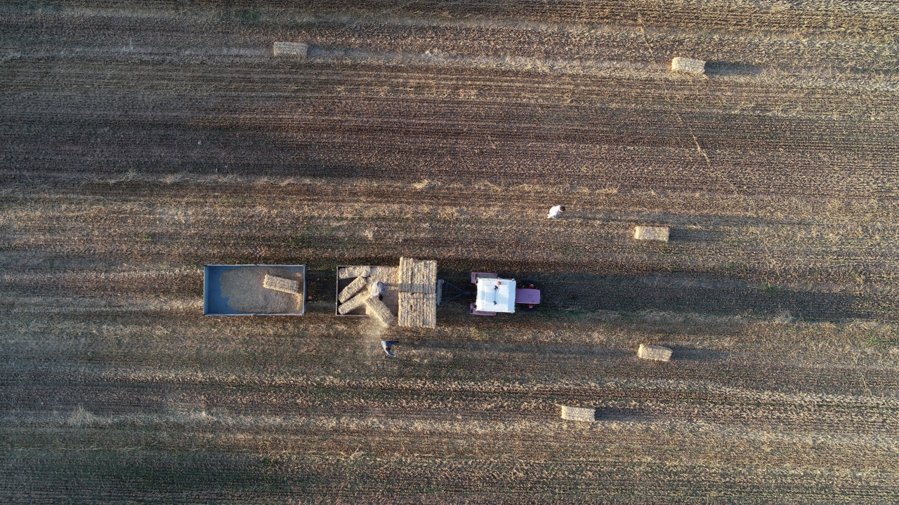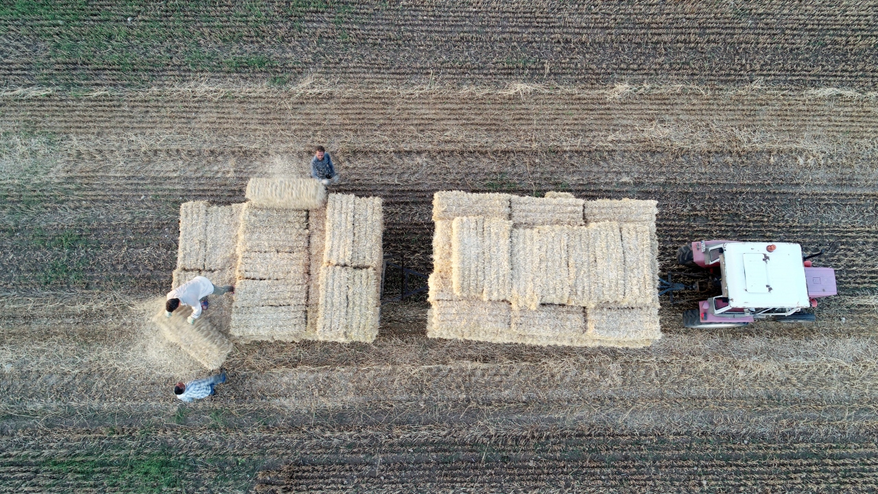 Balyaların tarladan ahırlara taşınması ise sezonluk çalışan emekçilere kalıyor. Ağır ağır ilerleyen traktör römorkunun peşinden giden işçiler, saman balyalarını var güçleriyle yüklerken, römork üzerindeki başka bir işçi de atılan balyaları düzenliyor.