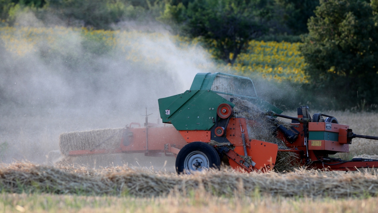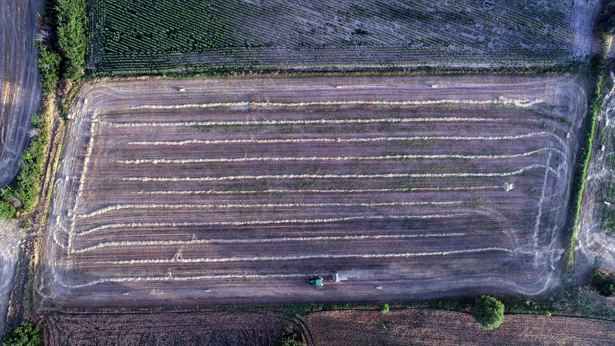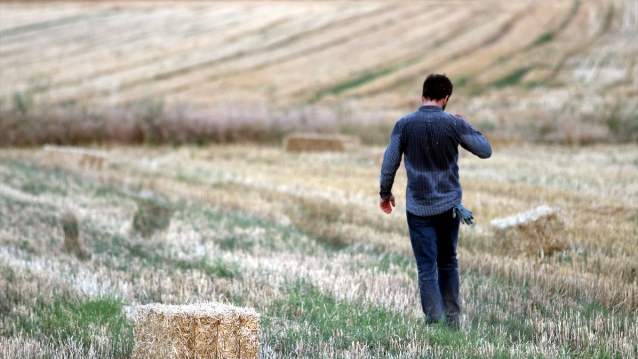 Buğday tarlaları biçildikten sonra hayvancılıkta yem olarak kullanılan samanlar bağlama makinesiyle bağlandıktan sonra tarlaya bırakılıyor.