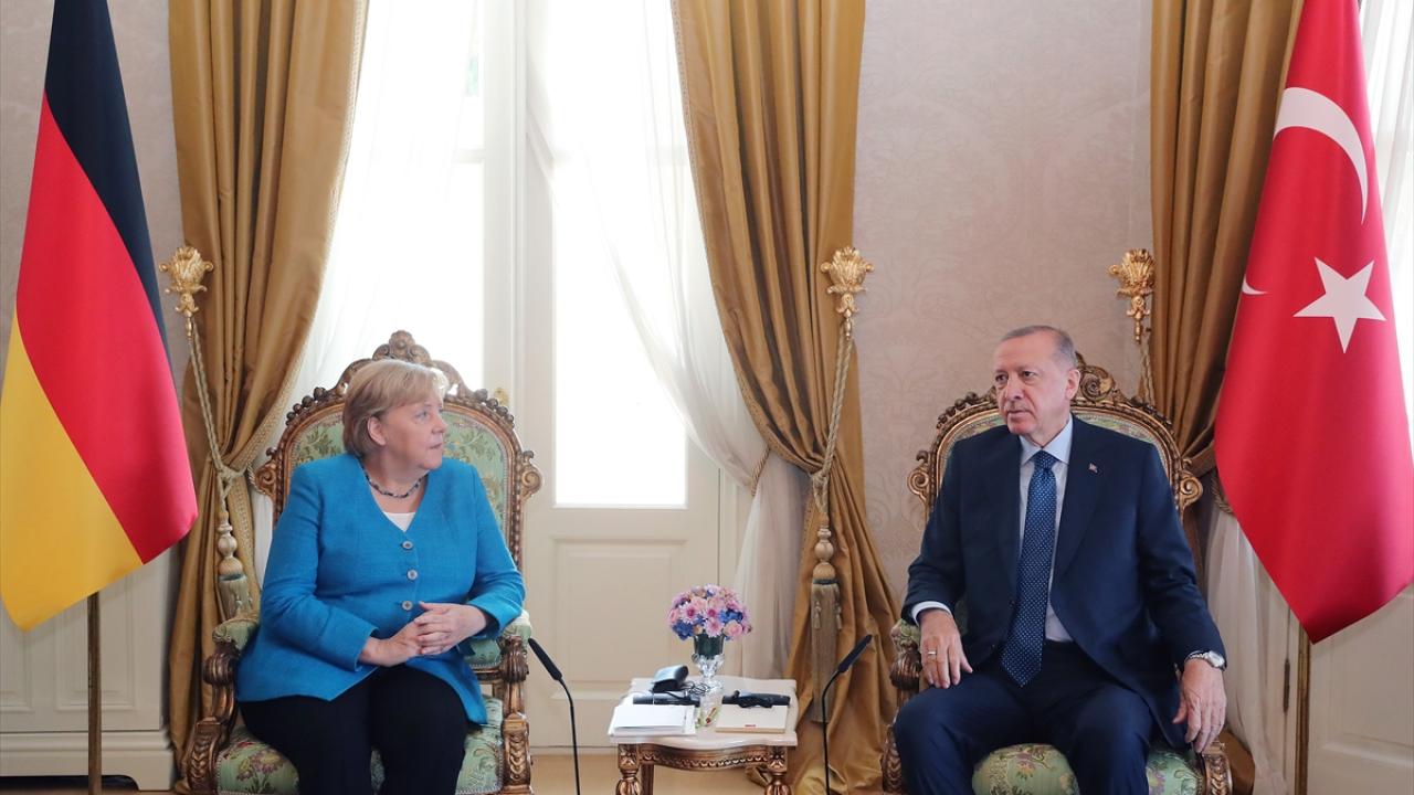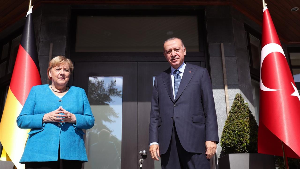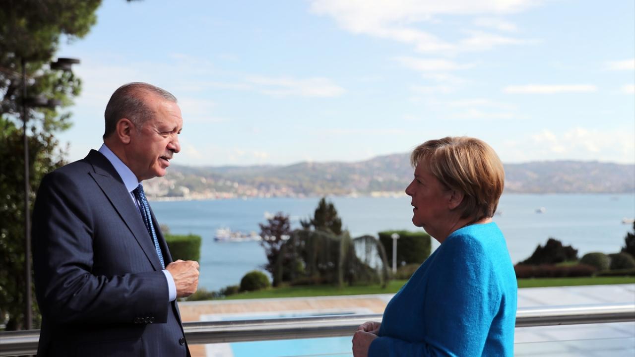 İkili görüşme öncesi köşkün sahil kısmındaki alana gelen Erdoğan ve Merkel, burada bekleyen basın mensuplarını selamladı.