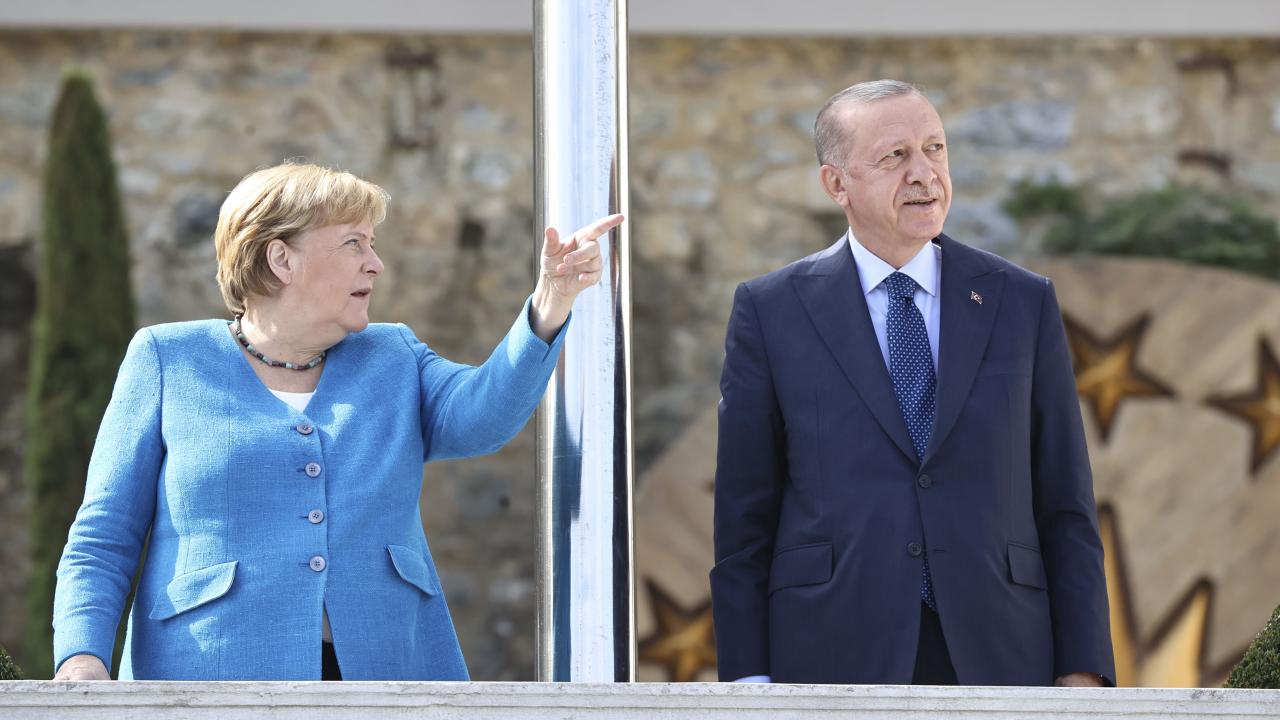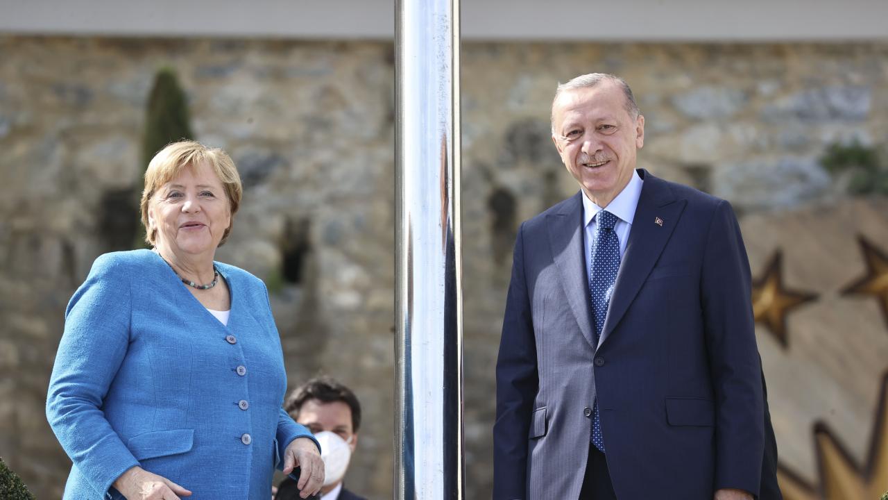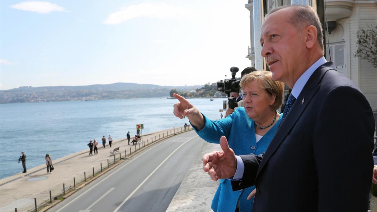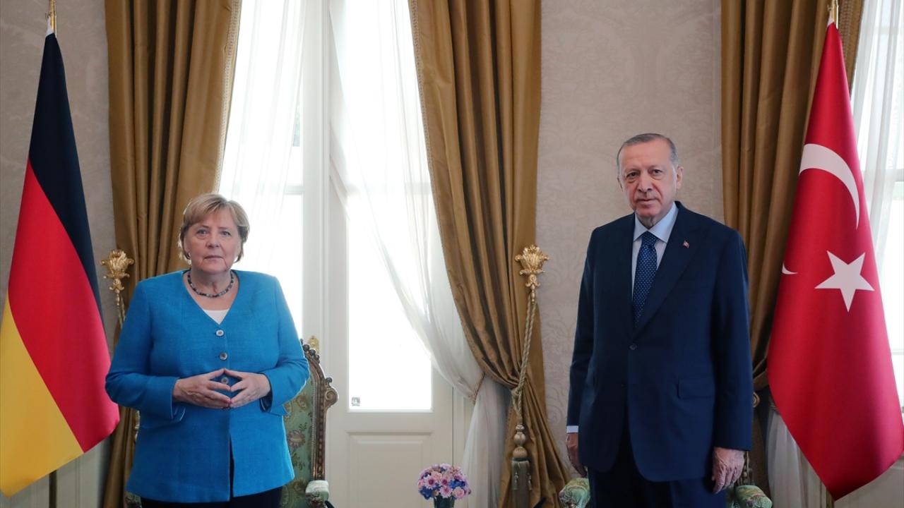 İkili görüşme öncesi köşkün sahil kısmındaki alana gelen Erdoğan ve Merkel, burada bekleyen basın mensuplarını selamladı.