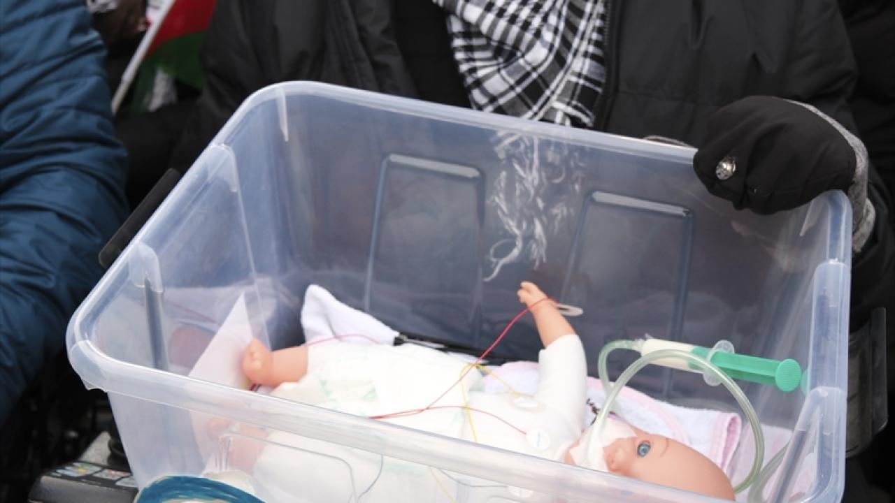 "Sessizliğini kınıyoruz", "Hastanelerin tahliye edilmesi ve bombalaması savaş suçudur", "Şimdi ateşkes", "İnsan görüyorum ancak insanlık görmüyorum" yazılı dövizler taşıyan göstericiler, "Filistin’e özgürlük", "Bombardımanı durdurun" ve "İsrail bombalıyor, Almanya ve ABD finanse ediyor" sloganları attı.