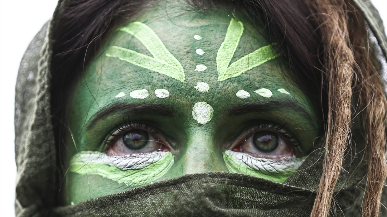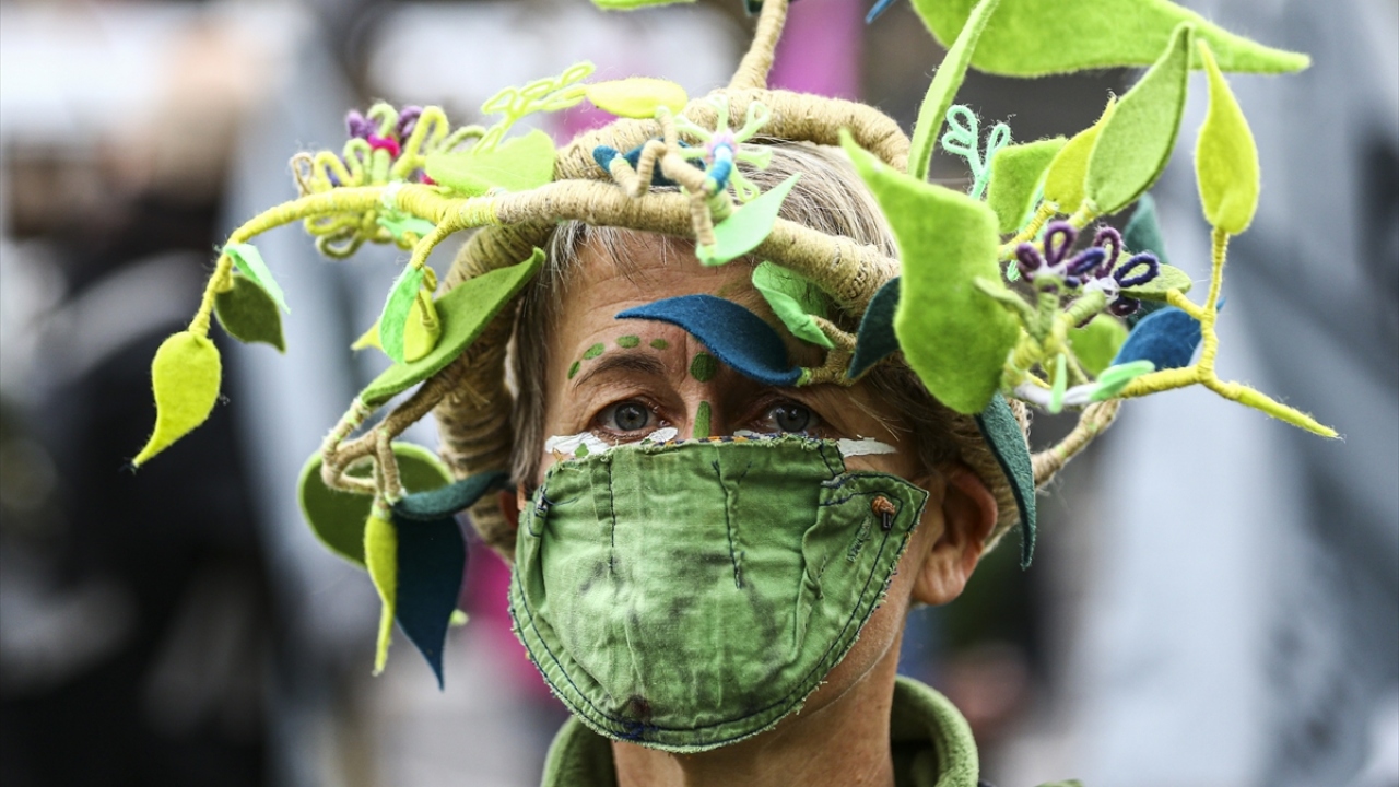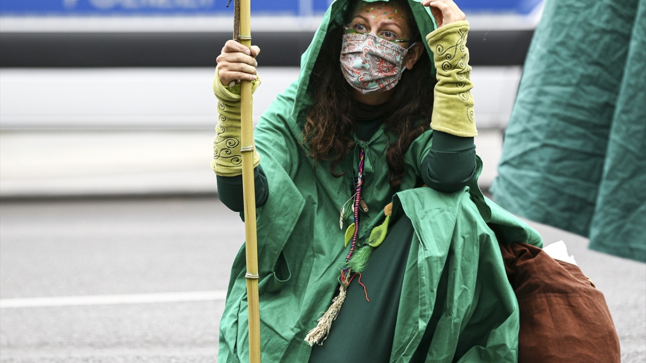 "Ölü ağaçların cenaze töreni" sloganıyla eylemlerini Tarım Bakanlığı önünde sürdüren göstericiler ağaç dallarını taşıyarak, ormanı simgeleyen yeşil giysiler giydi.
