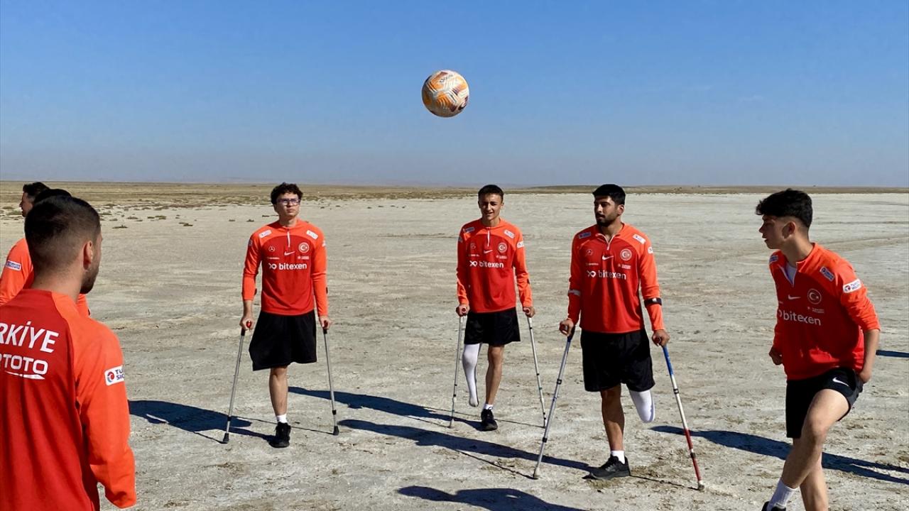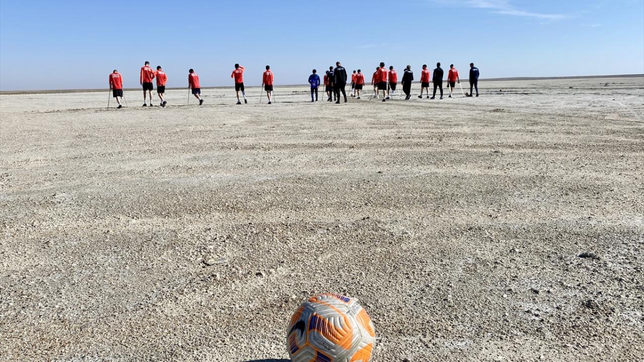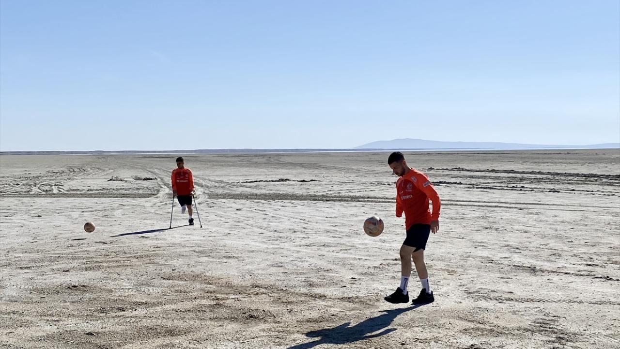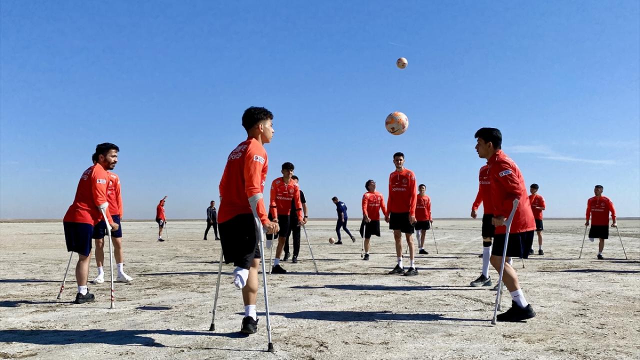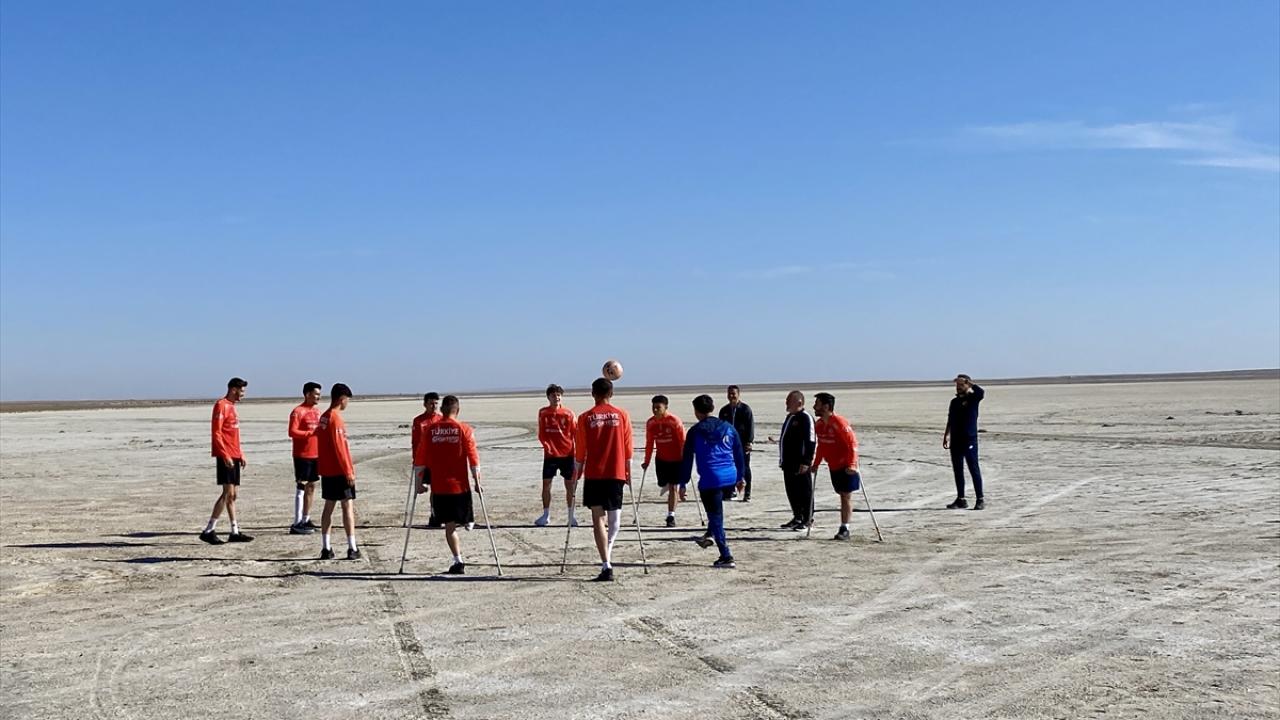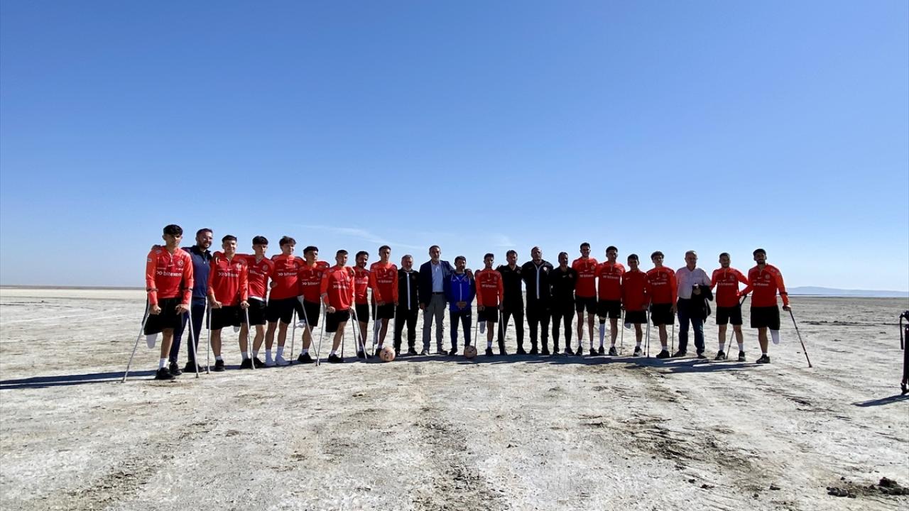 Arnavutluk`taki Balkan Şampiyonası`na Kırşehir`de hazırlanan Ampute Milli Futbol Takımı oyuncuları, kuraklığa dikkat çekmek için Seyfe Gölü`nün kuruyan yüzeyinde antrenman yaptı.