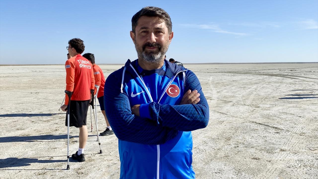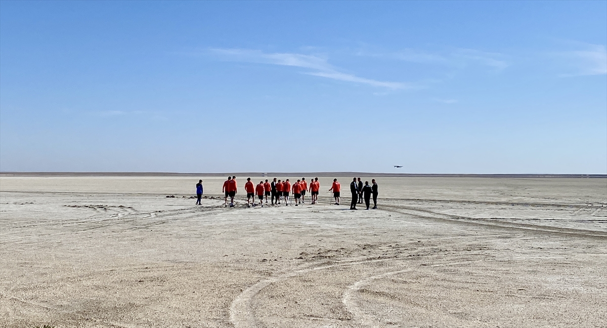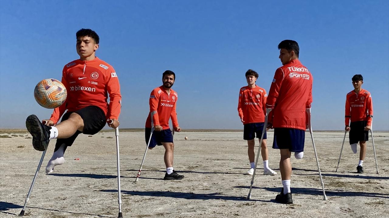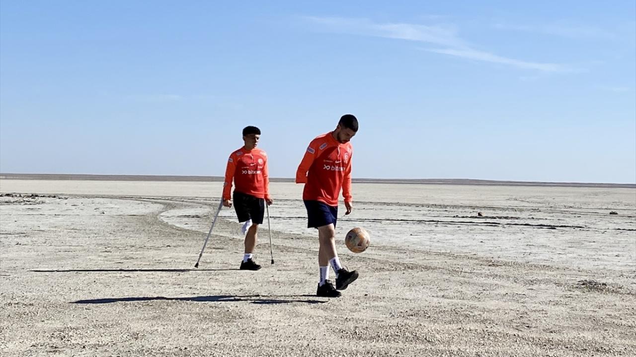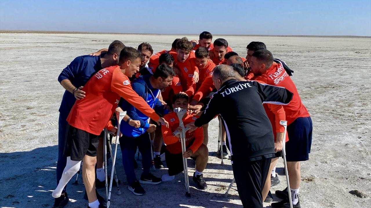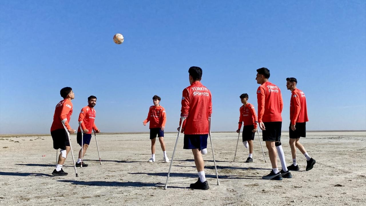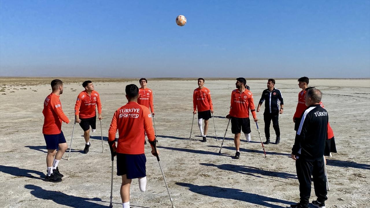Arnavutluk`taki Balkan Şampiyonası`na Kırşehir`de hazırlanan Ampute Milli Futbol Takımı oyuncuları, kuraklığa dikkat çekmek için Seyfe Gölü`nün kuruyan yüzeyinde antrenman yaptı.