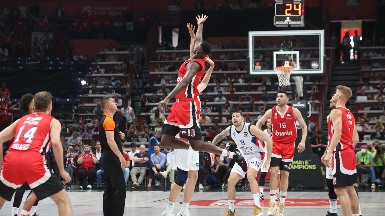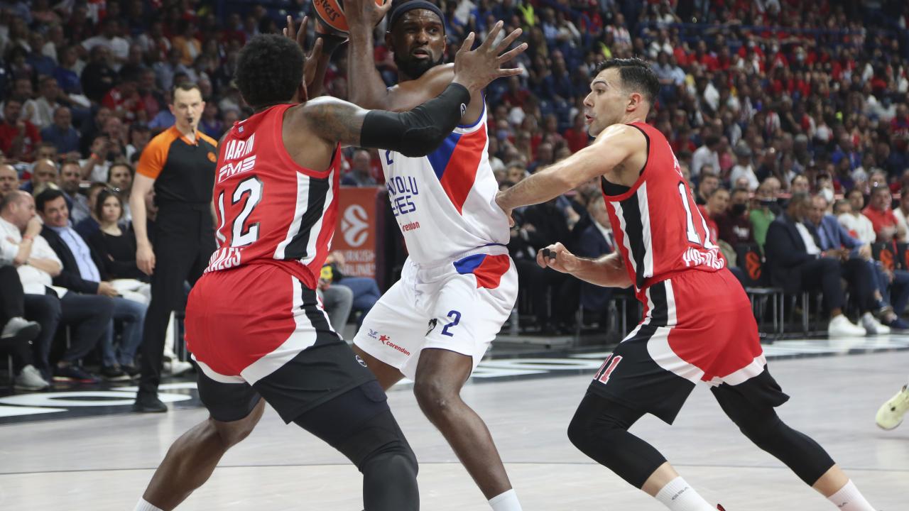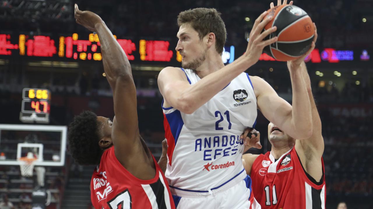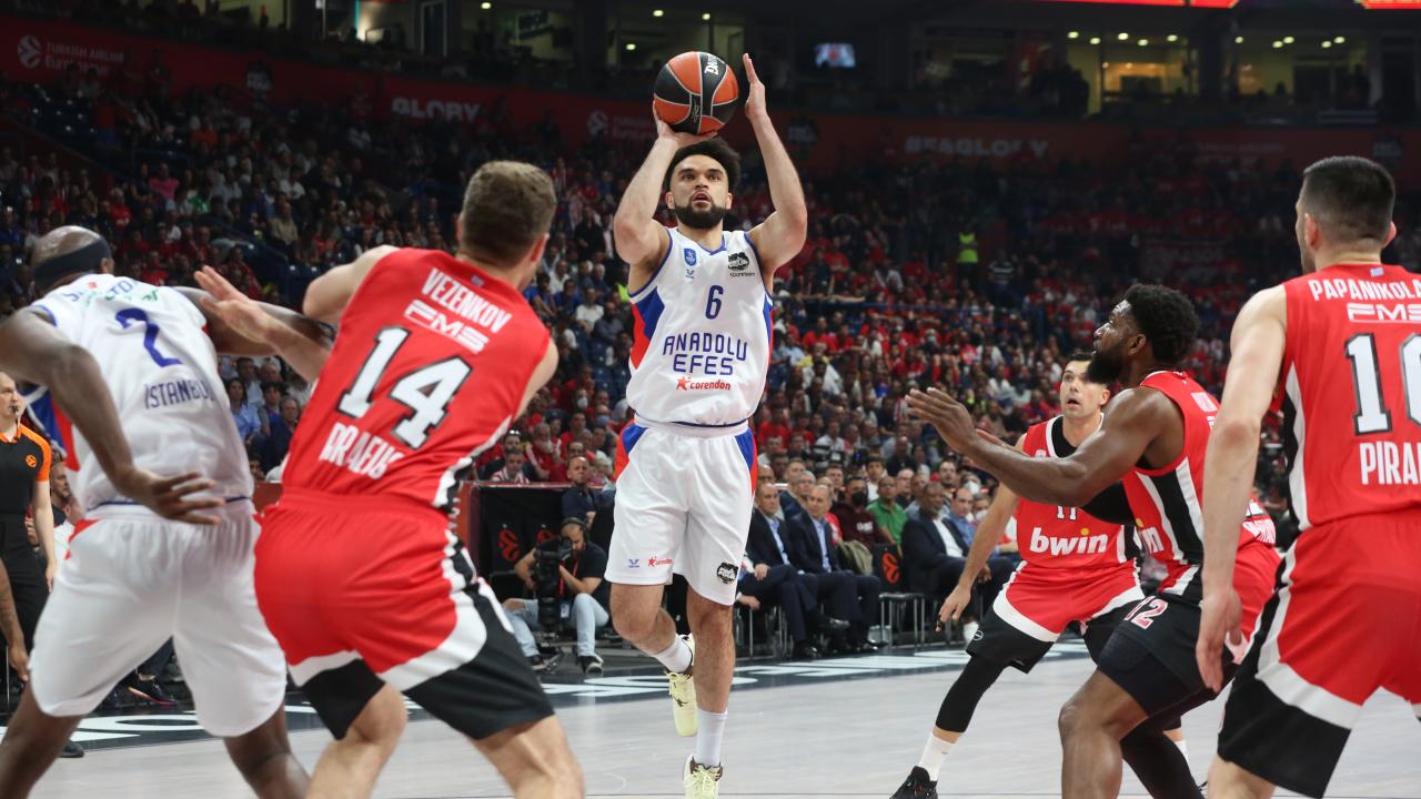 Üçüncü çeyreğe hızlı başlayan Anadolu Efes, Bryant`ın skorer oyunuyla 26. dakikada farkı çift hanelere taşıdı: 48-59. Çabuk toparlanan Olympiakos, Dorsey`nin 3 sayı çizgisinin gerisinden kaydettiği basketle bitime 4 saniye kala farkı 3`e indirmesine rağmen Anadolu Efes, final periyoduna 66-63 önde girdi.